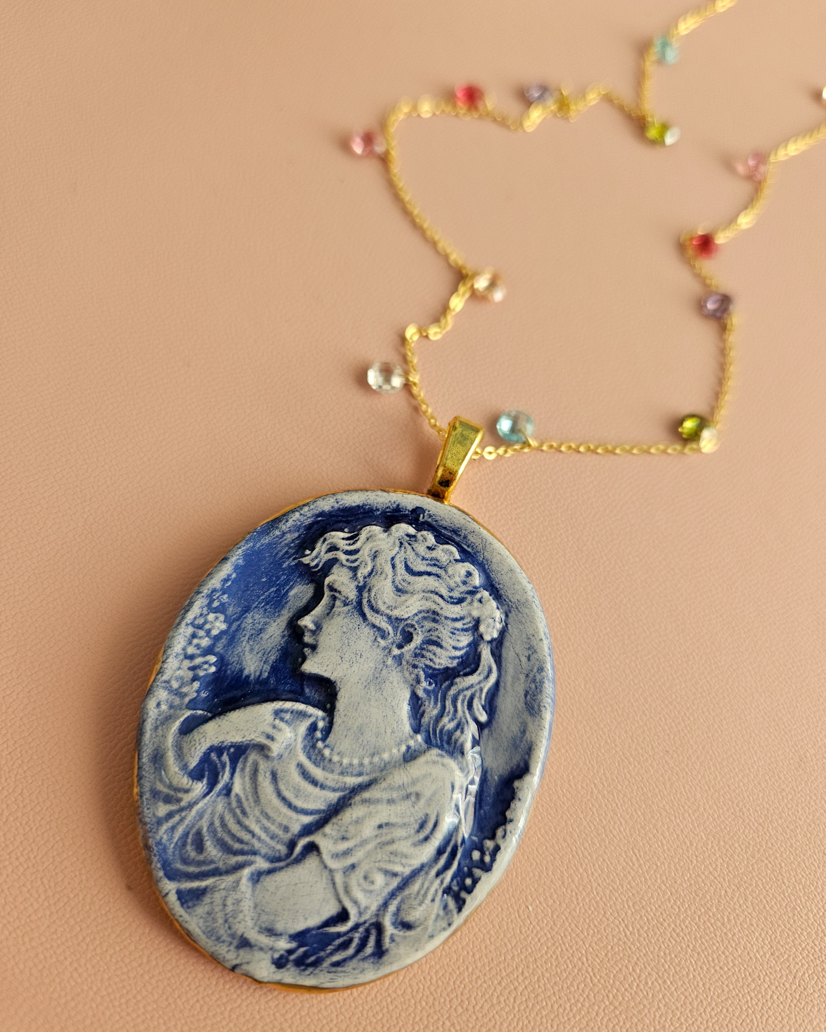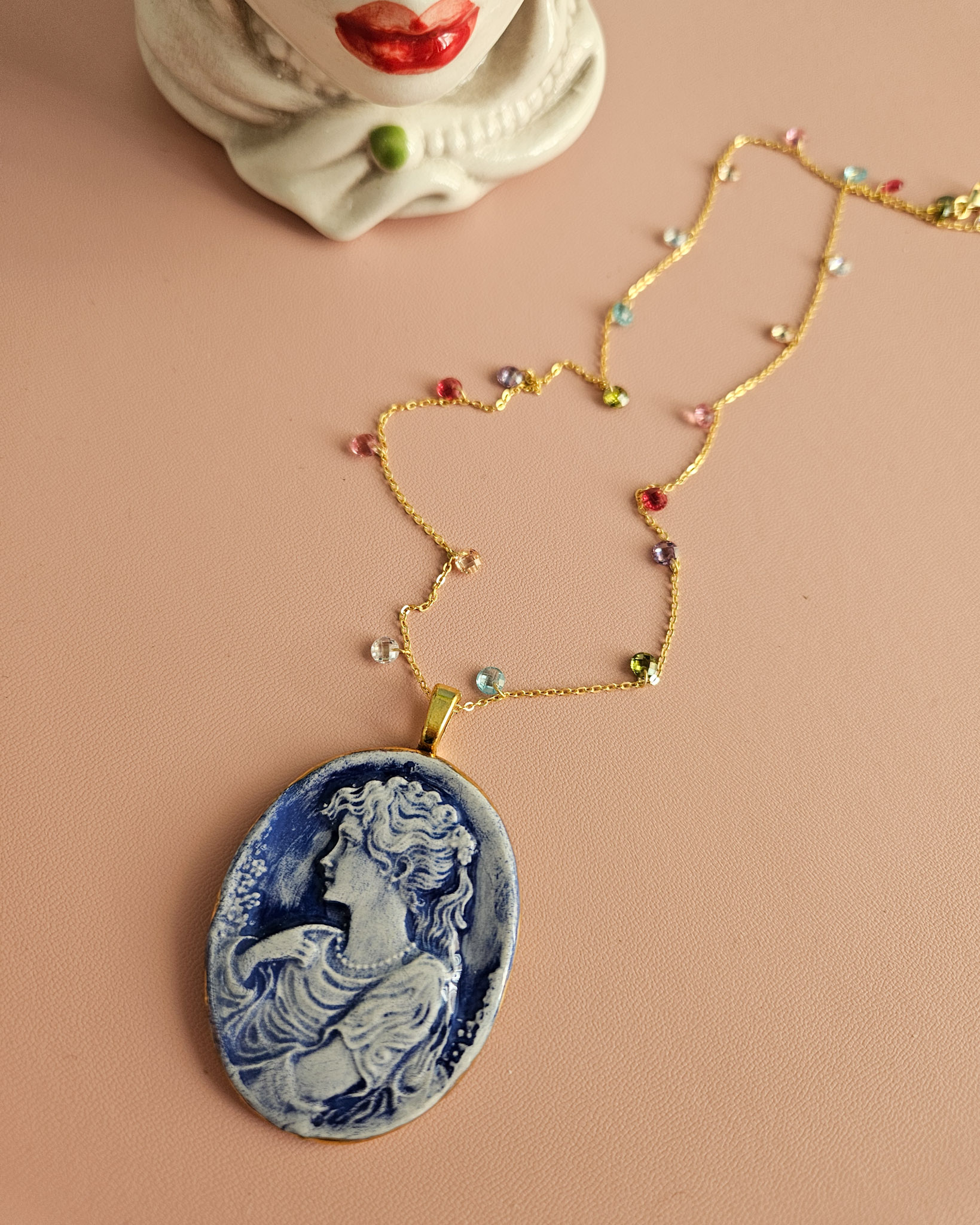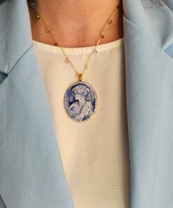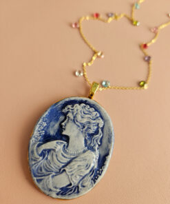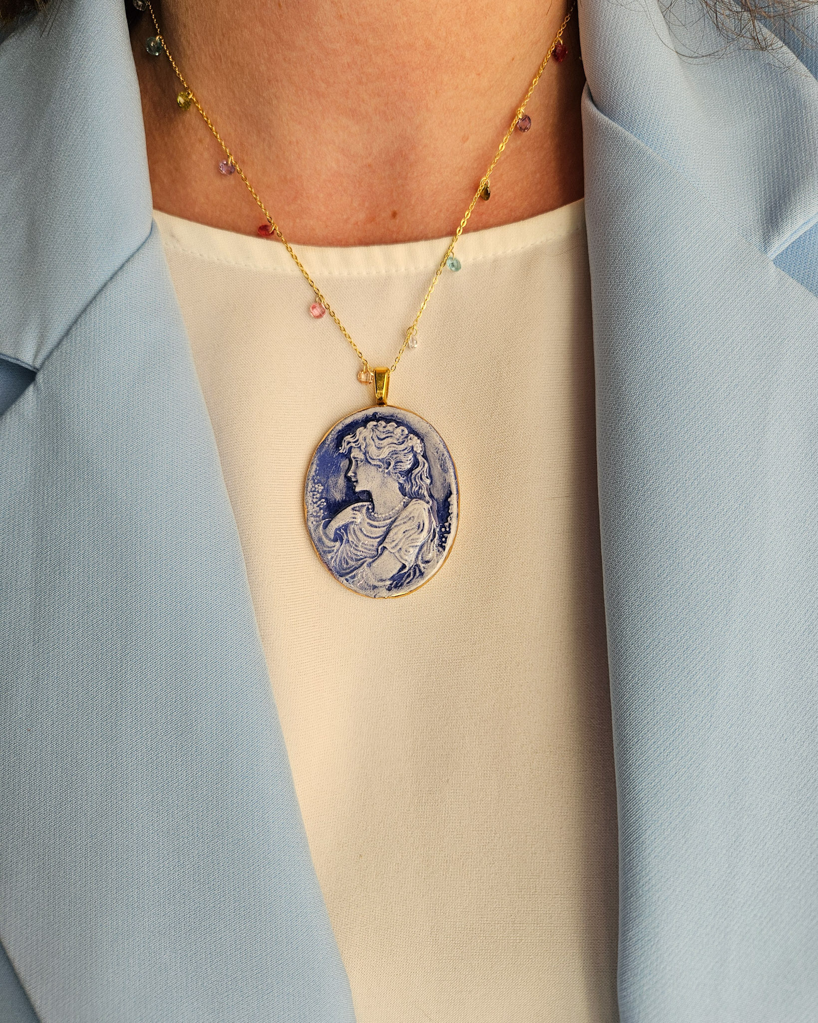 This delicate and luminous 925 silver chain is embellished with small colored zircons that add a touch of cheerfulness and lightness. At the center hangs an oval shaped ceramic cameo pendant with a sweet portrait motif in relief in shades of blue, framed by a golden border that makes it even more elegant. It is a romantic and refined piece of jewelry, perfect for those who love unique and timeless details.