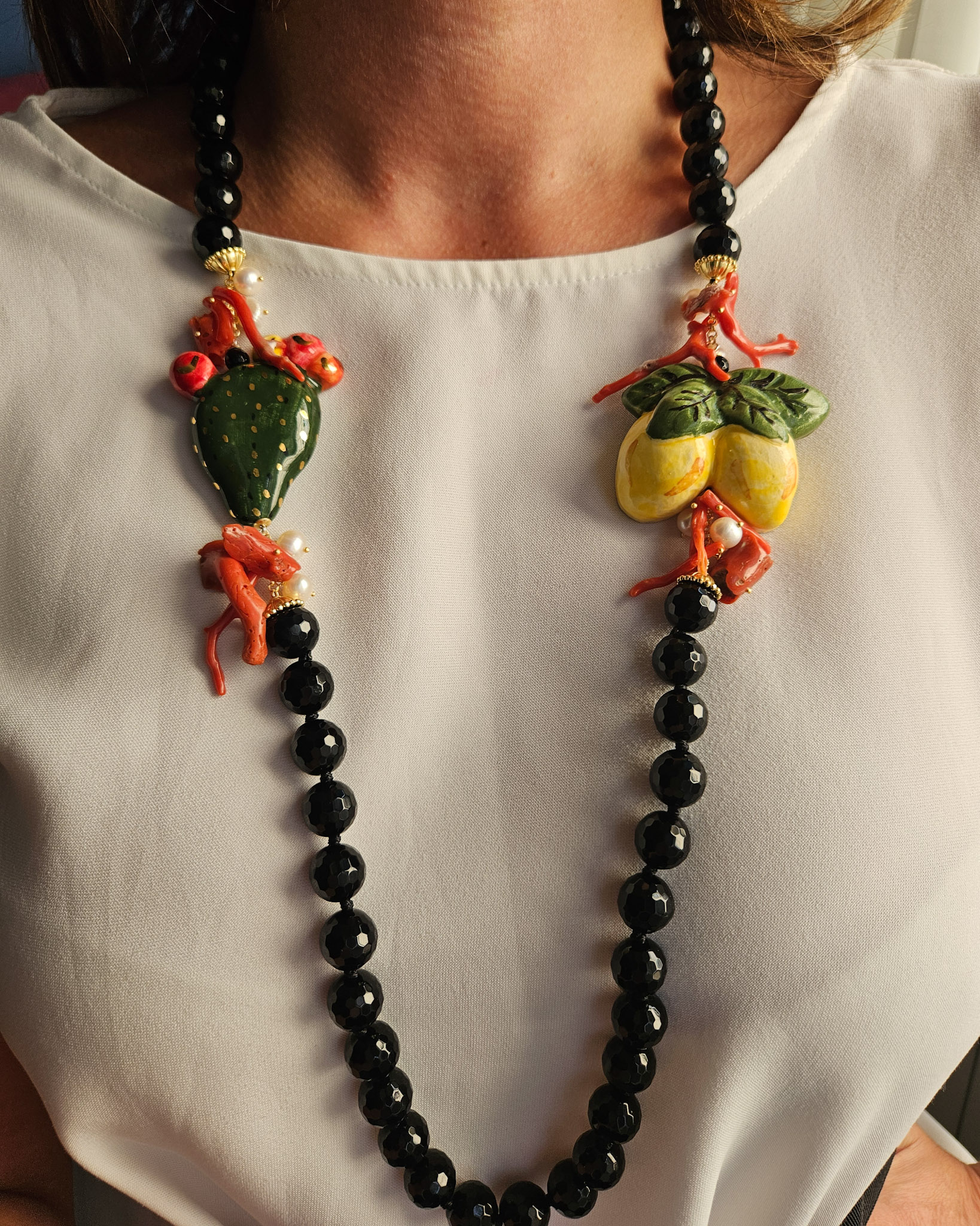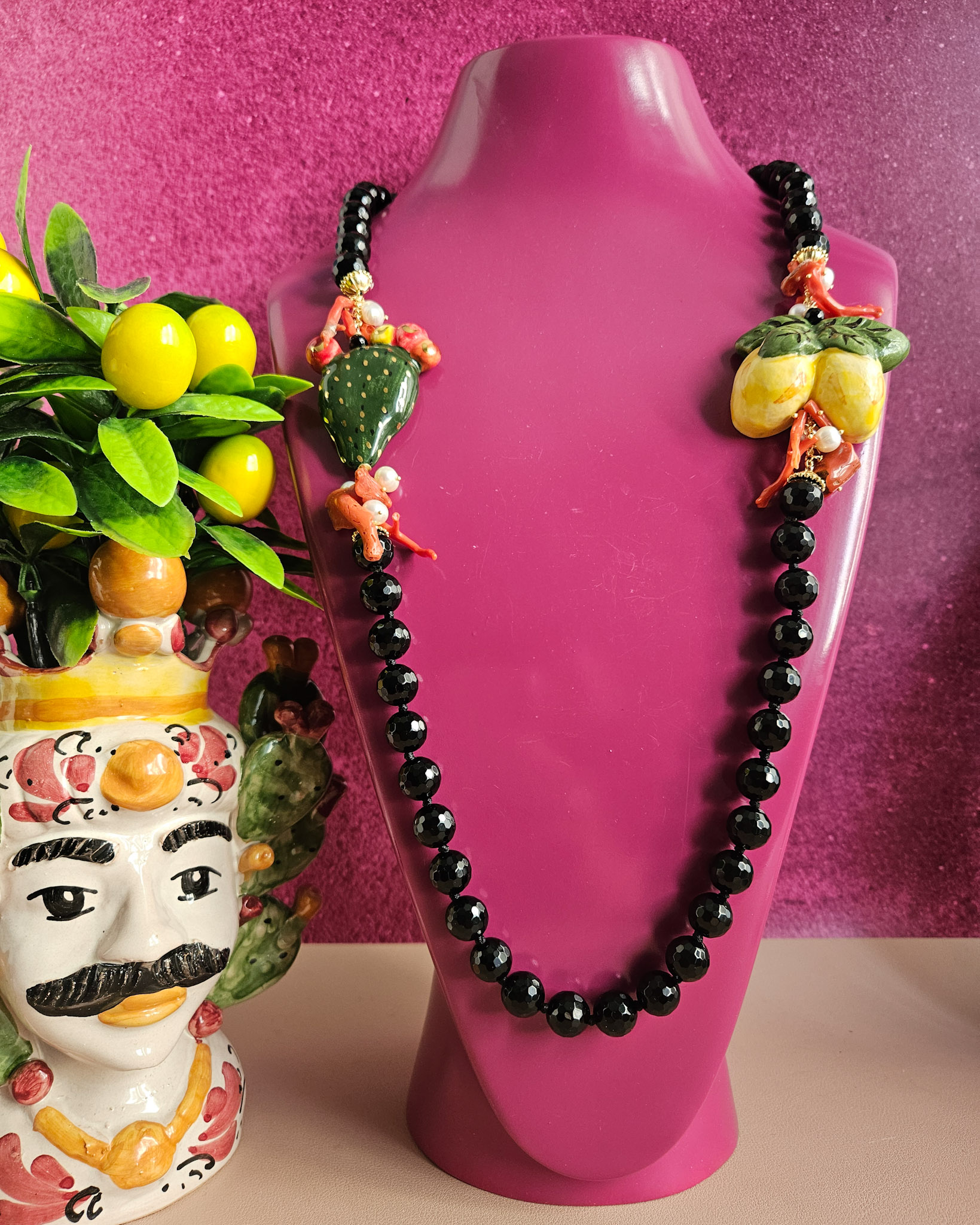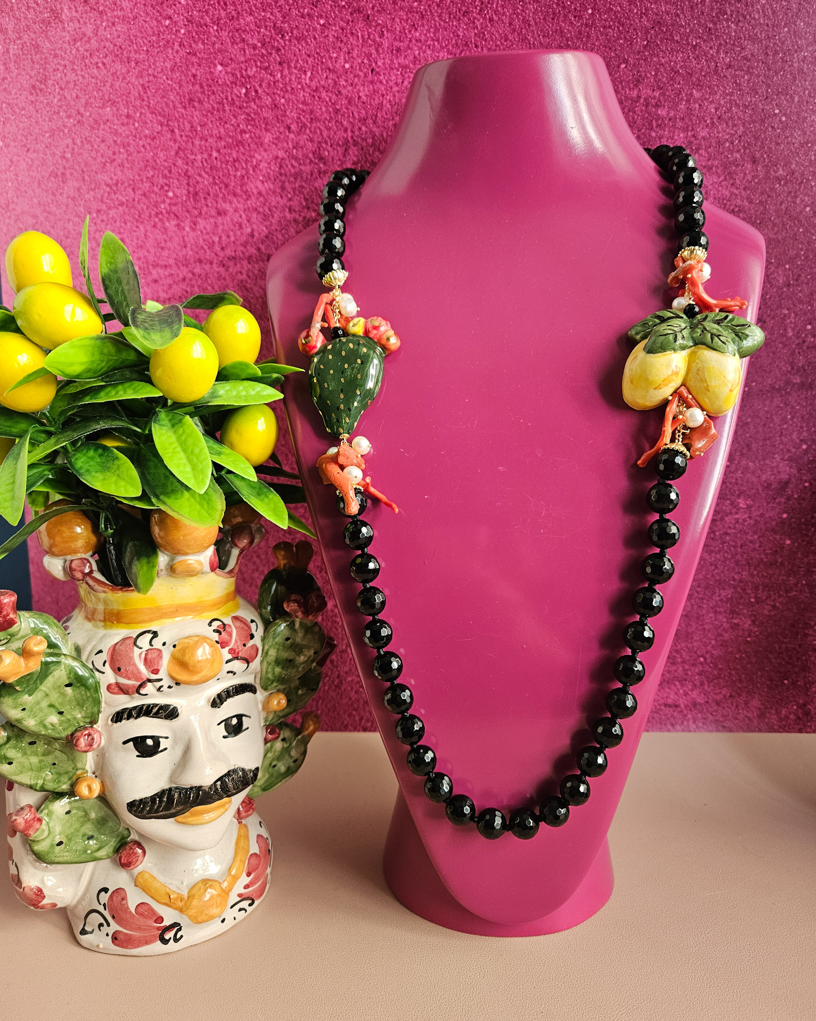 An all-Sicilian style for this wonderful necklace made with onyx stones, a stone of innate elegance, and two caltagirone ceramic elements, an undisputed symbol of Sicilianity, the lemon and the prickly pear.