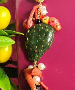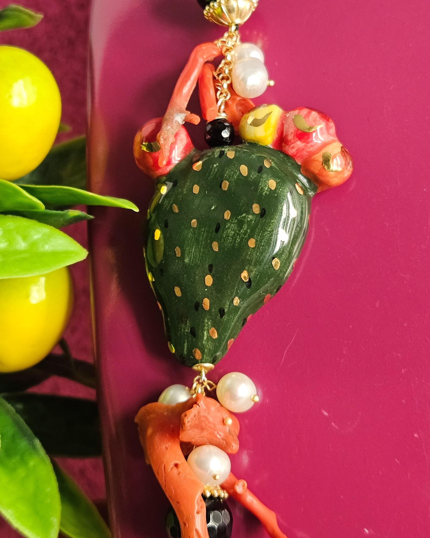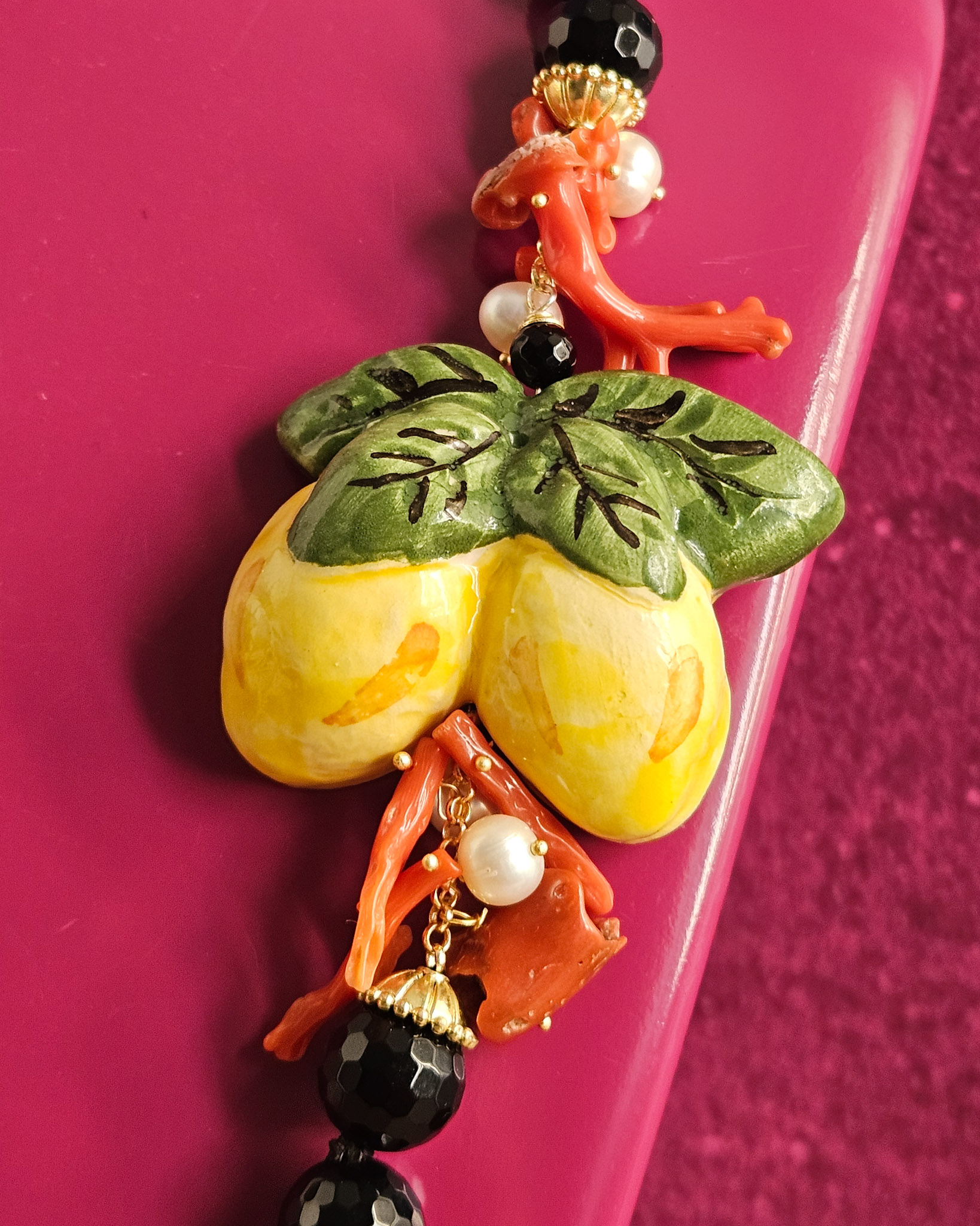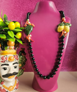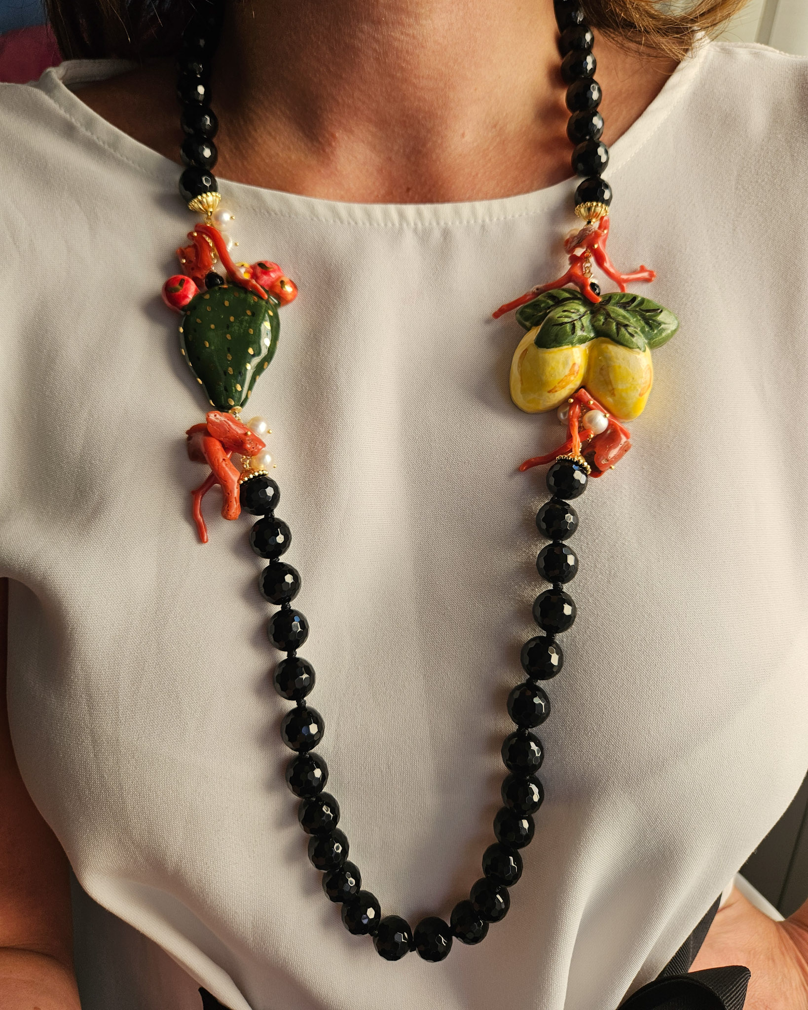 An all-Sicilian style for this wonderful necklace made with onyx stones, a stone of innate elegance, and two caltagirone ceramic elements, an undisputed symbol of Sicilianity, the lemon and the prickly pear.
