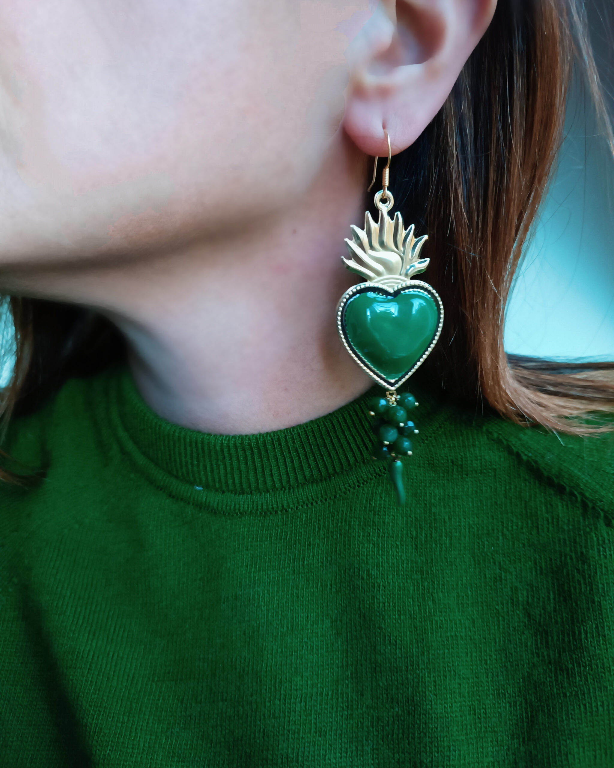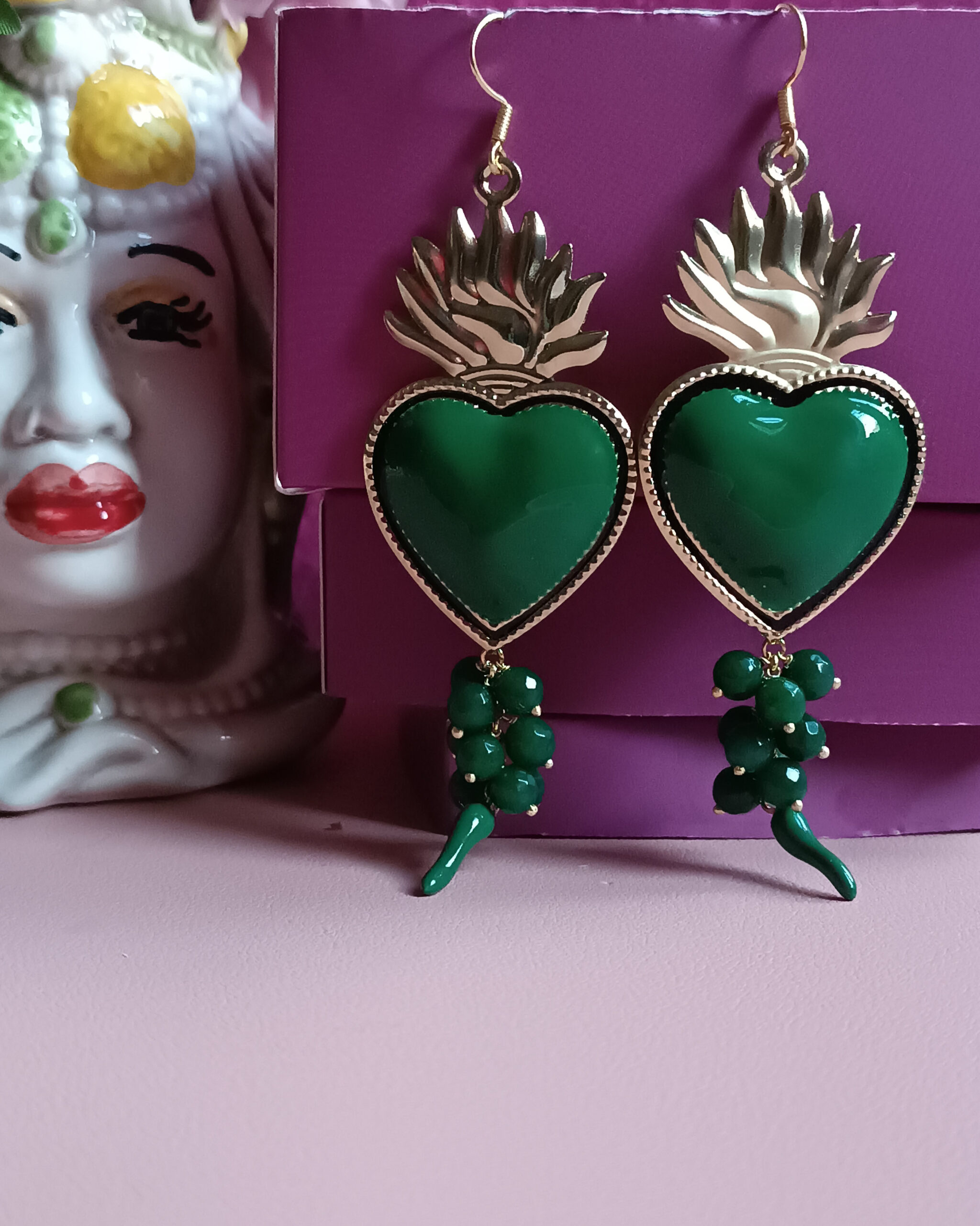 This model with green enameled sacred hearts are fashionable and original, they will beautify your face giving an ethnic and even a bit gypsy note to your looks.