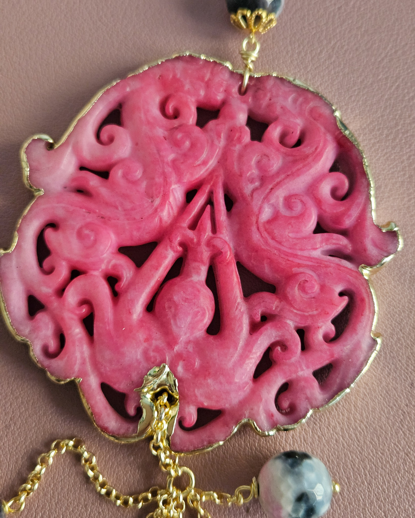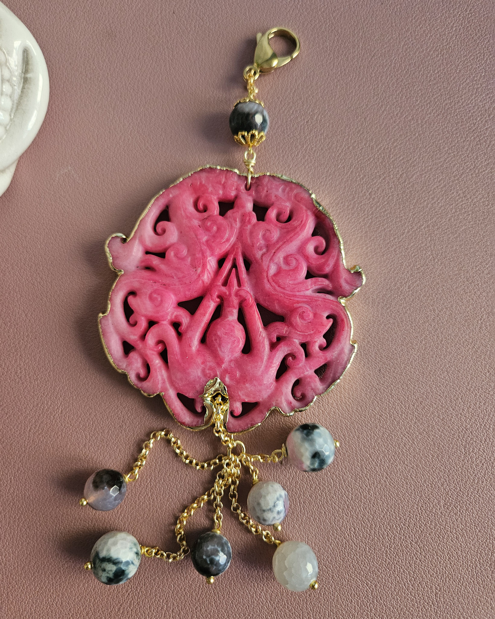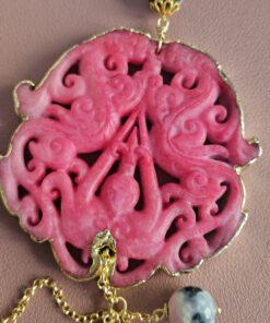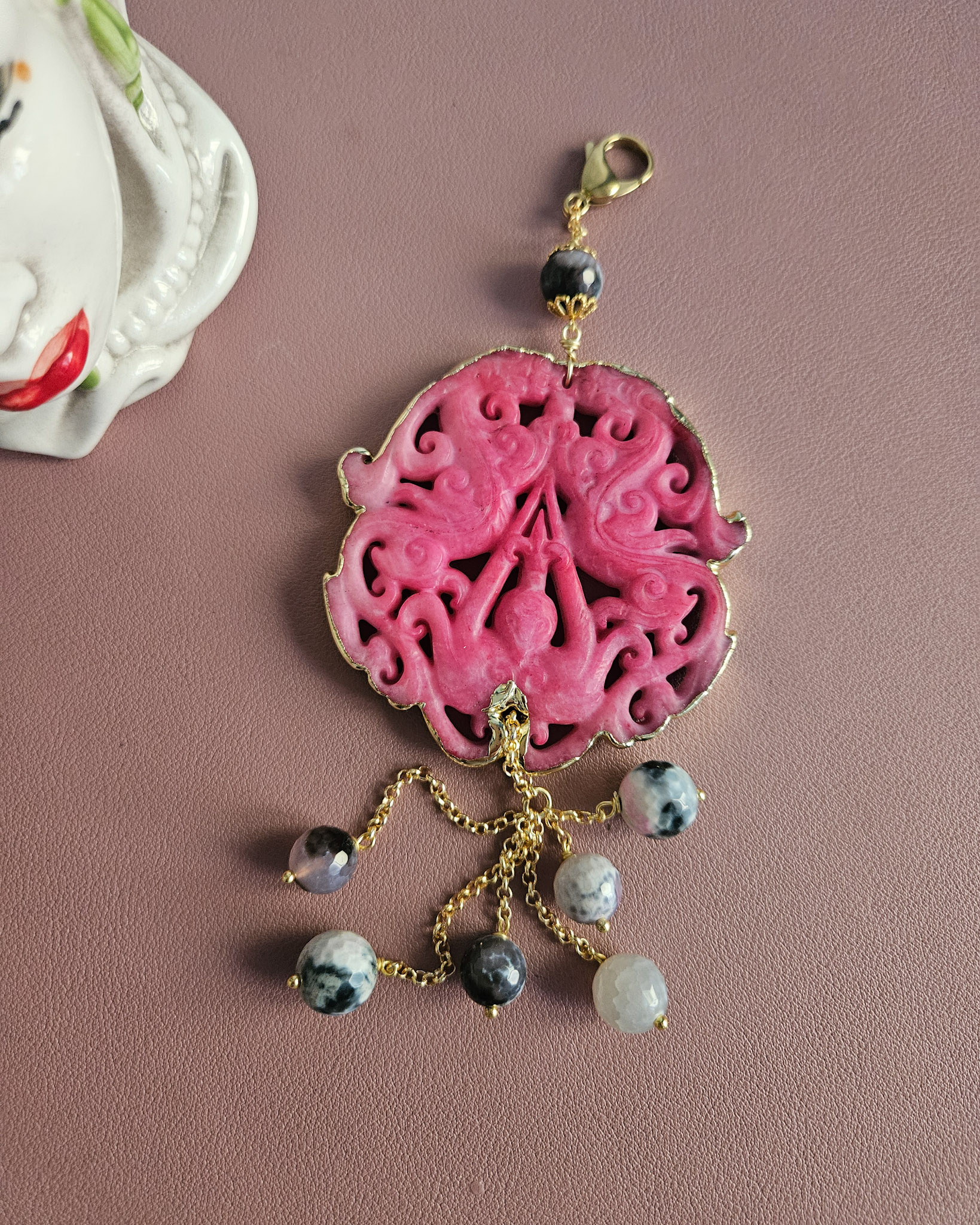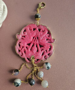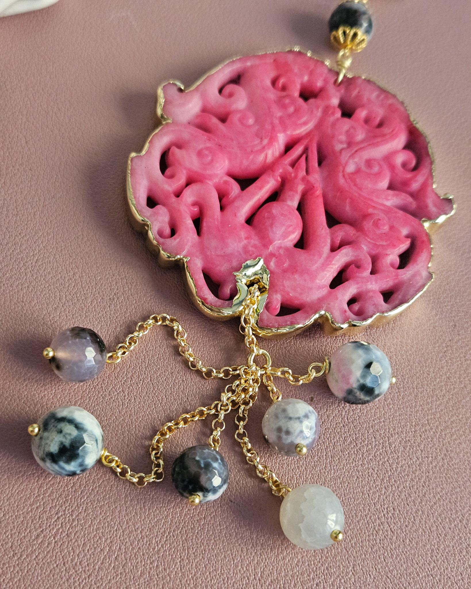 The pendant is made of hand-carved natural jade and is embellished with a chain and natural hard stones.