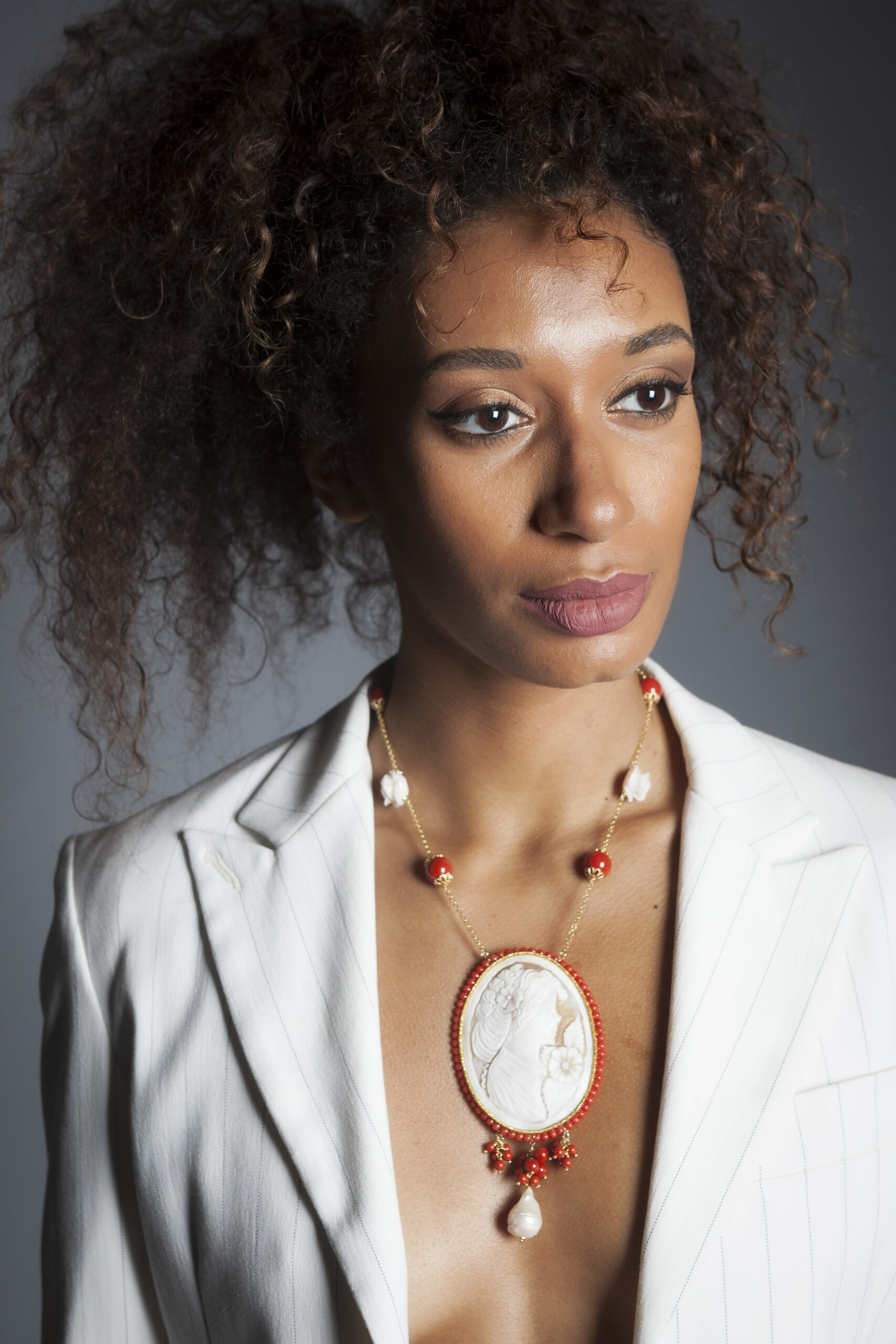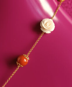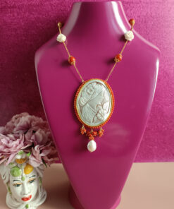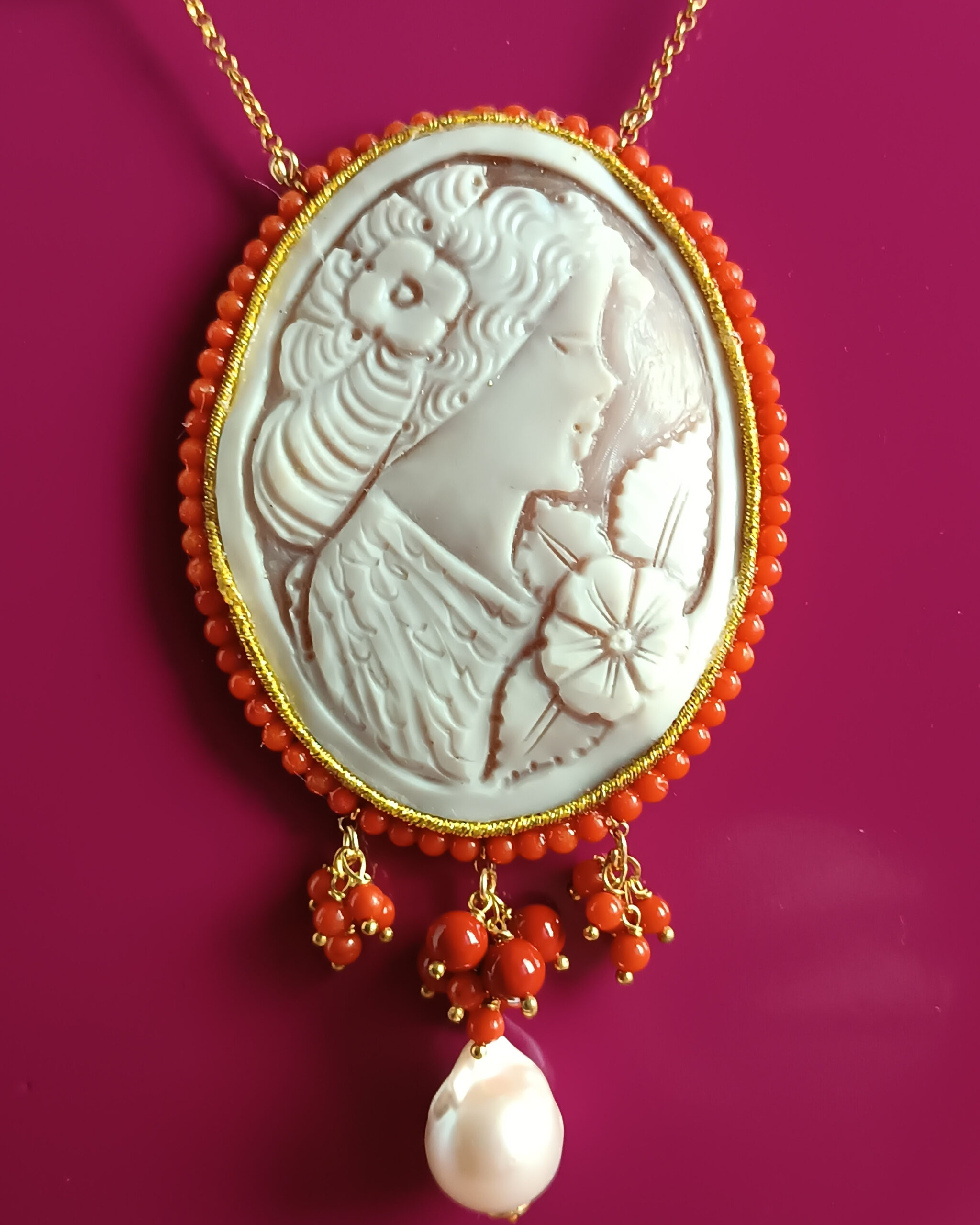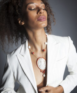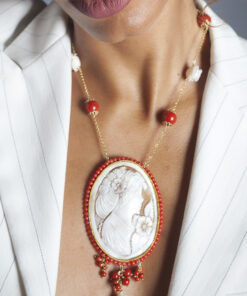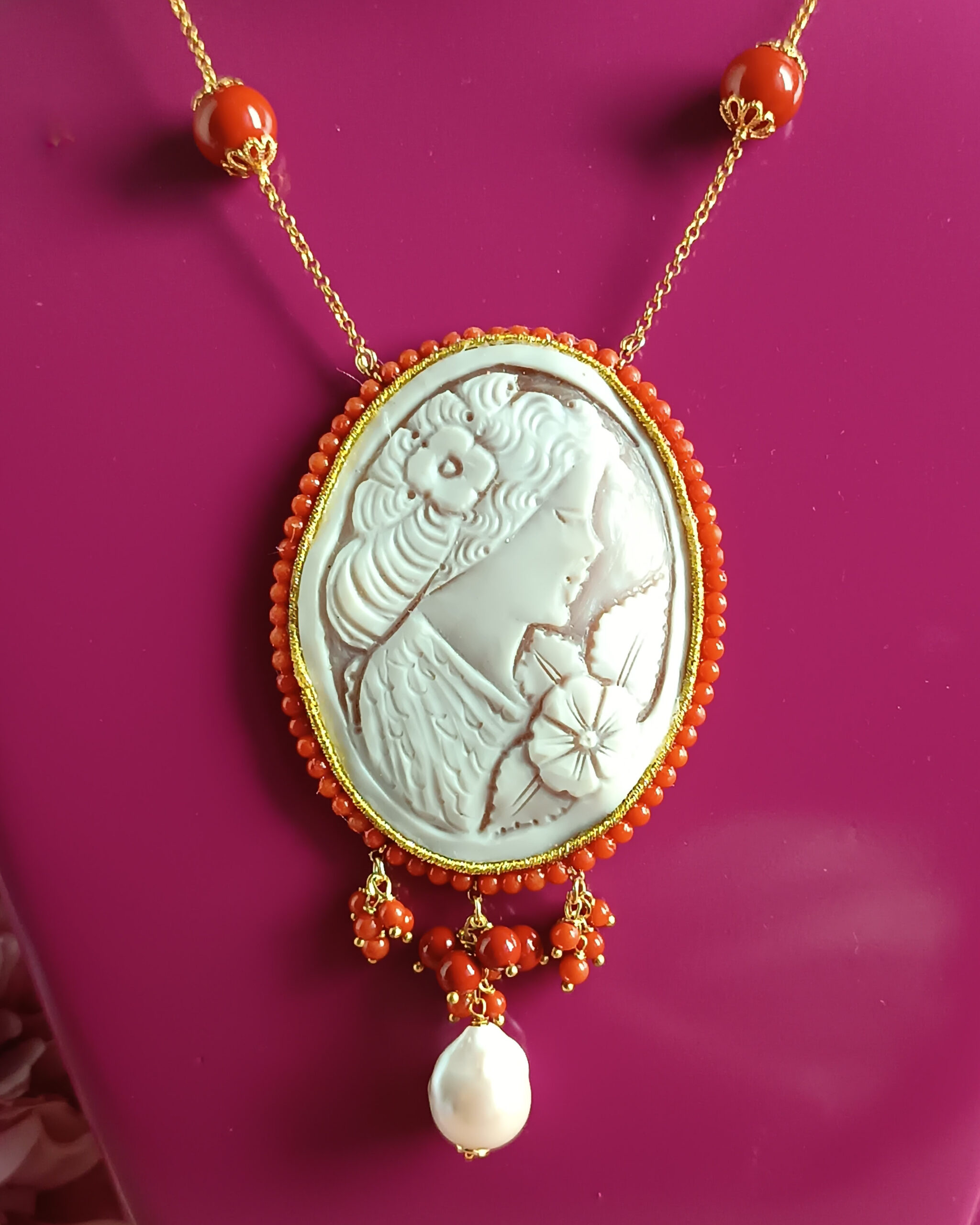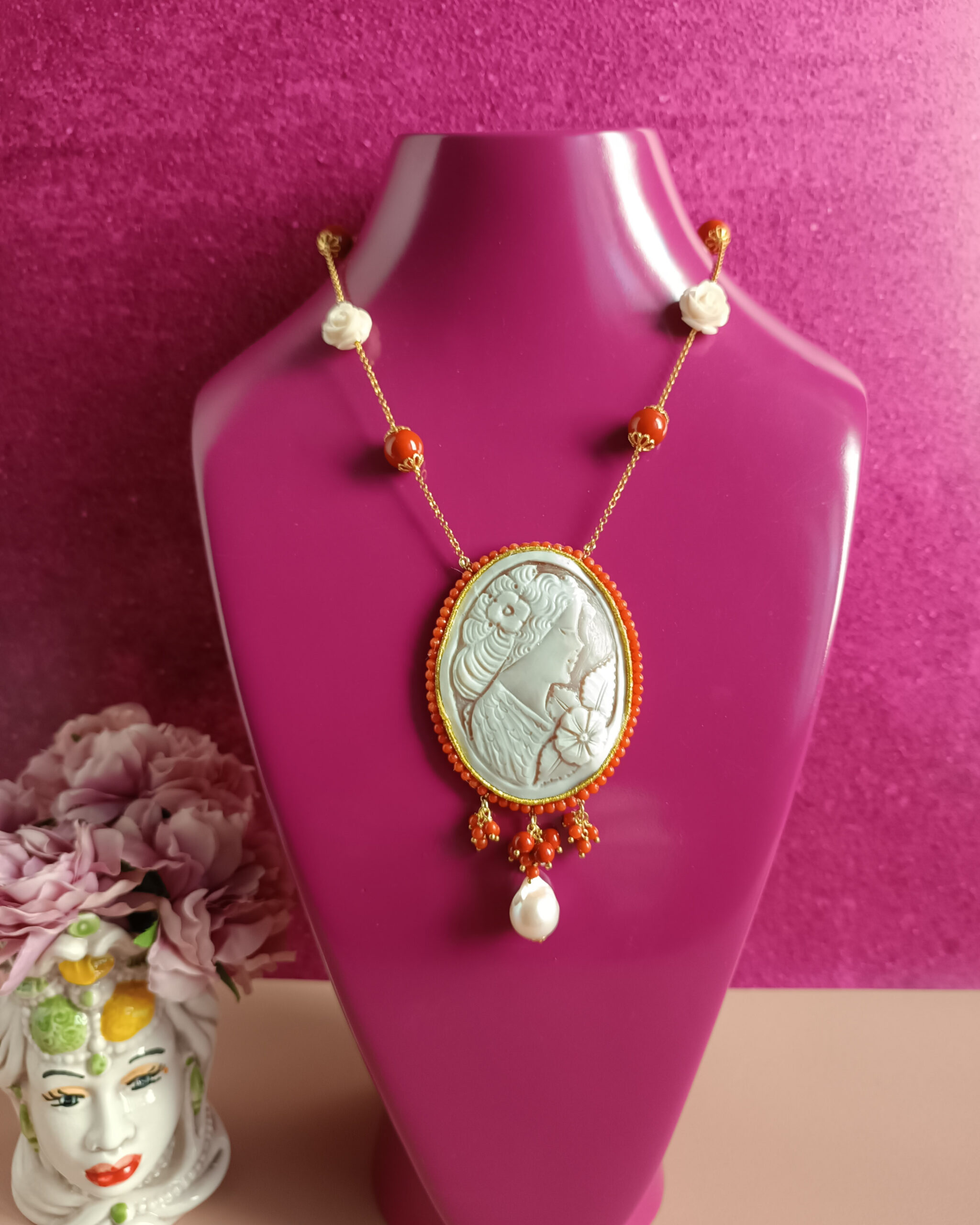 Delicate necklace made with red maiorca, white roses and authentic cameo from Torre del Greco.
