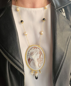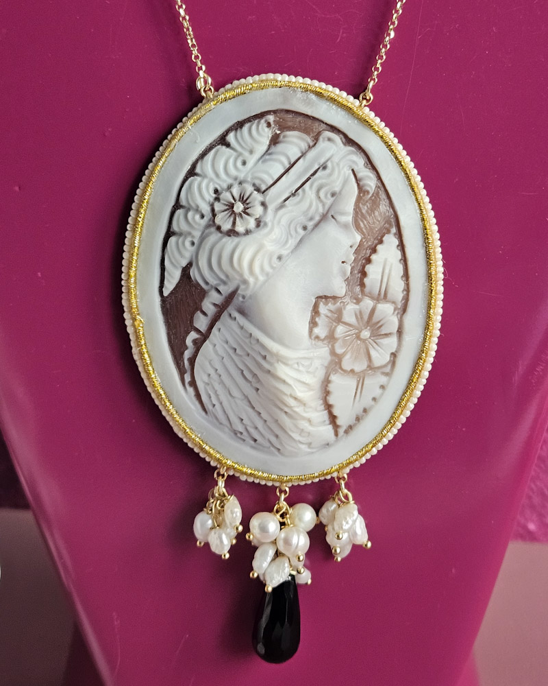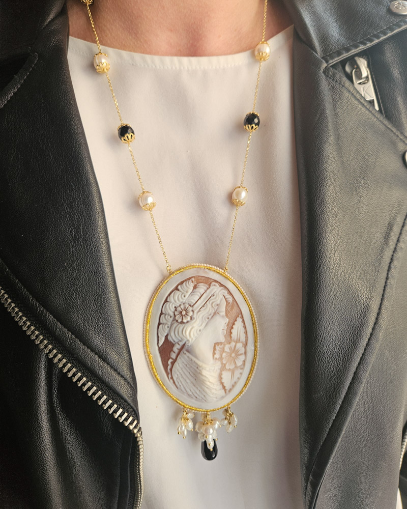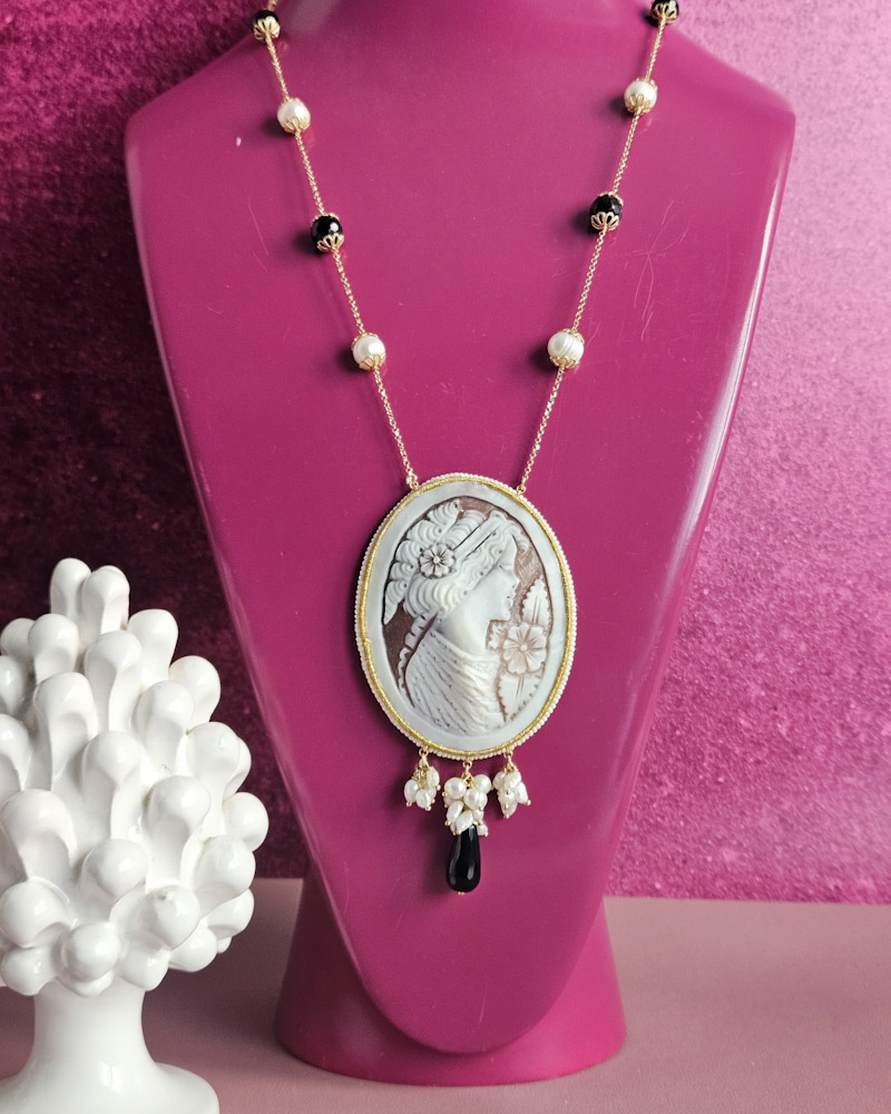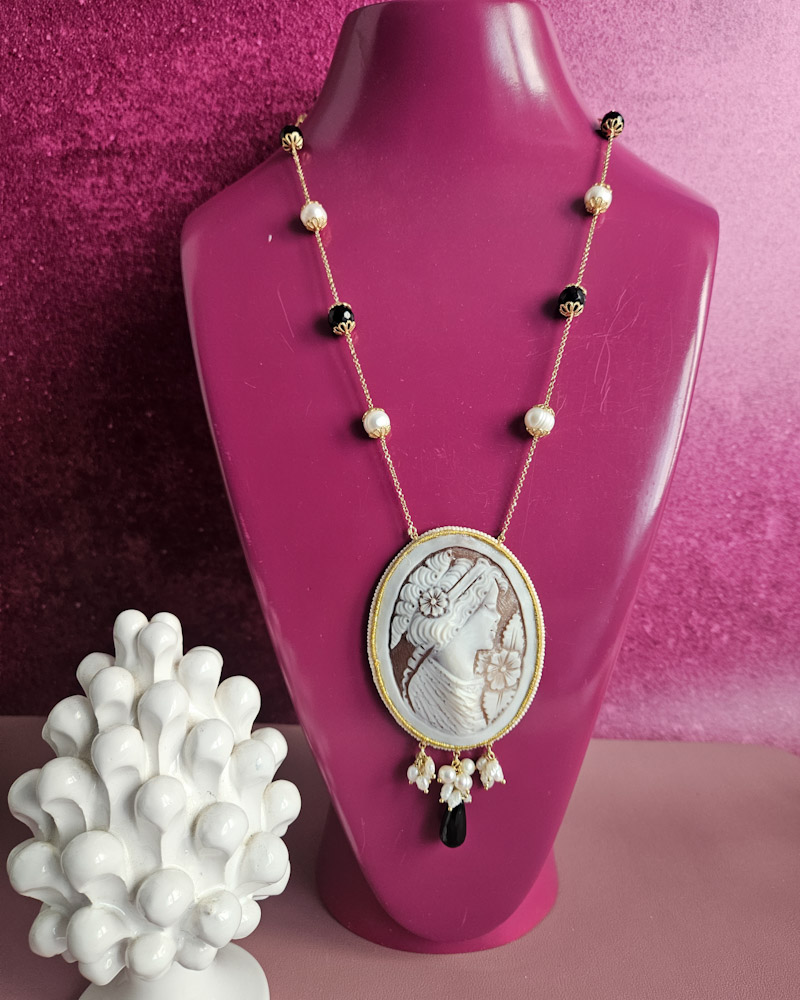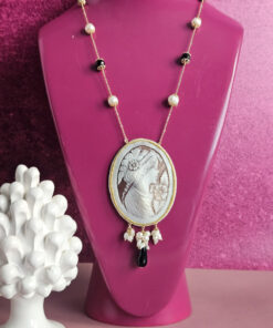 Delicate necklace made with river pearls, onyx and authentic cameo from Torre del Greco.