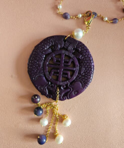 The pendant is made of hand-carved natural jade and is embellished with the same stones as the chain.