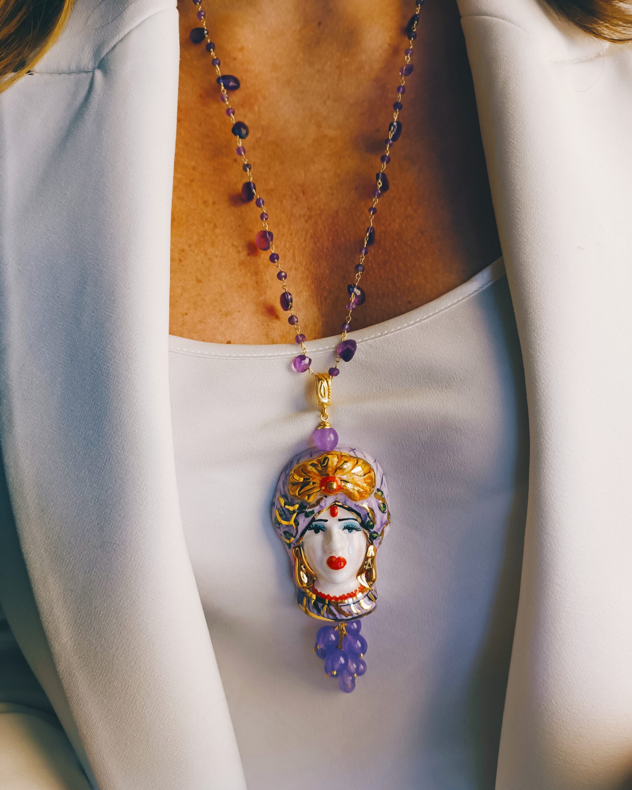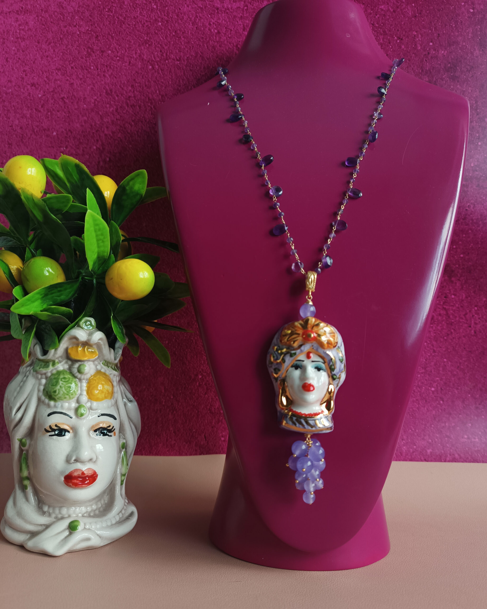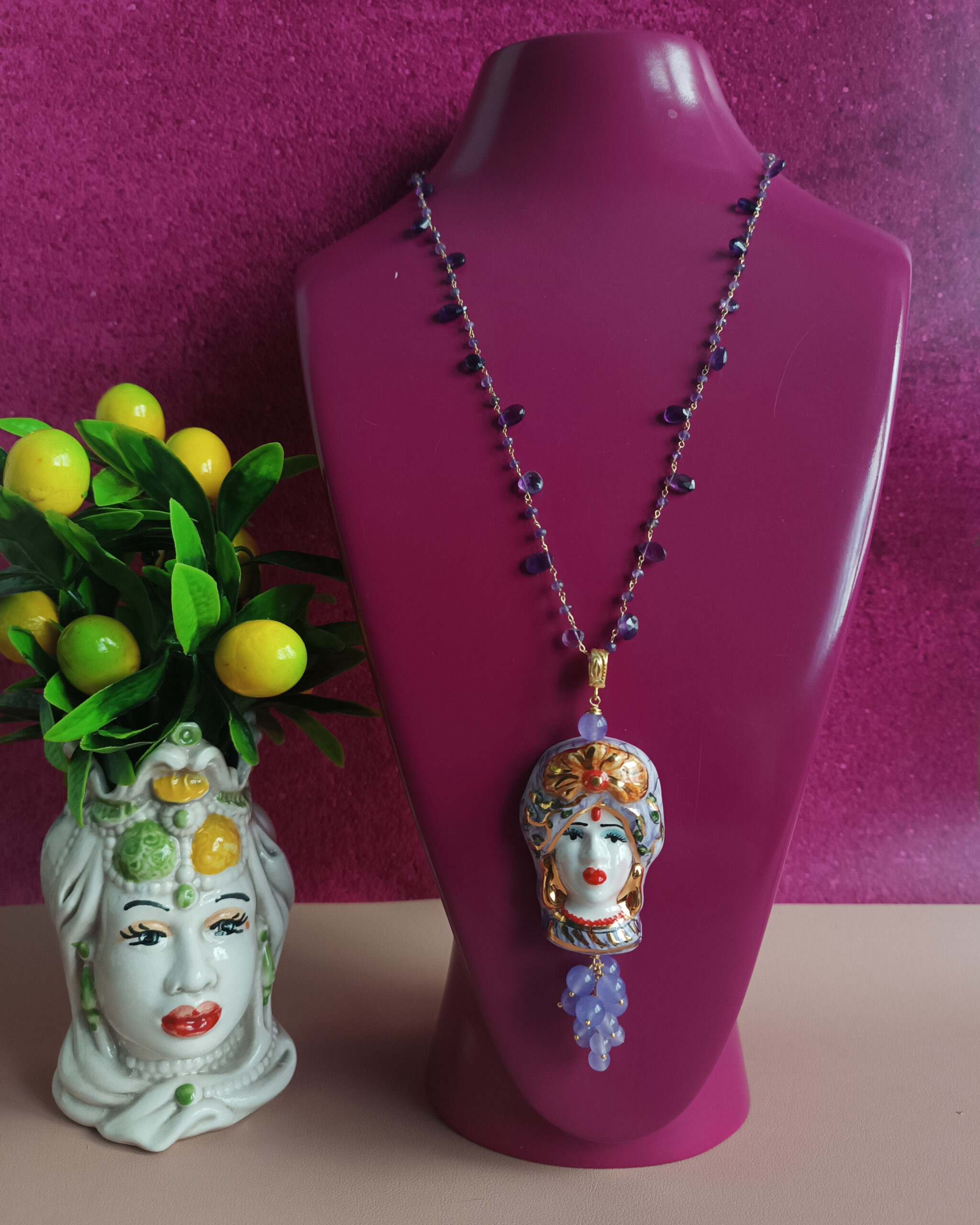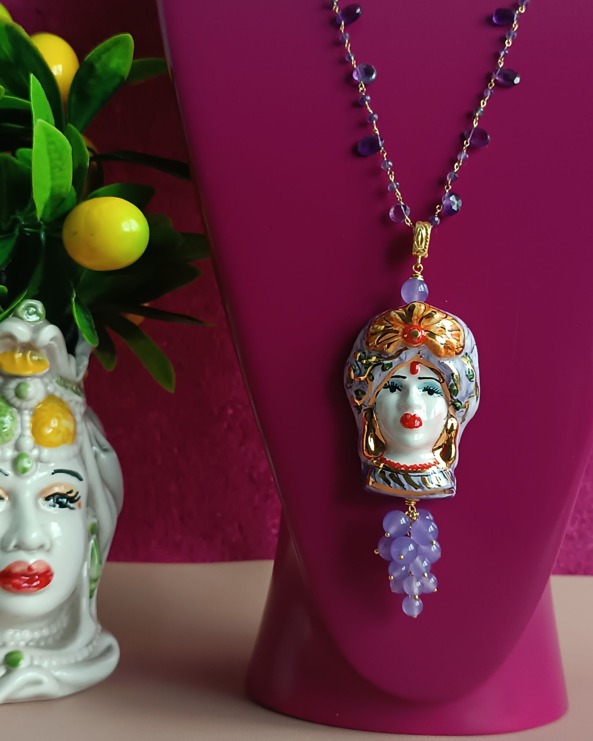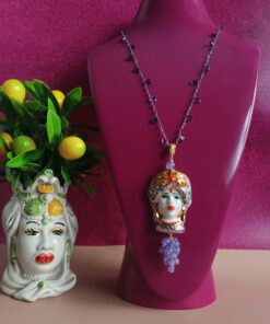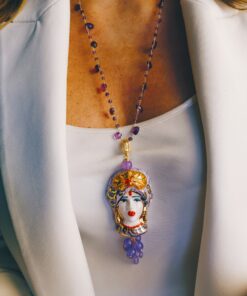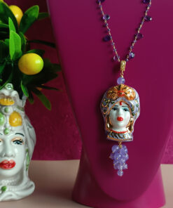 A beautiful pendant, made with a Sicilian woman’s head in Caltagirone Ceramics and cluster of purple stones.