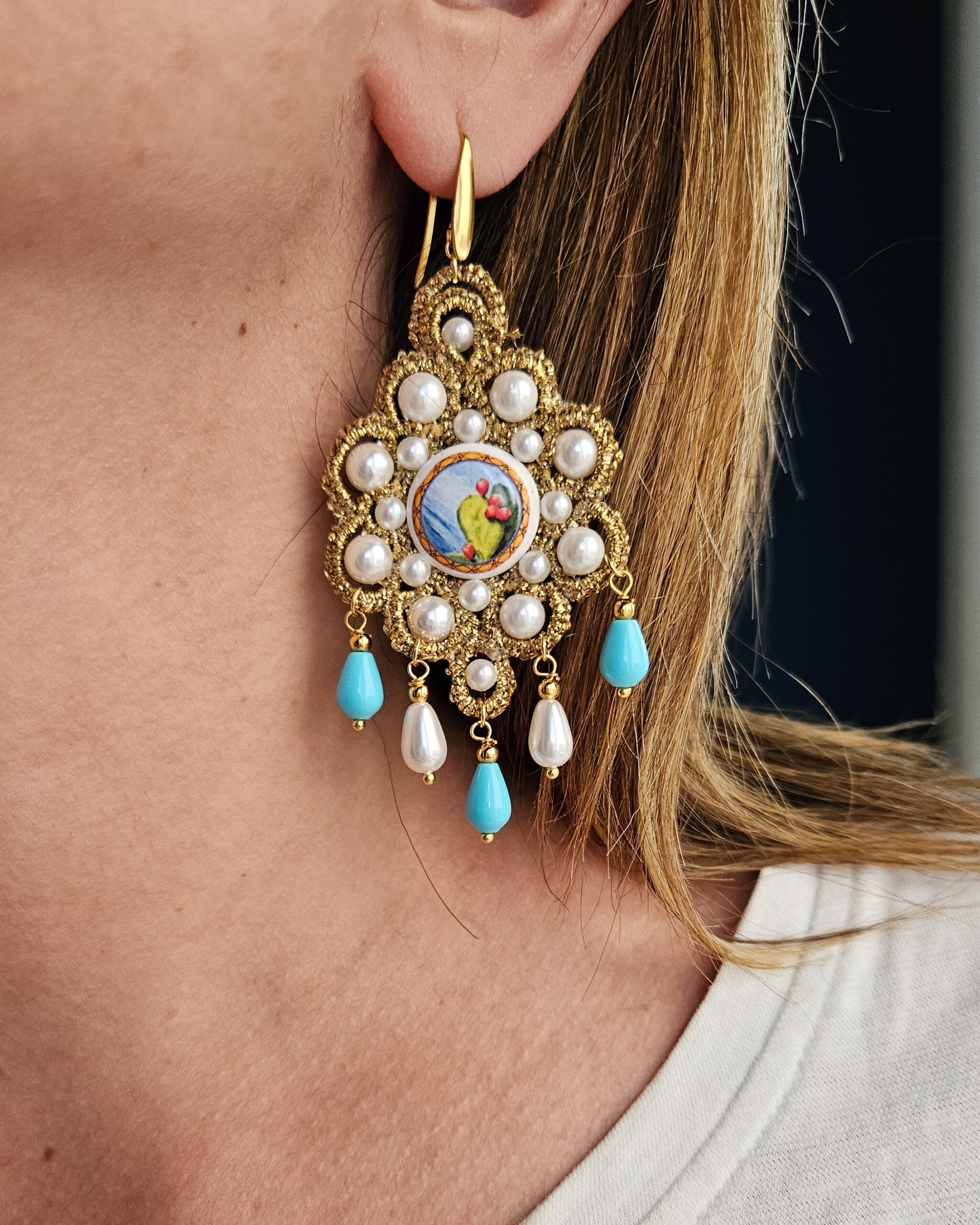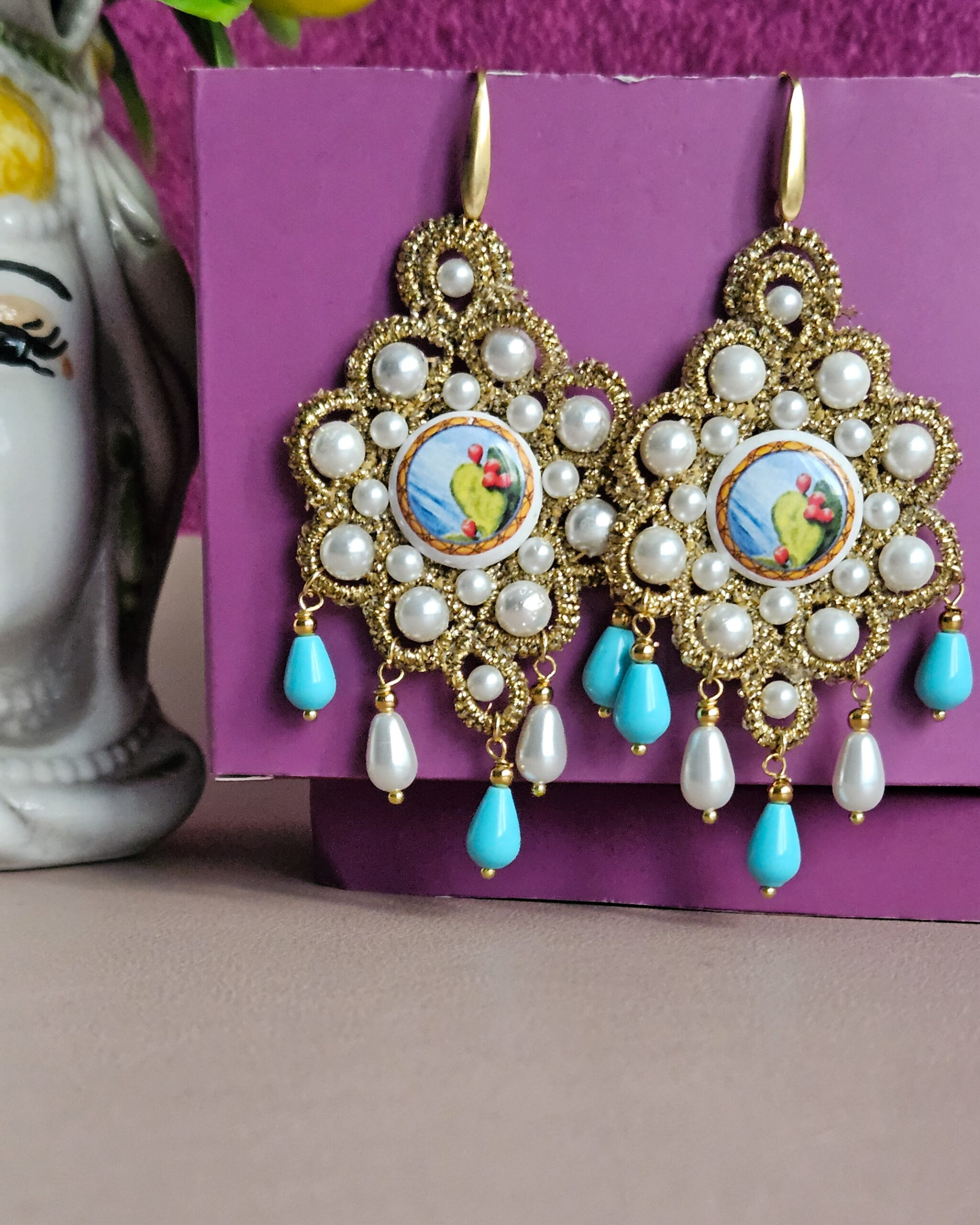 Chiaccherino Lace Earrings with Pearls and Ceramic Tiles
