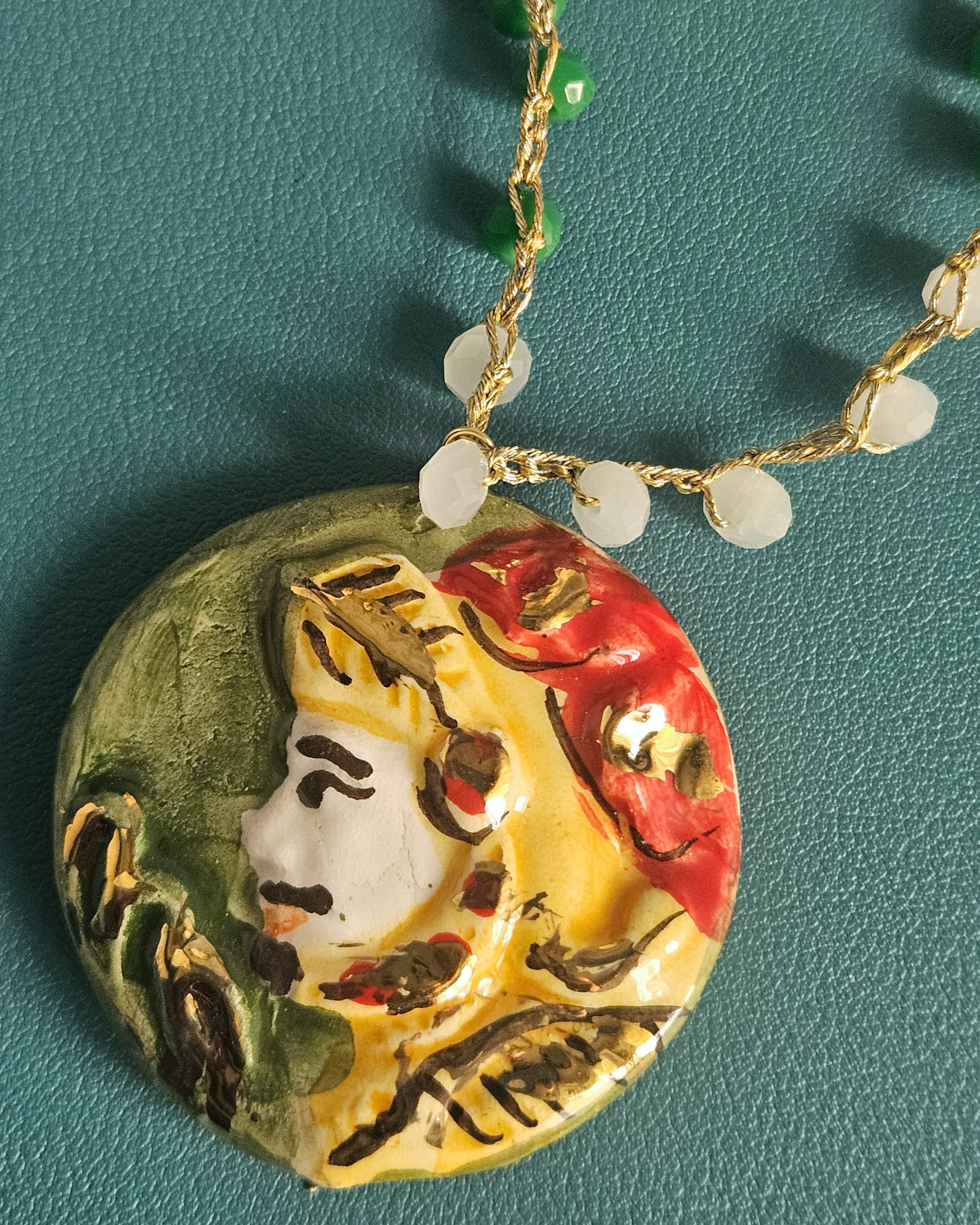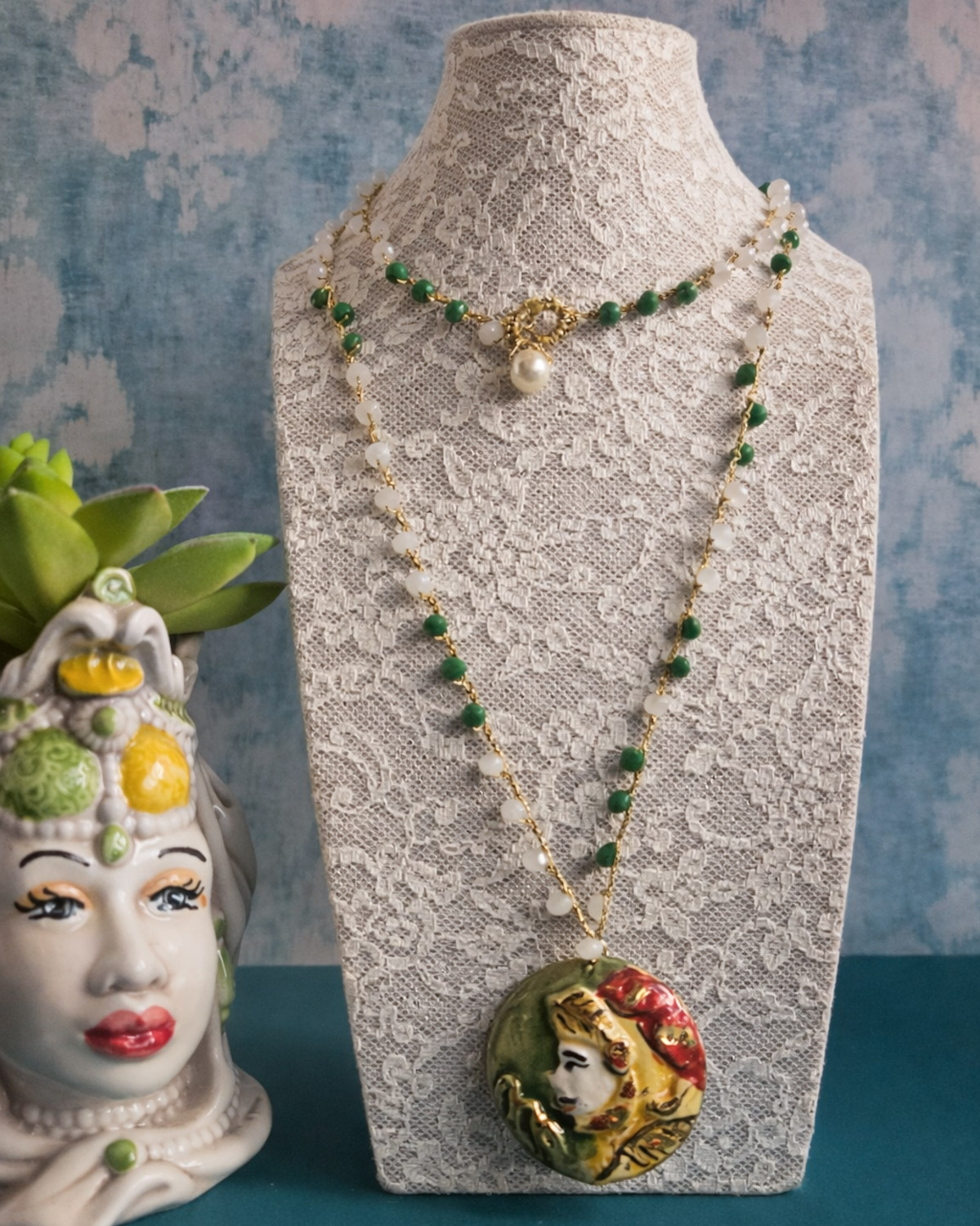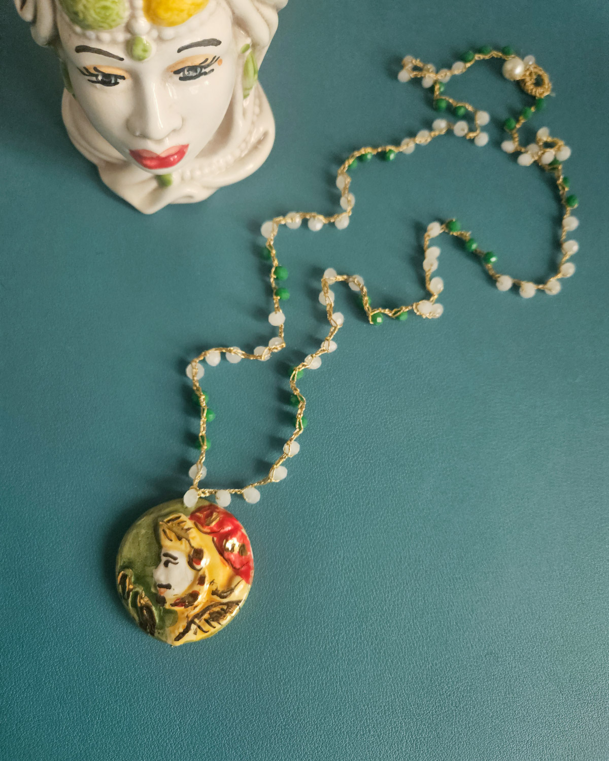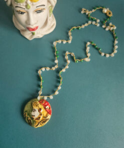 Crochet Necklace with Pink and Green Crystals and a Caltagirone Ceramic Knight