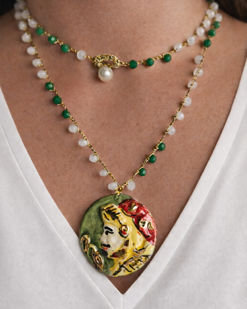 It’s a necklace that truly works with everything: simple tops, open shirts, V-necklines. Just put it on and it instantly adds personality to even the most basic outfit.