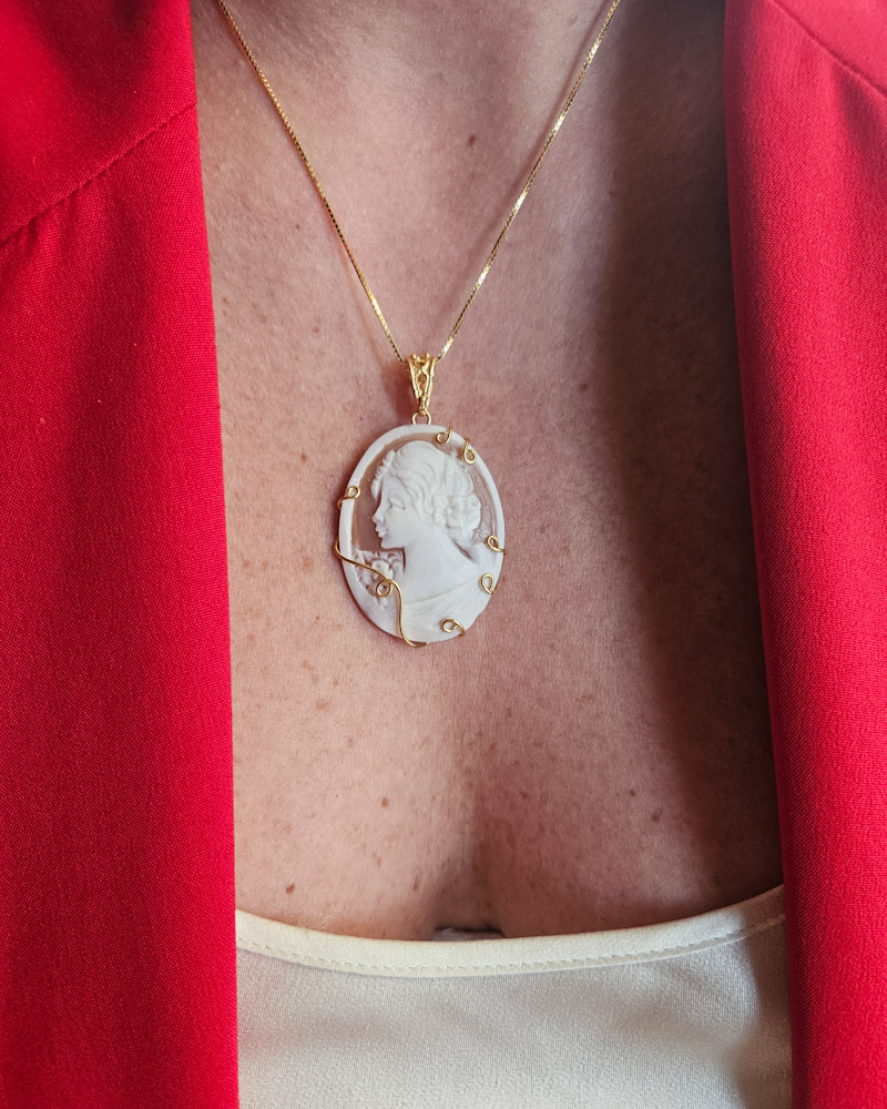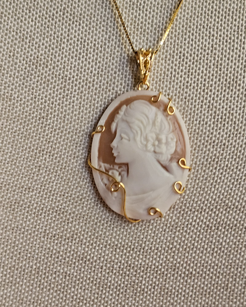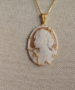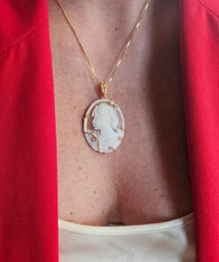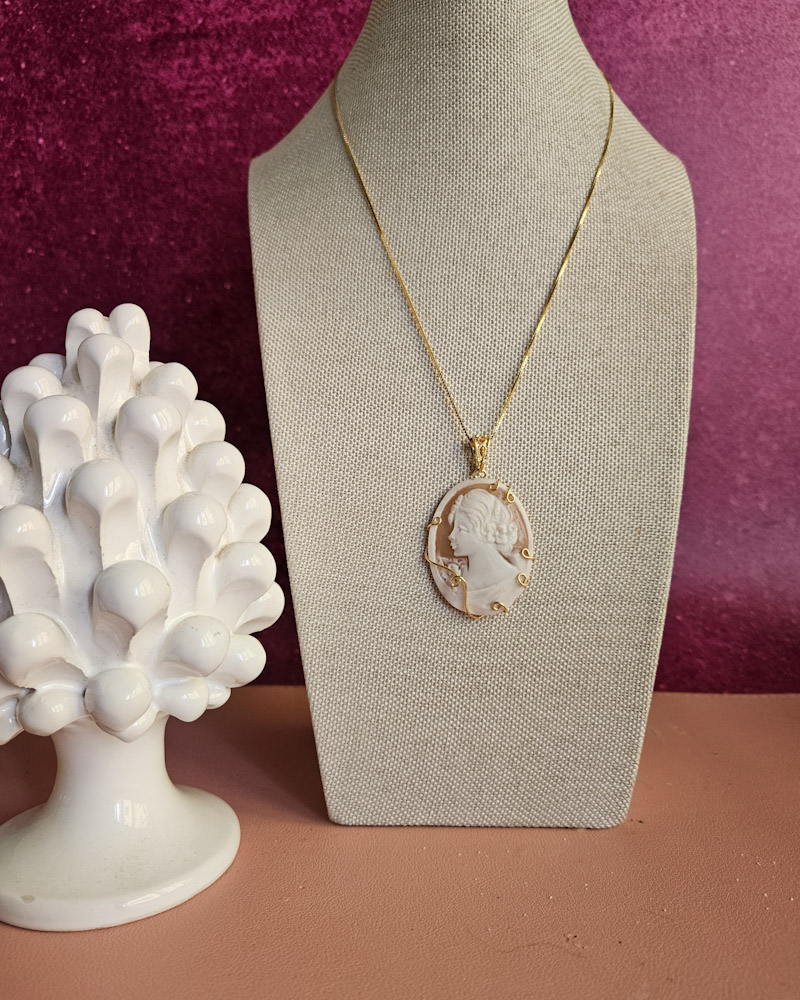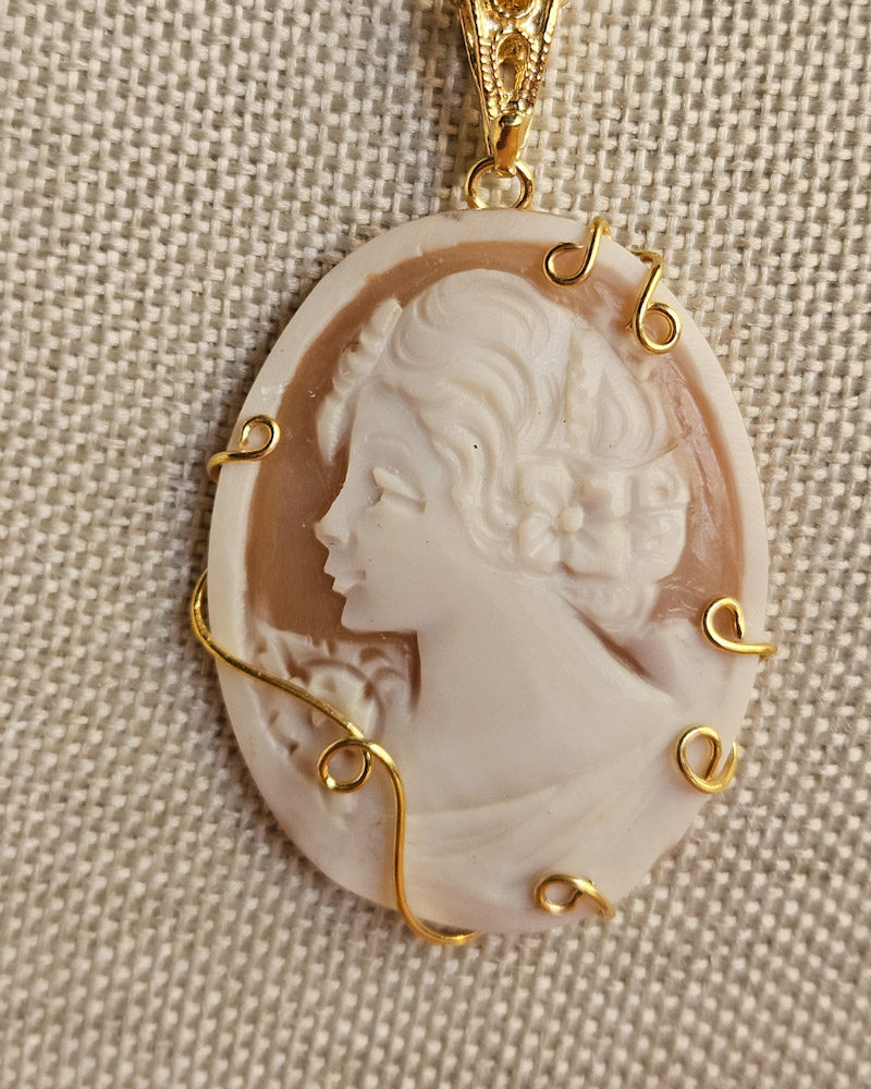 A jewel of rare beauty: Gold plated 925 Sterling Silver chain and an authentic cameo pendant. A skillful relief carving depicts a portrait of a woman, rich in finely delineated details, which is breathtaking in its precision and beauty