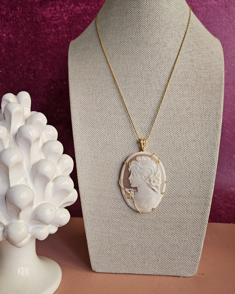 A jewel of rare beauty: Gold plated 925 Sterling Silver chain and an authentic cameo pendant. A skillful relief carving depicts a portrait of a woman, rich in finely delineated details, which is breathtaking in its precision and beauty