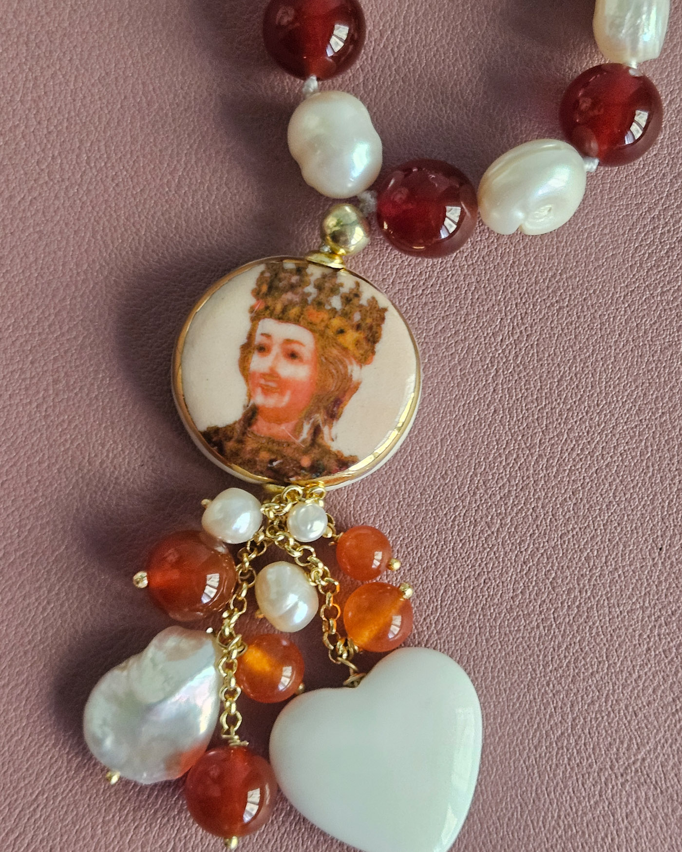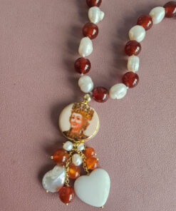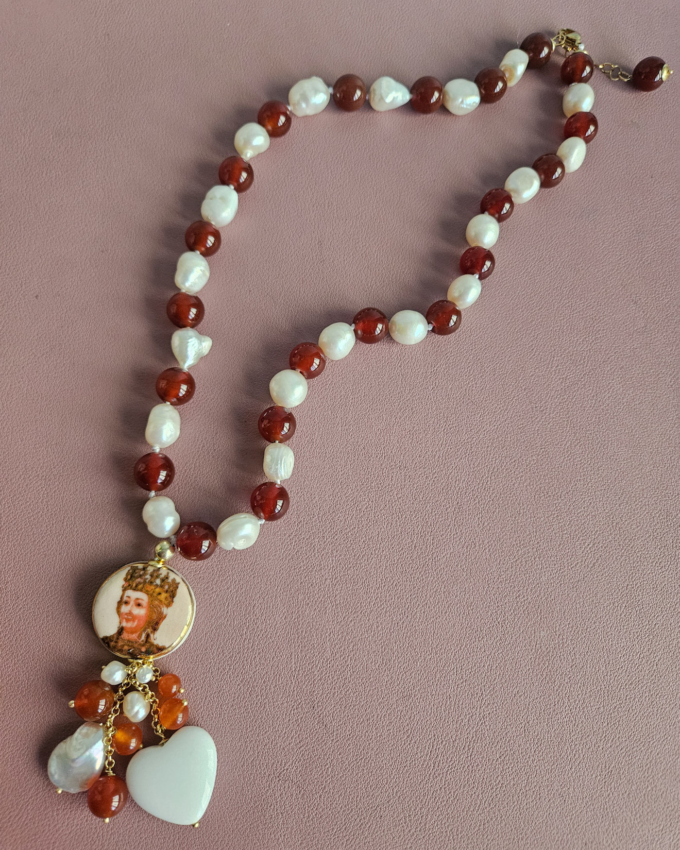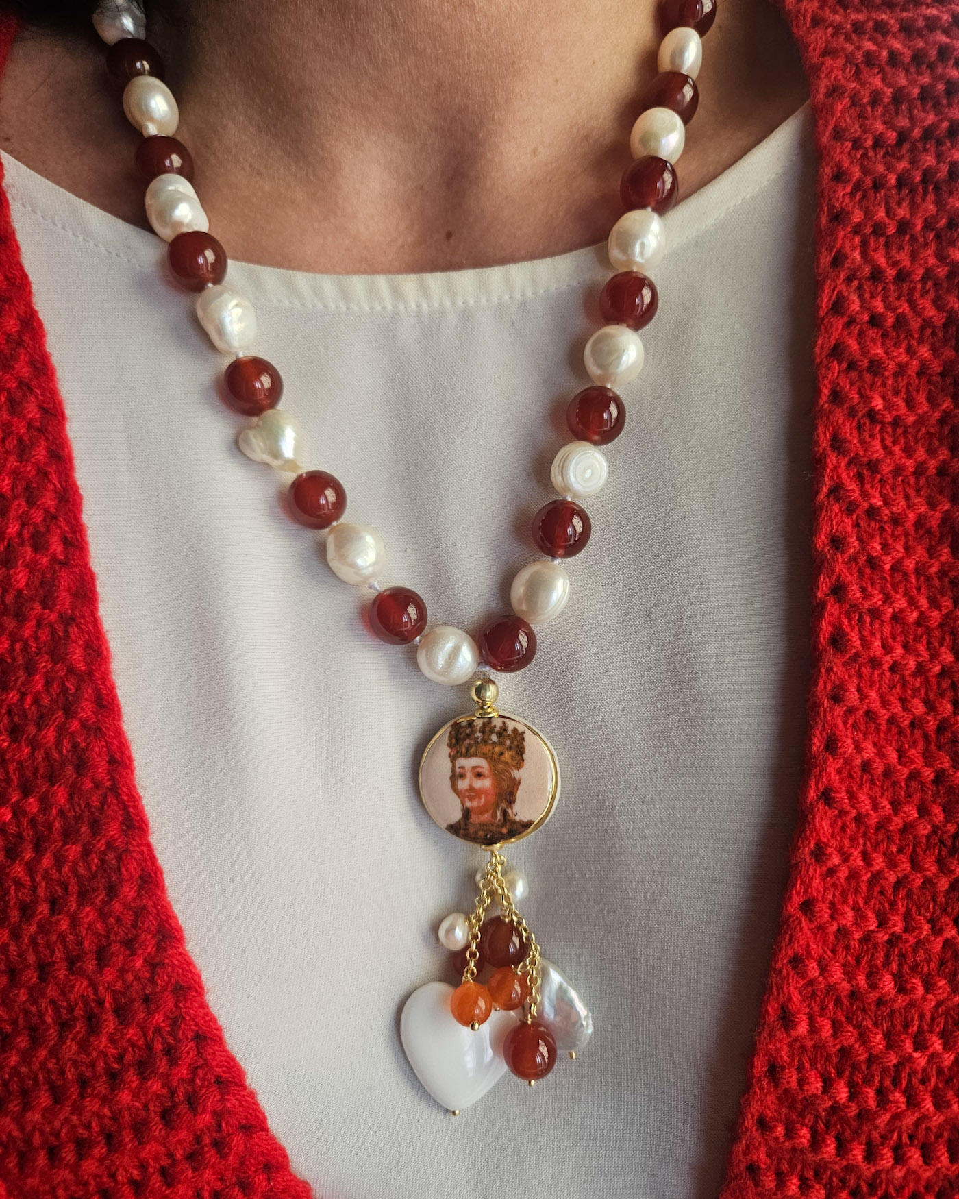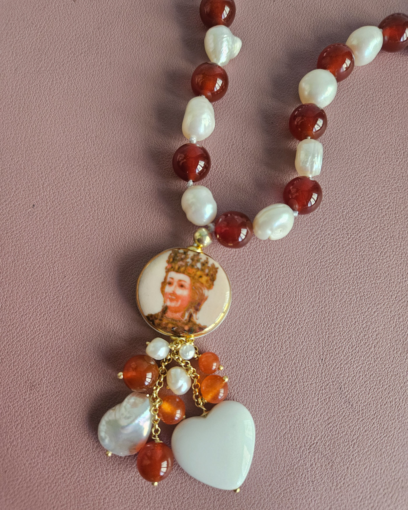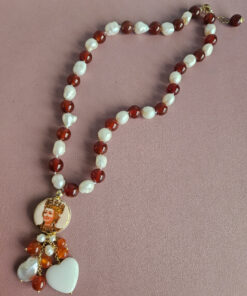 Decollete Necklace with Carnelian Stones, Pearls, and Ceramic Pendant