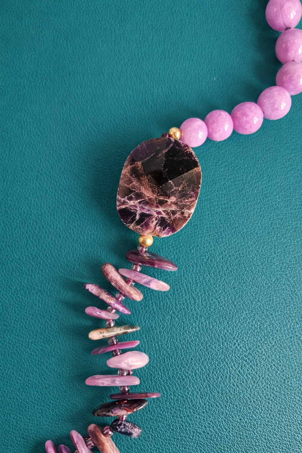 Made with kunzite stones, it is embellished with purple Sugilite chips that add depth, contrast, and bold elegance. The stones, skillfully alternated, create a harmonious visual rhythm that is never rigid, making every detail lively and dynamic.