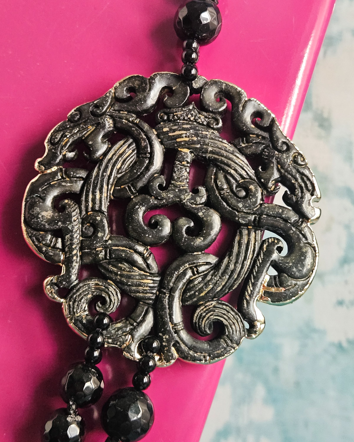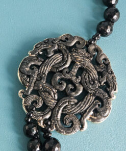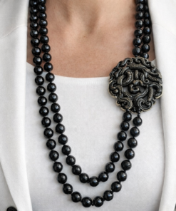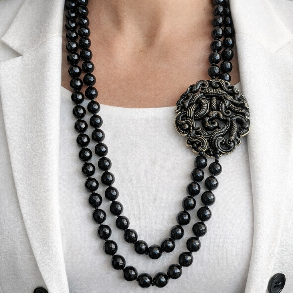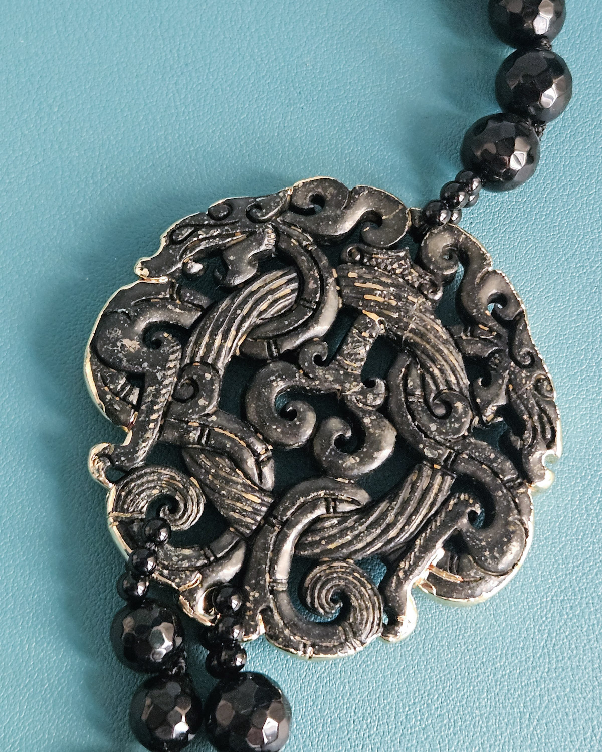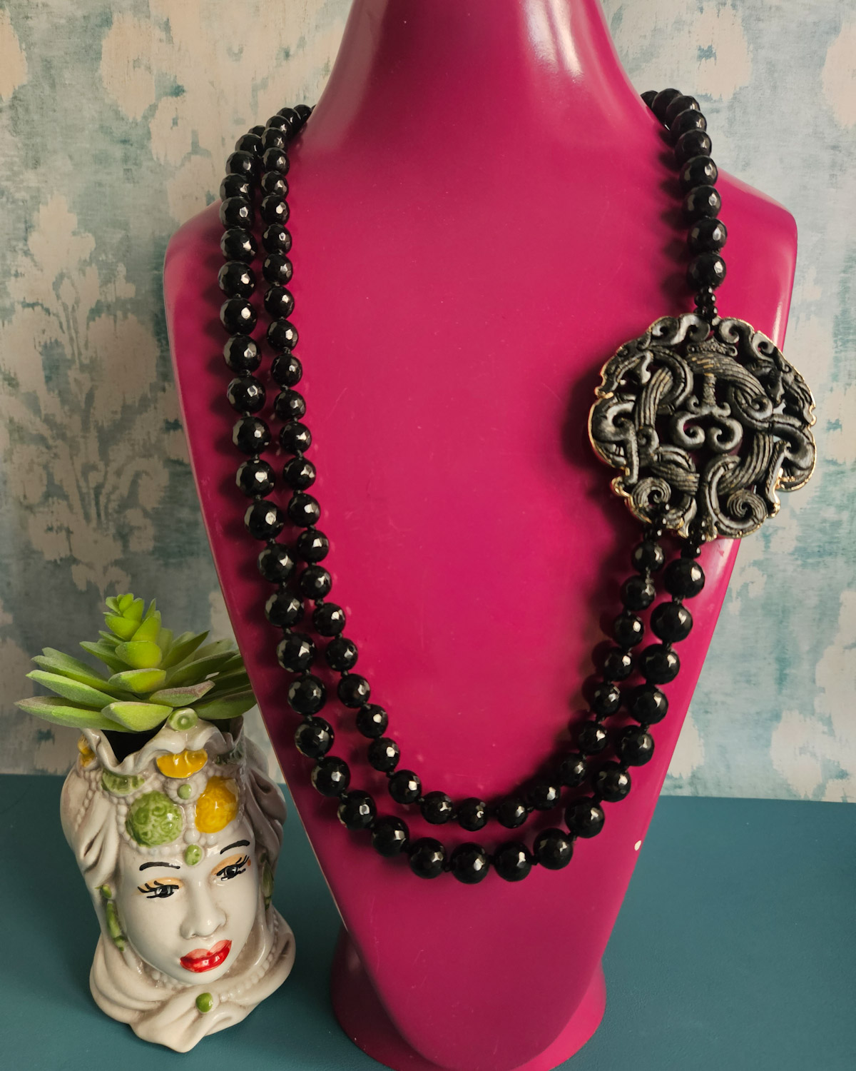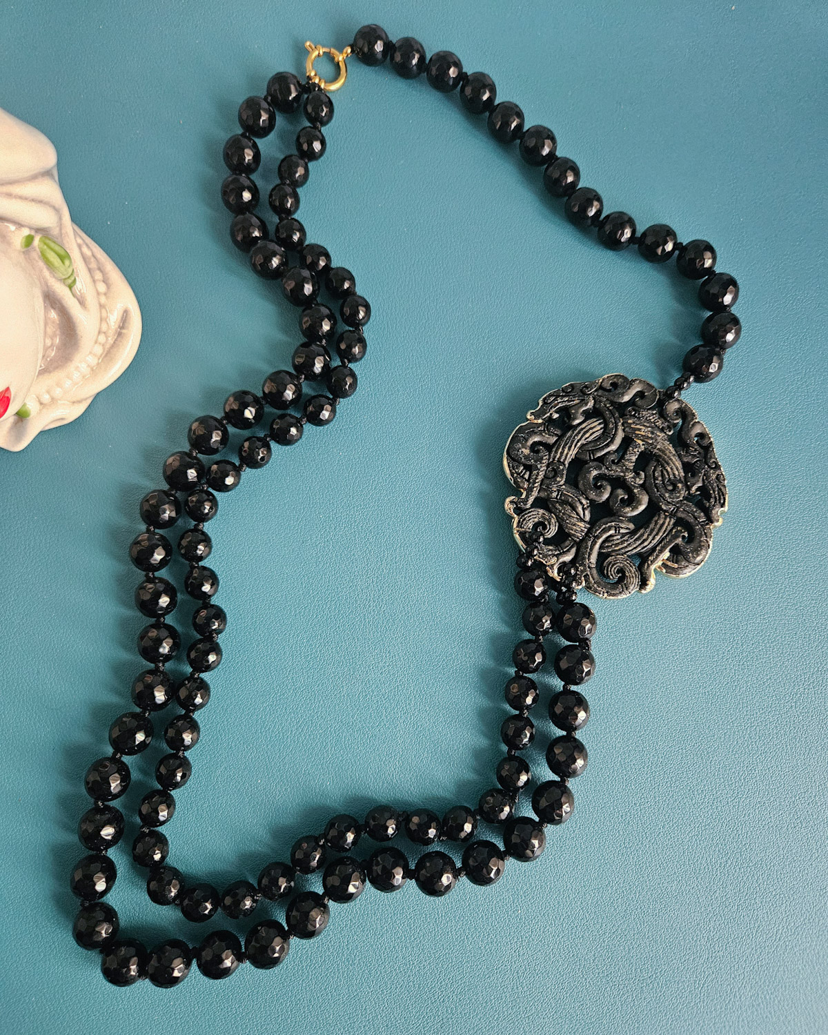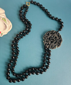 Double Necklace with Black Onyx Stones and Natural Jade Medal