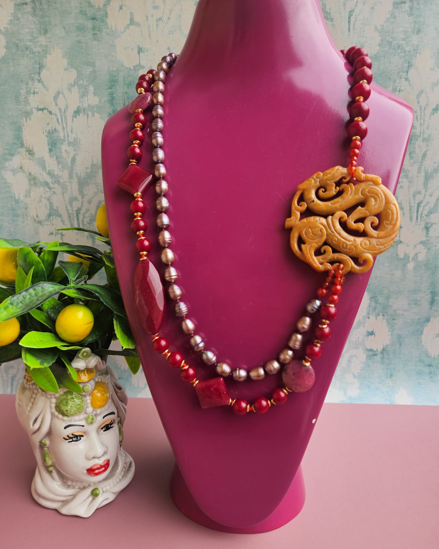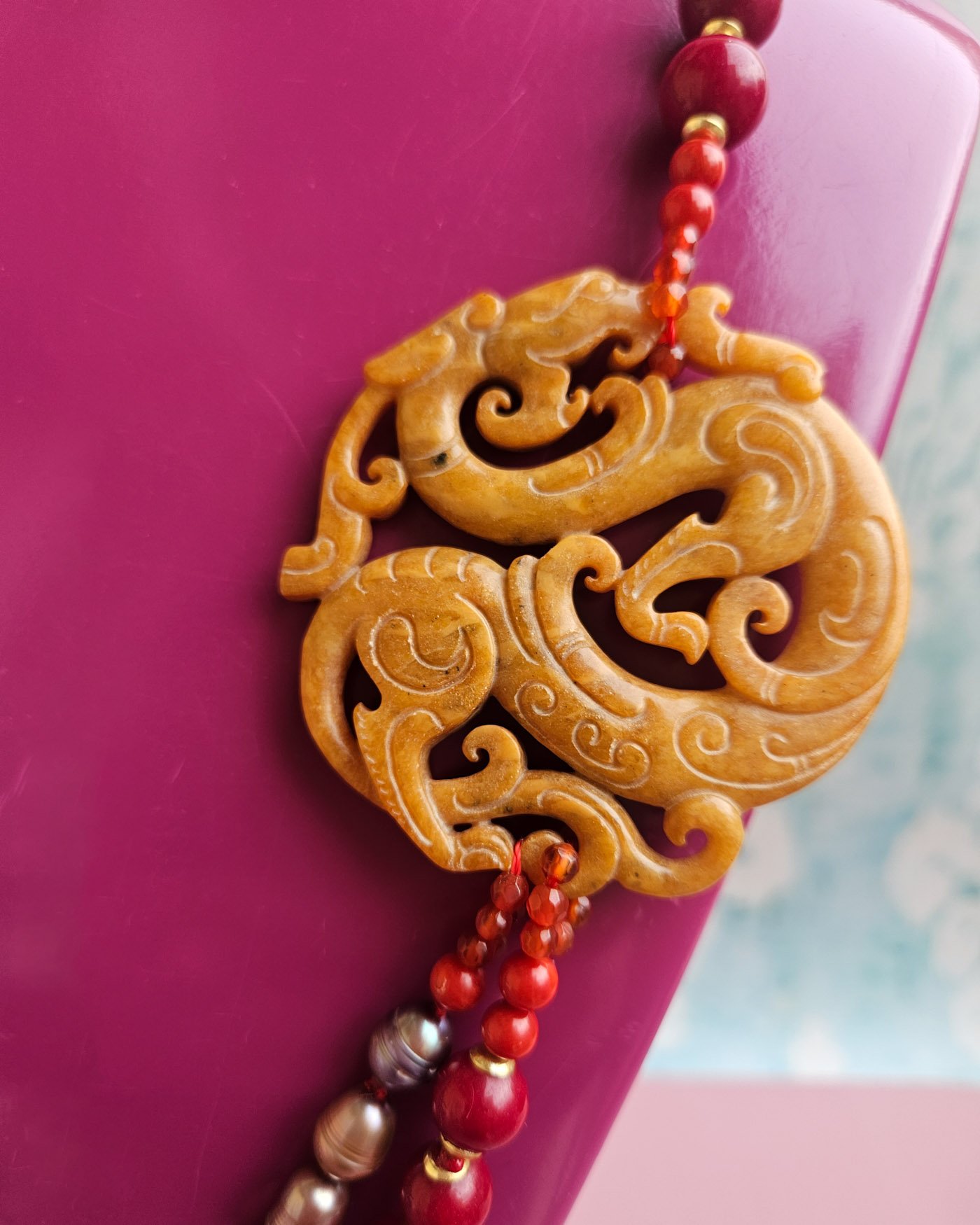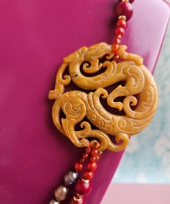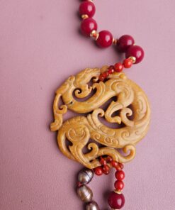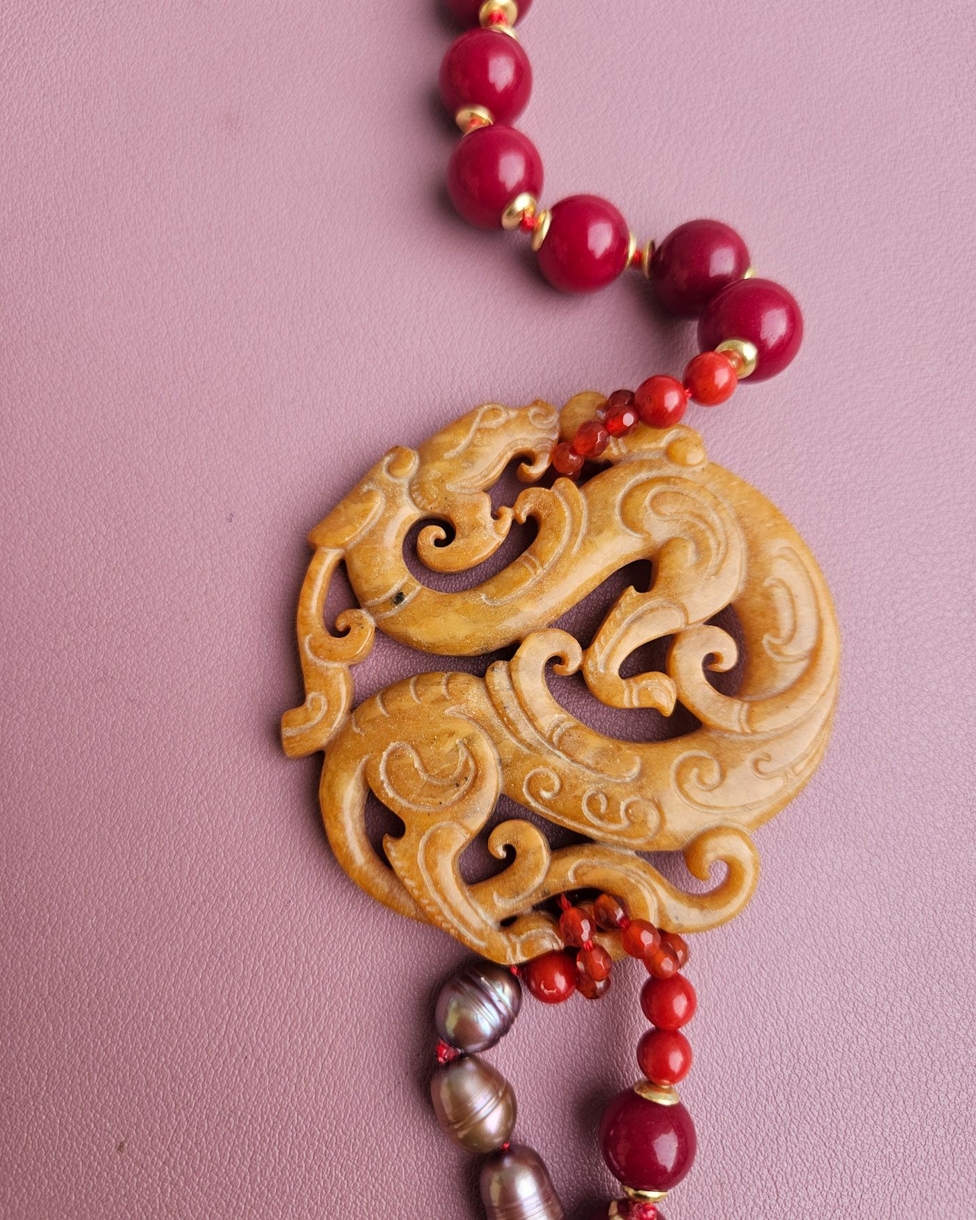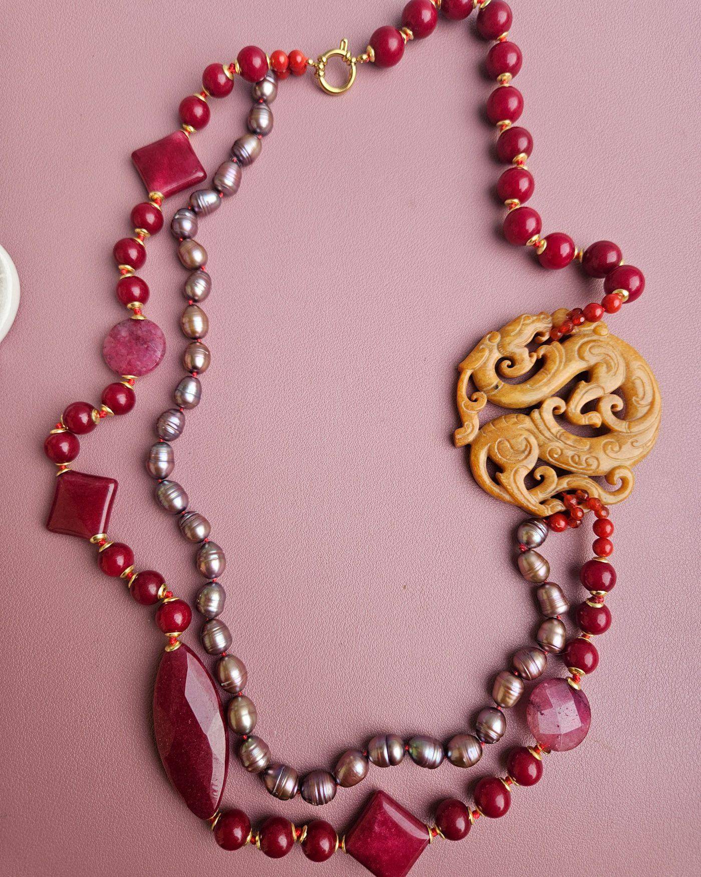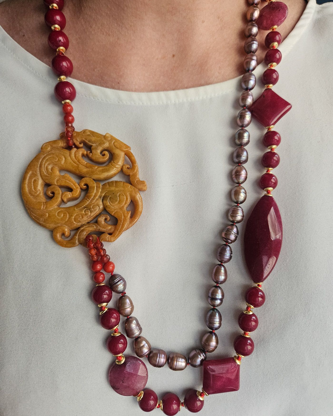 Double Necklace with Burgundy Agate, Pearls, and Yellow Jade Medal