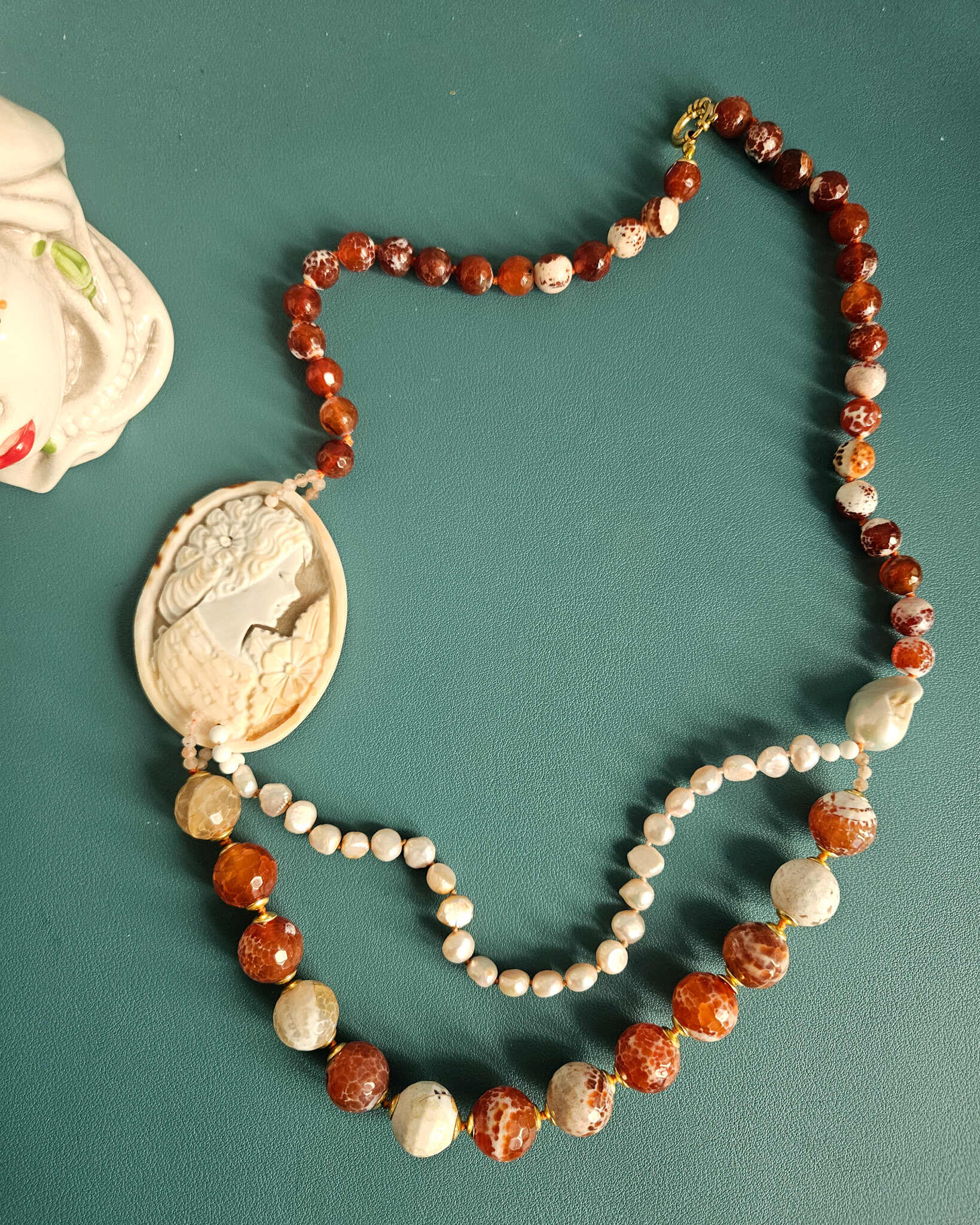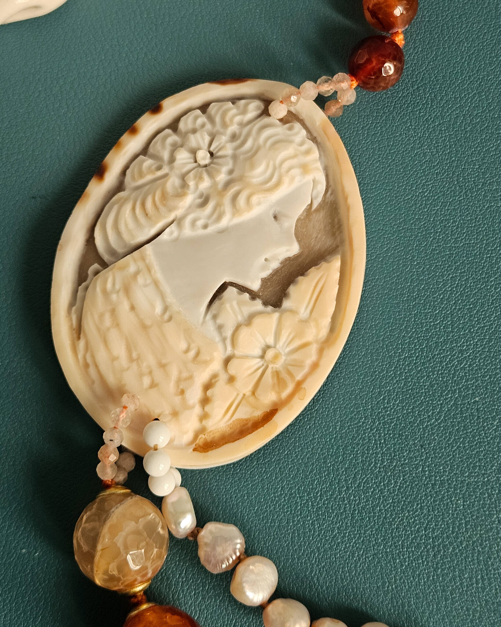 A jewel that combines the distinctiveness of fire agate with the classic charm of hand-carved cameo on authentic ocean shell. Every detail is designed to enhance femininity with delicacy and character. The delicately carved profile of the female figure tells stories of tradition and ancient beauty. The shell has natural black streaks, a rare and valuable peculiarity that guarantees the authenticity of its marine origin. These veins are considered a true mark of quality, synonymous with exclusivity and uniqueness.