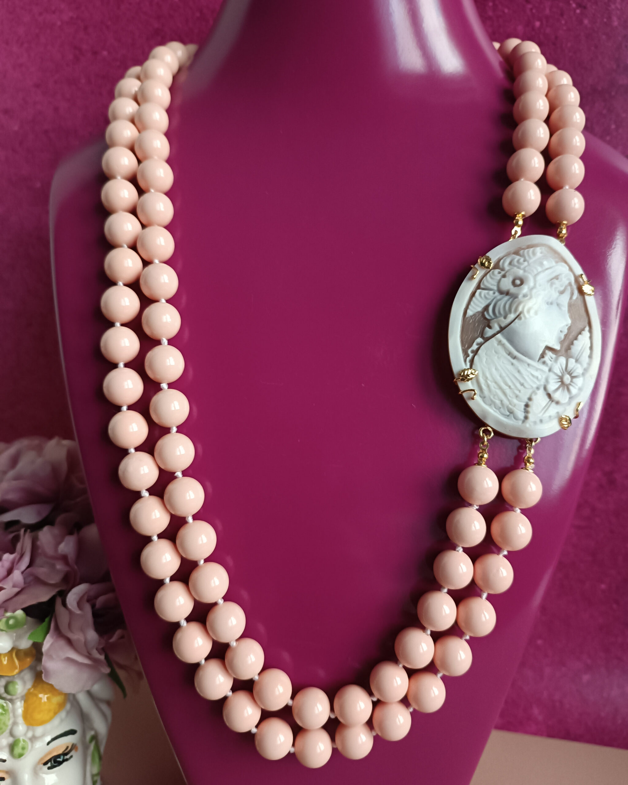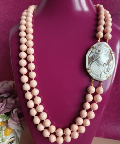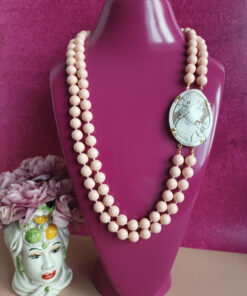 The charm of cameo never dies and the combination with pink, makes this necklace a very precious accessory to treasure in your jewelry box.