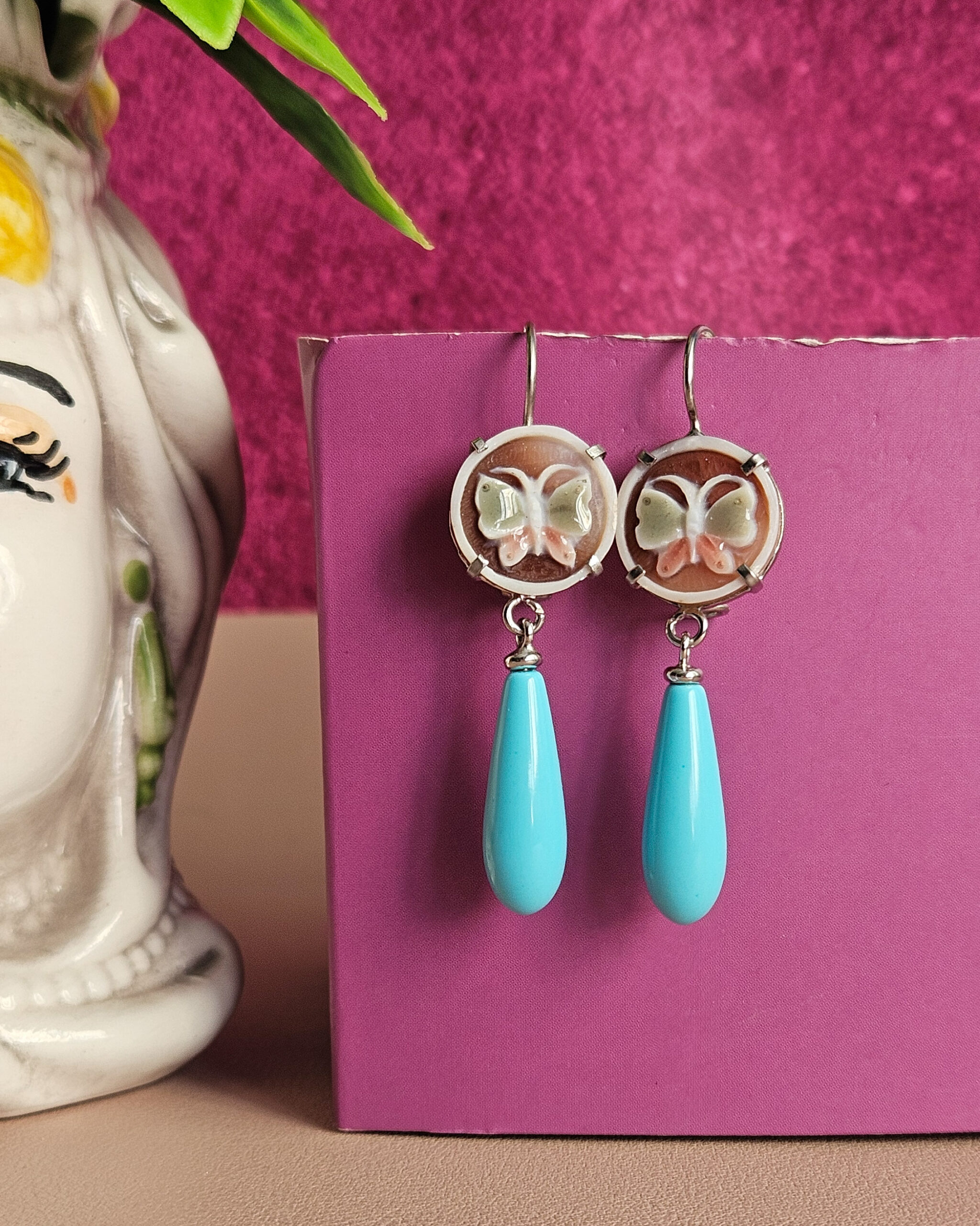Their key feature is certainly the special enameled and painted shell cameos, depicting a butterfly on one side and flowers on the other.