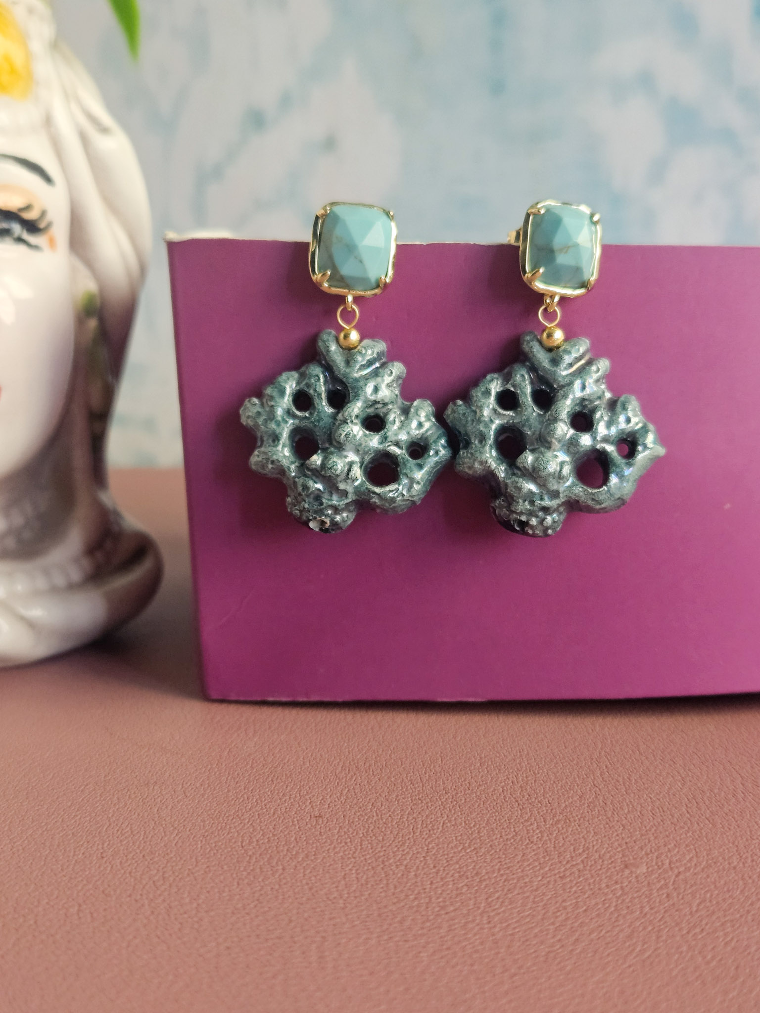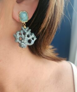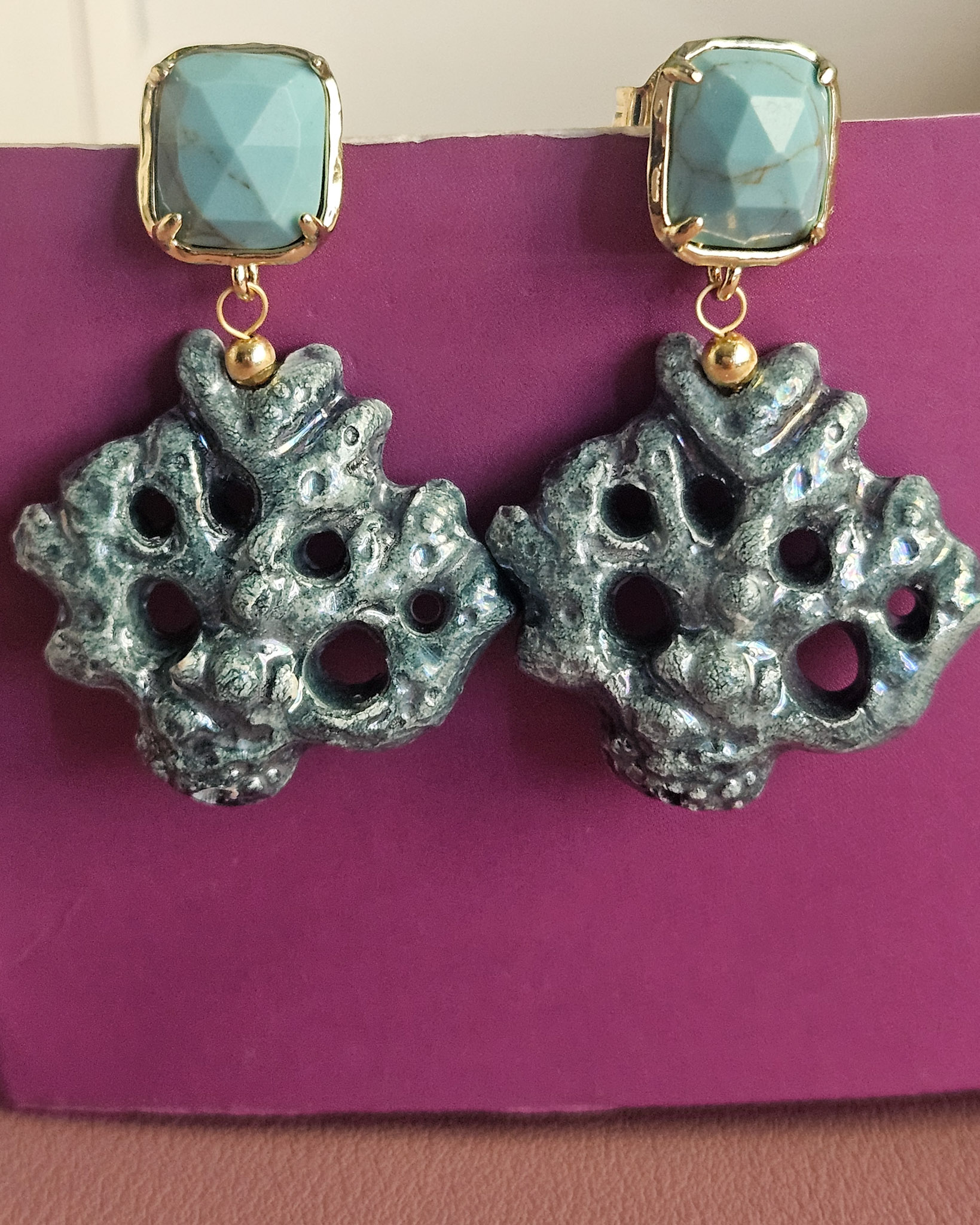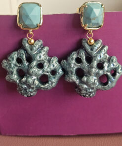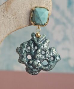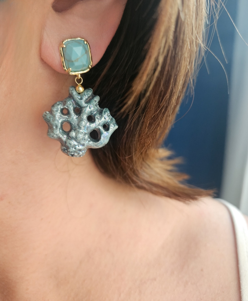Earrings made with ceramic coral branches from Caltagirone, shaped and painted by hand. The irregular shapes and rough surface recall the natural texture of coral, while the bright colors add a cheerful and colorful touch. The upper part is embellished with turquoise aulite stones, which add a touch of brightness without being too flashy. A handcrafted accessory that combines Sicilian tradition and contemporary style.