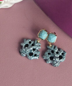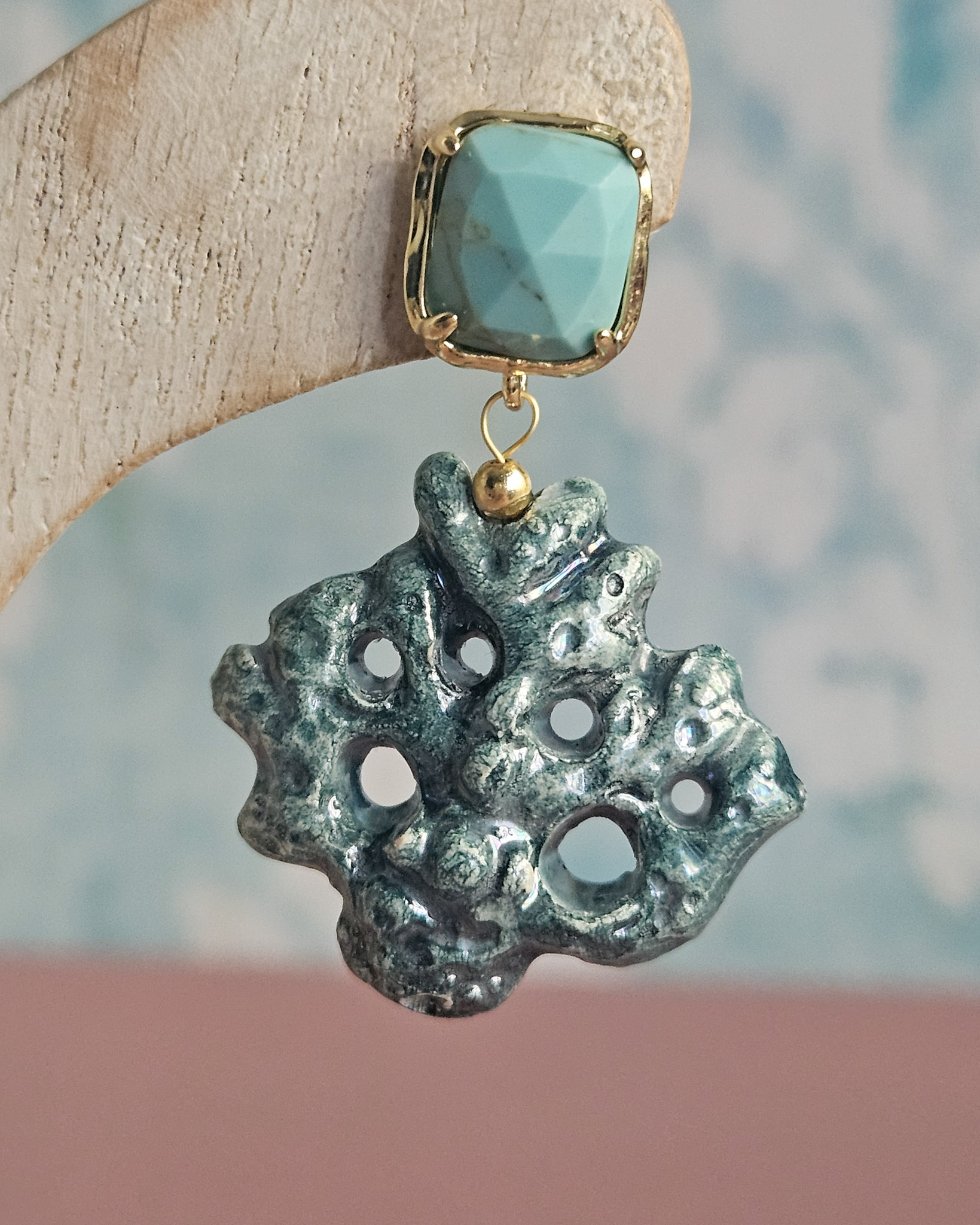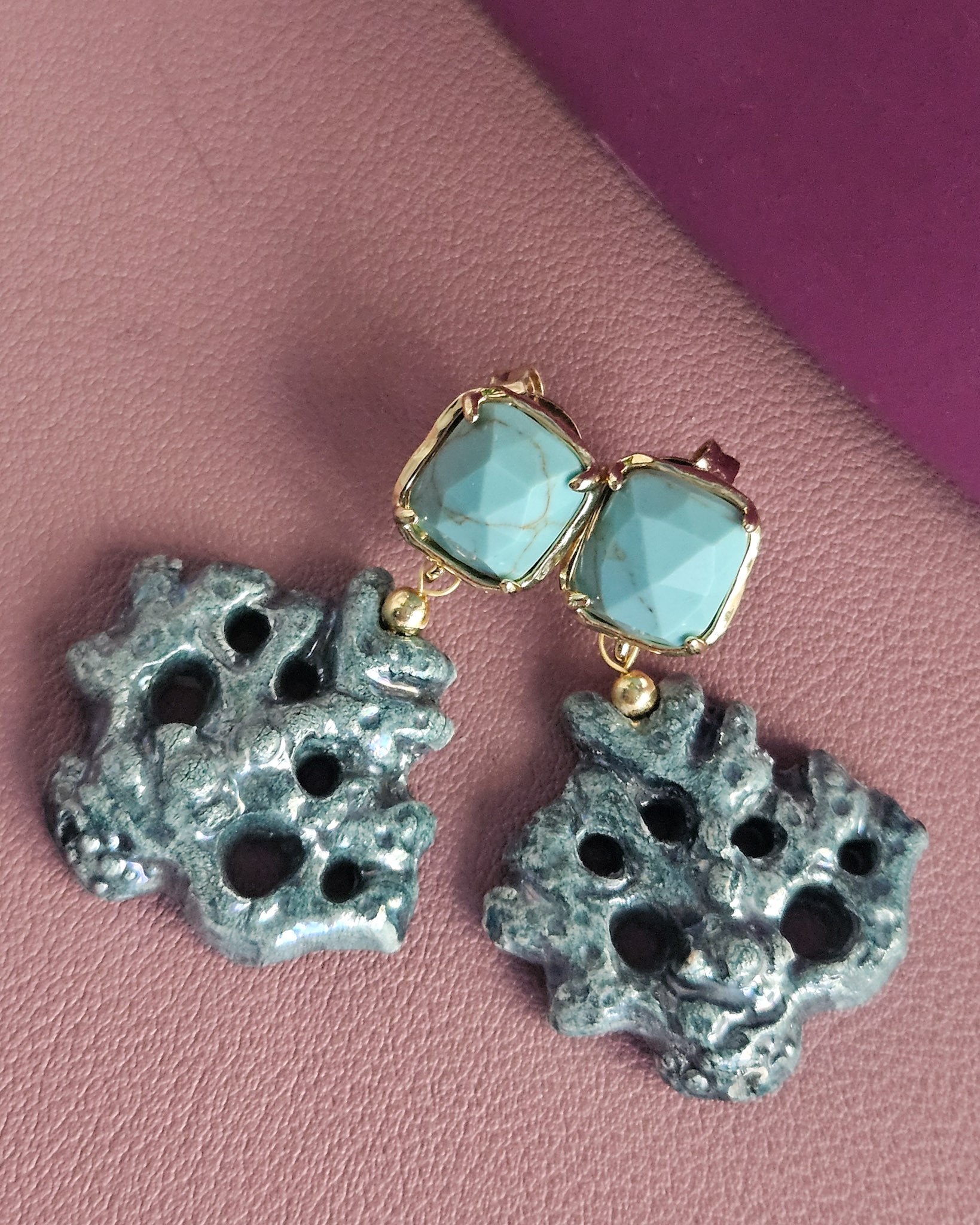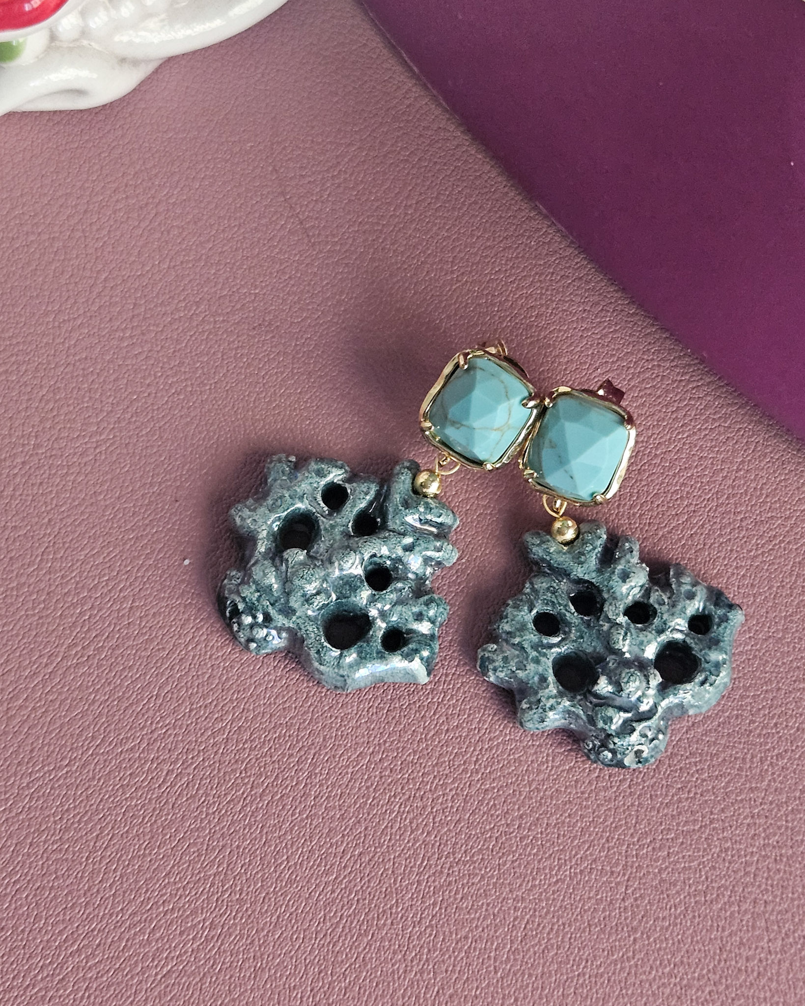 Earrings made with ceramic coral branches from Caltagirone, shaped and painted by hand. The irregular shapes and rough surface recall the natural texture of coral, while the bright colors add a cheerful and colorful touch. The upper part is embellished with turquoise aulite stones, which add a touch of brightness without being too flashy. A handcrafted accessory that combines Sicilian tradition and contemporary style.