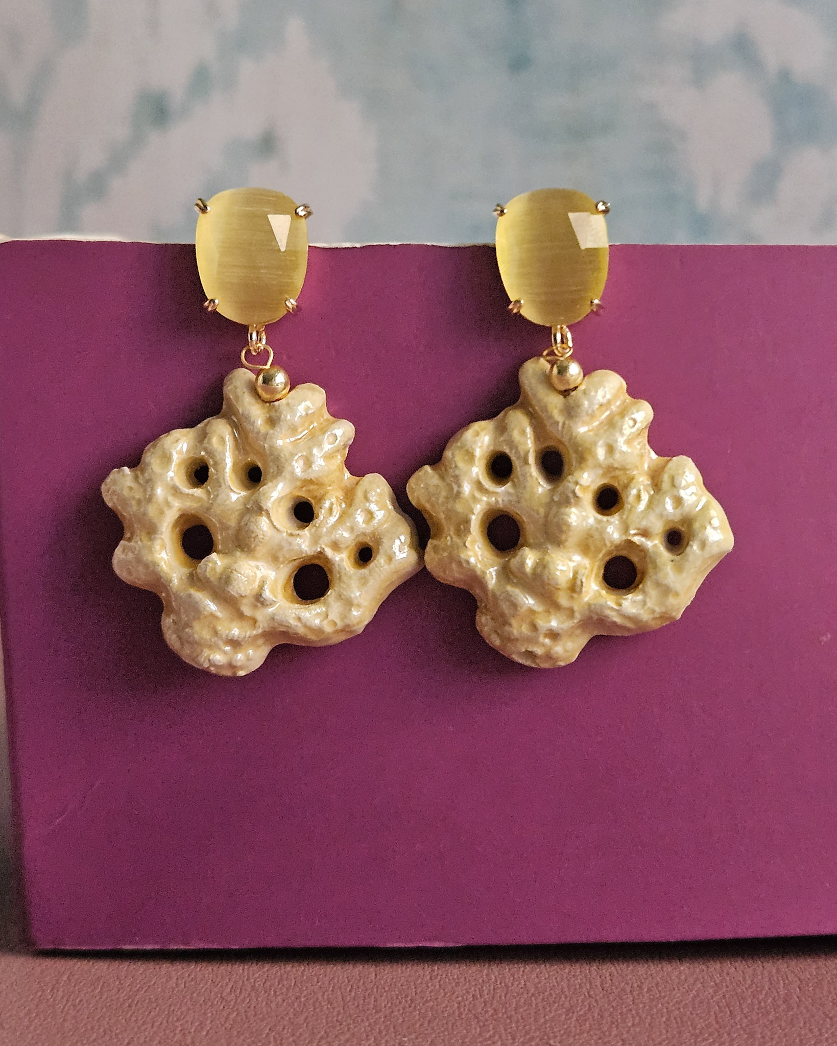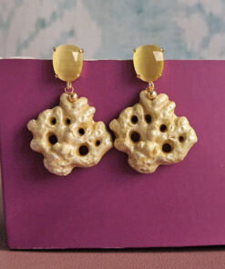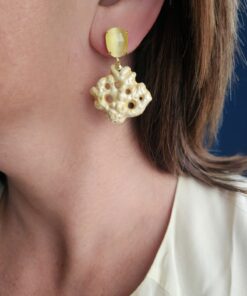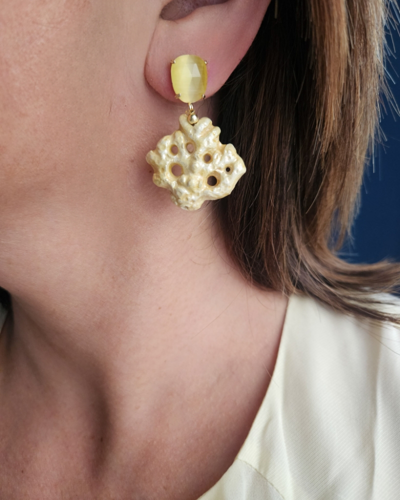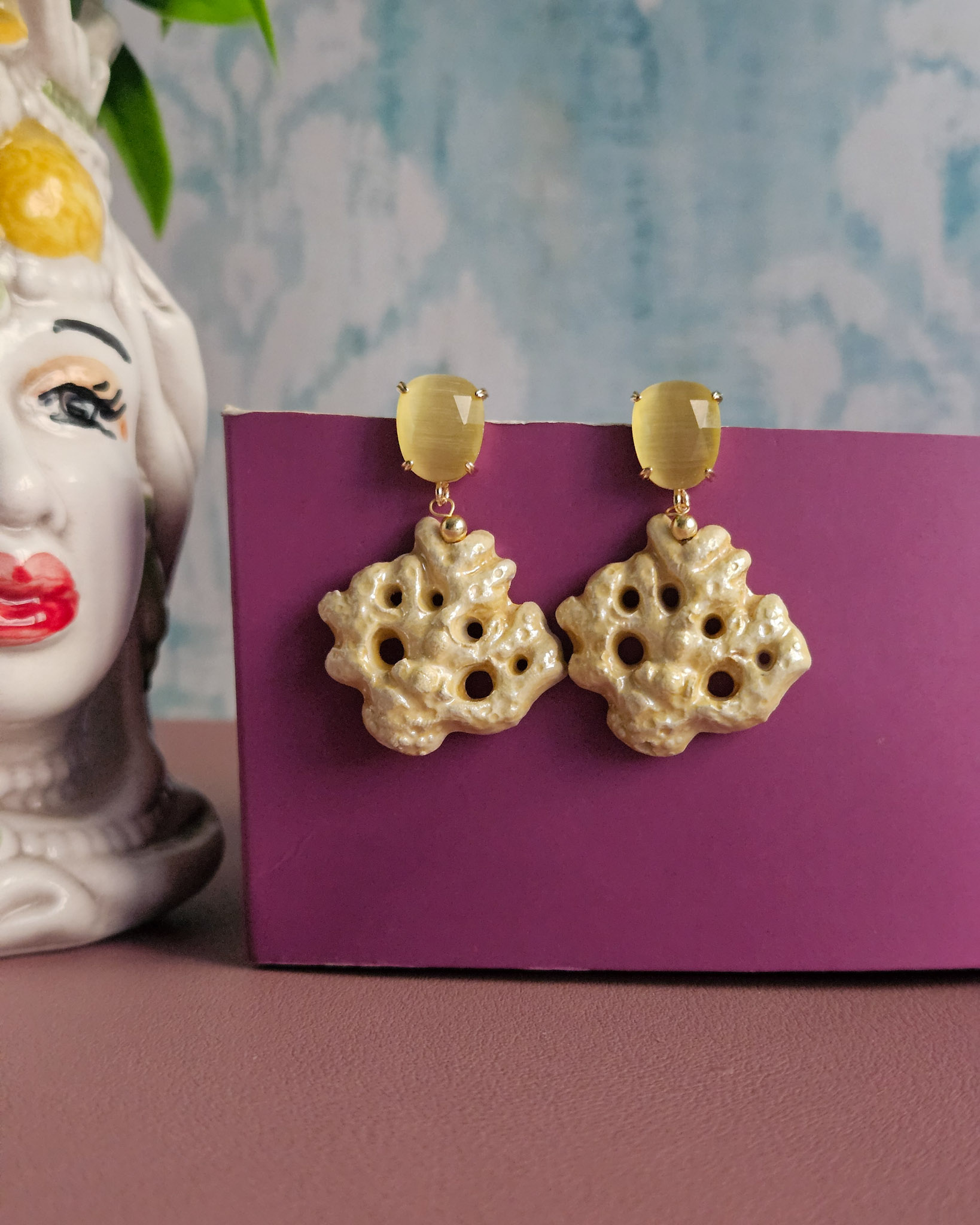 Earrings made with ceramic coral branches from Caltagirone, shaped and painted by hand. The irregular shapes and rough surface recall the natural texture of coral, while the bright colors add a cheerful and colorful touch. The upper part is embellished with yellow crystals, which add a touch of brightness without being too flashy. A handcrafted accessory that combines Sicilian tradition and contemporary style.
