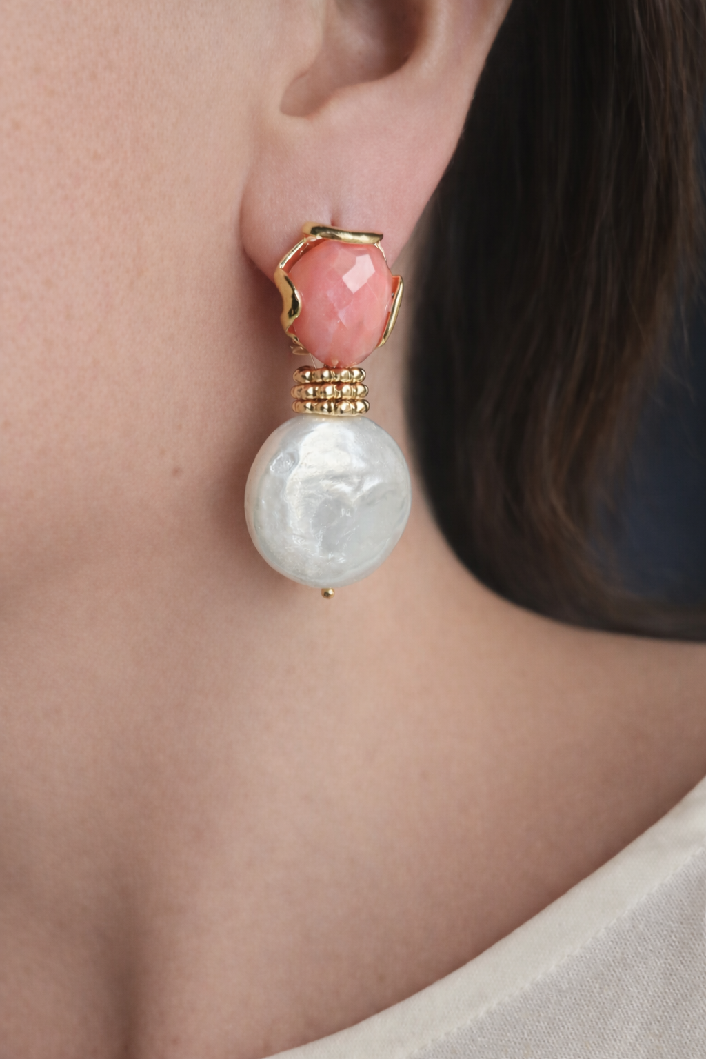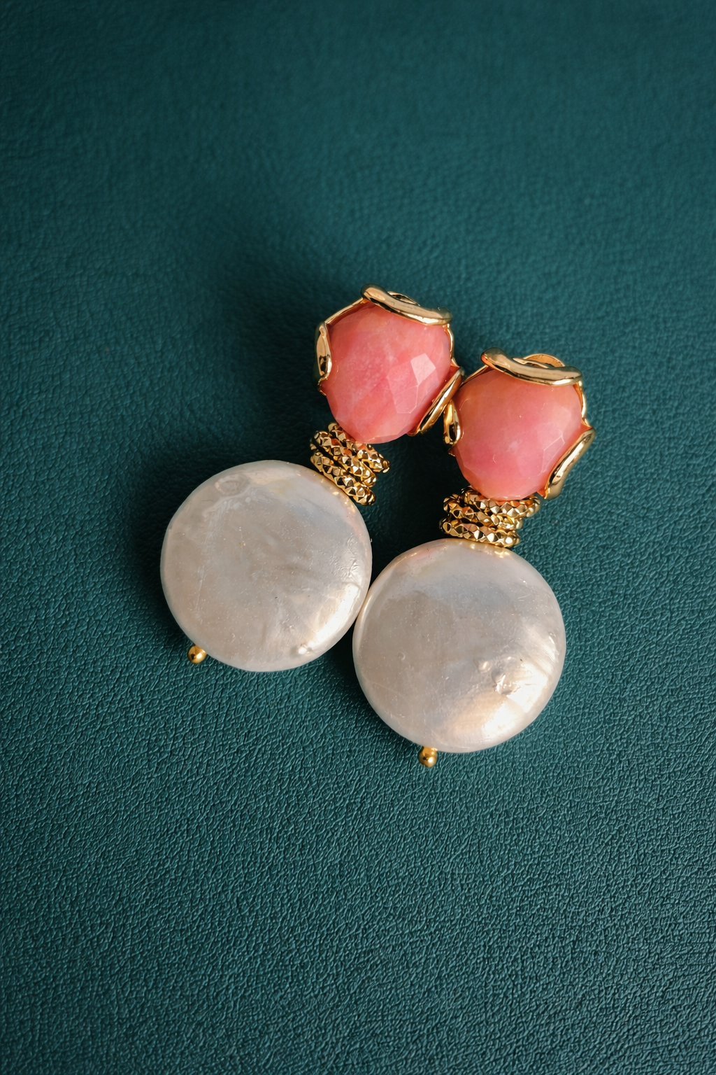 Drop Earrings with Flat Imitation Pearls and Rose Chrysoberyl