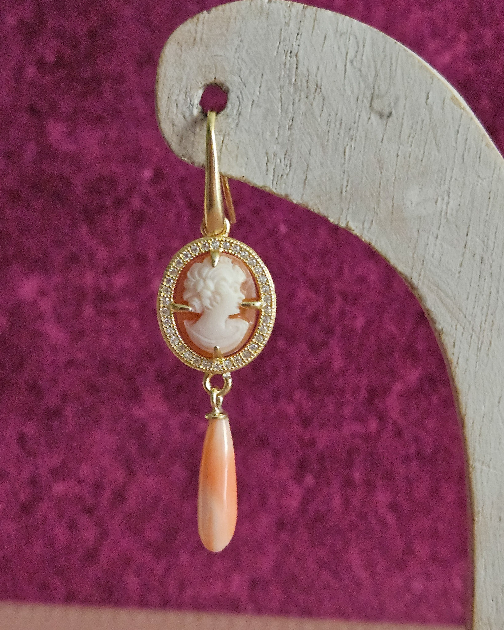 Their key feature is certainly the lady portrait carved from the shell and the super chic drops of the angel skin coral drops.