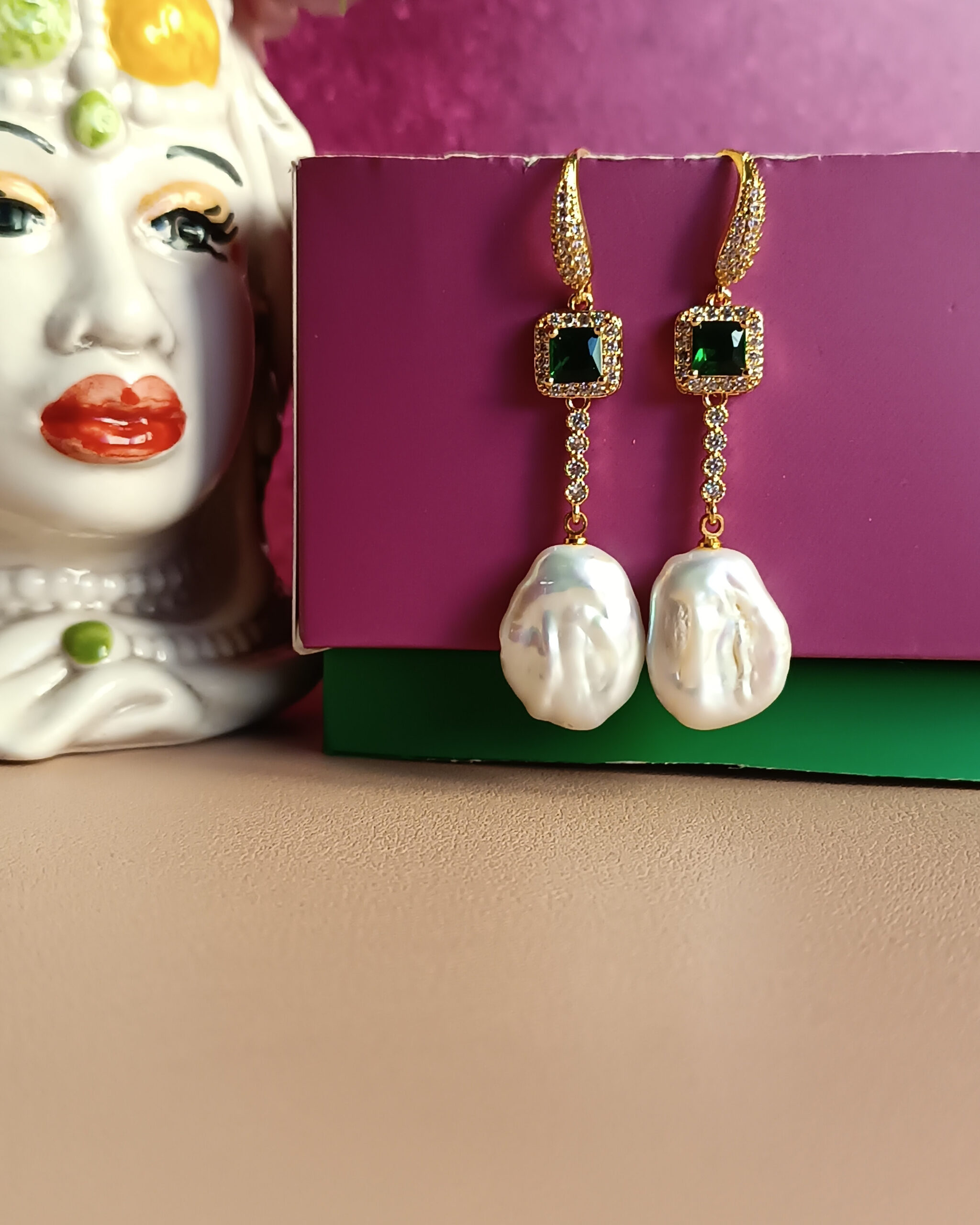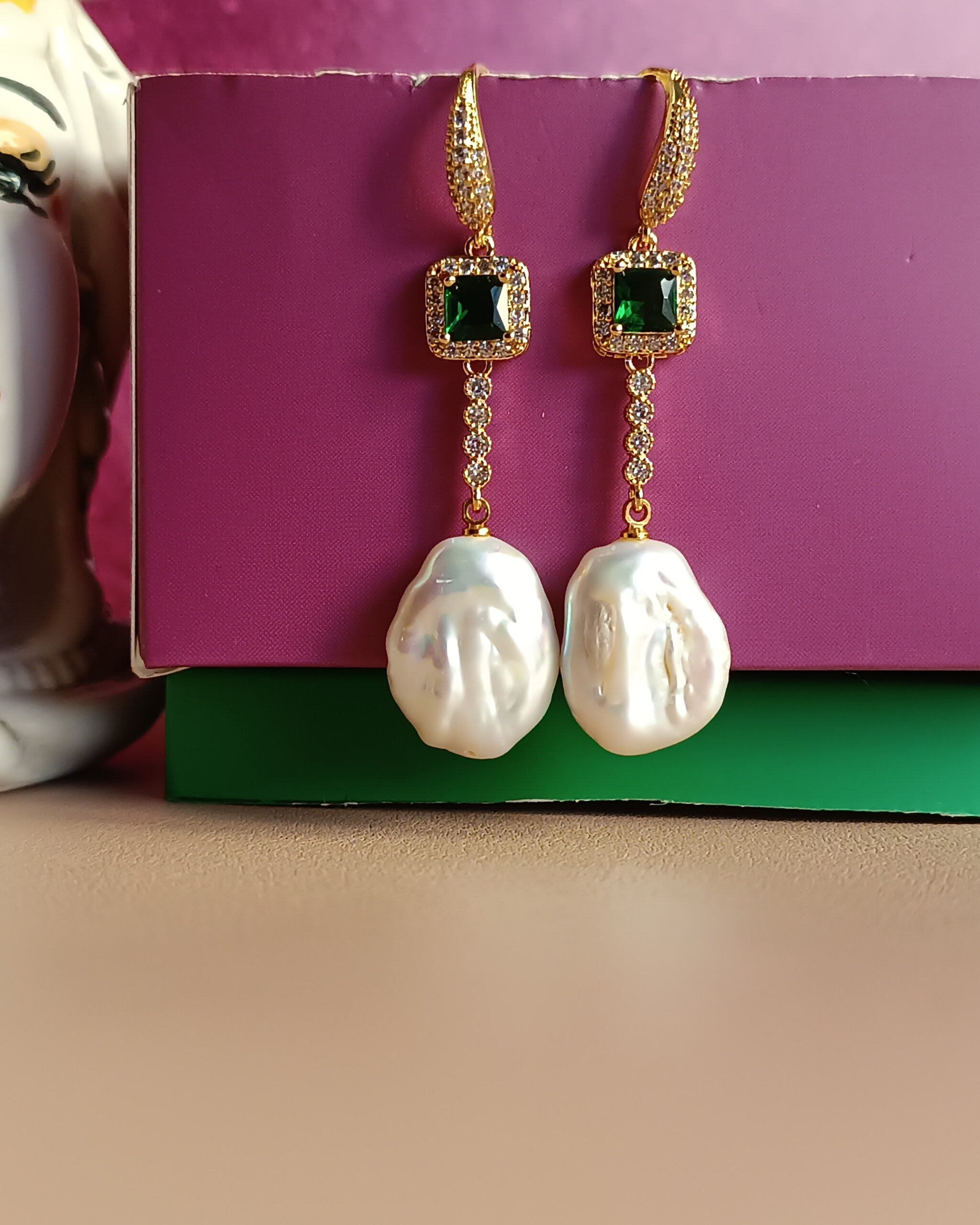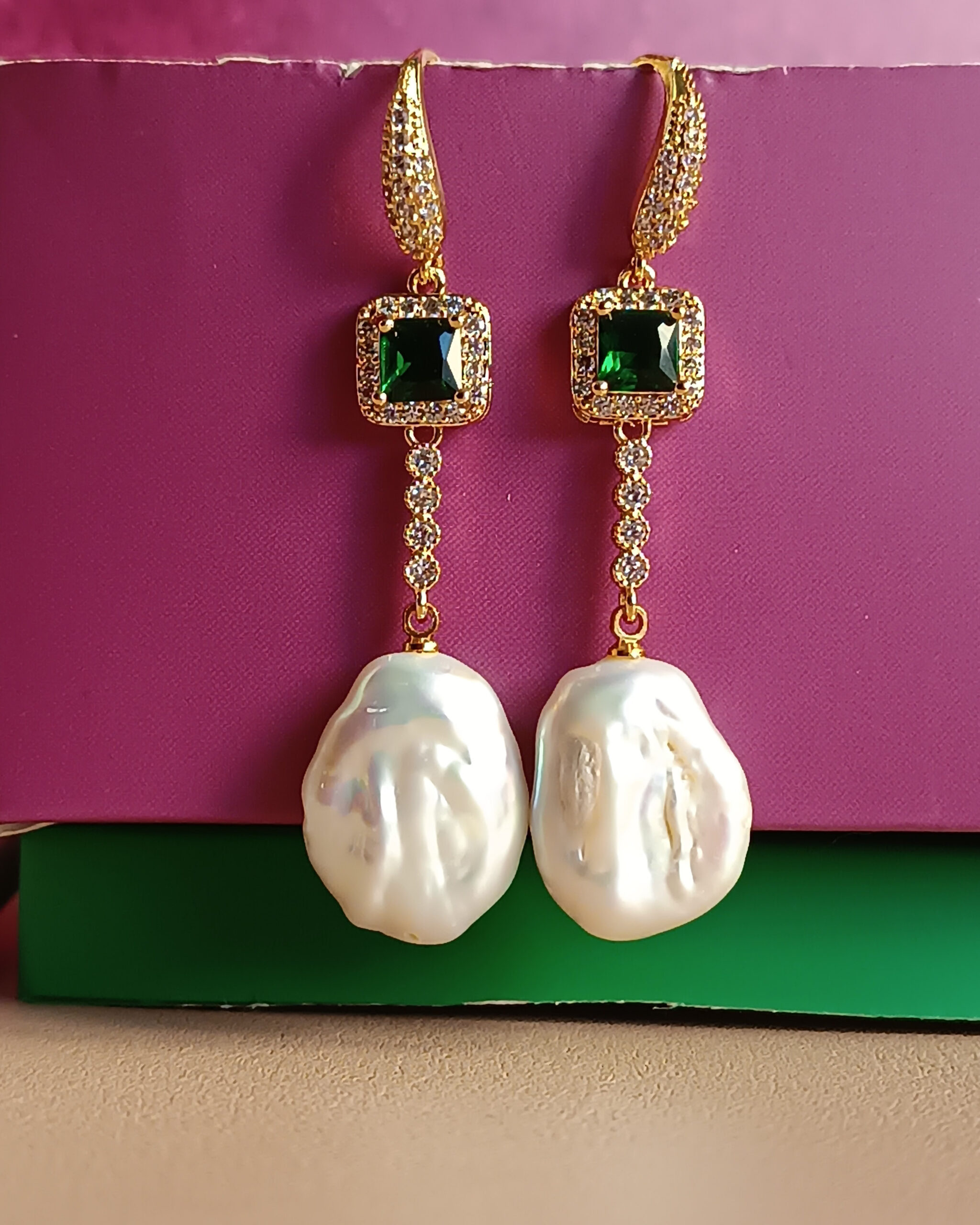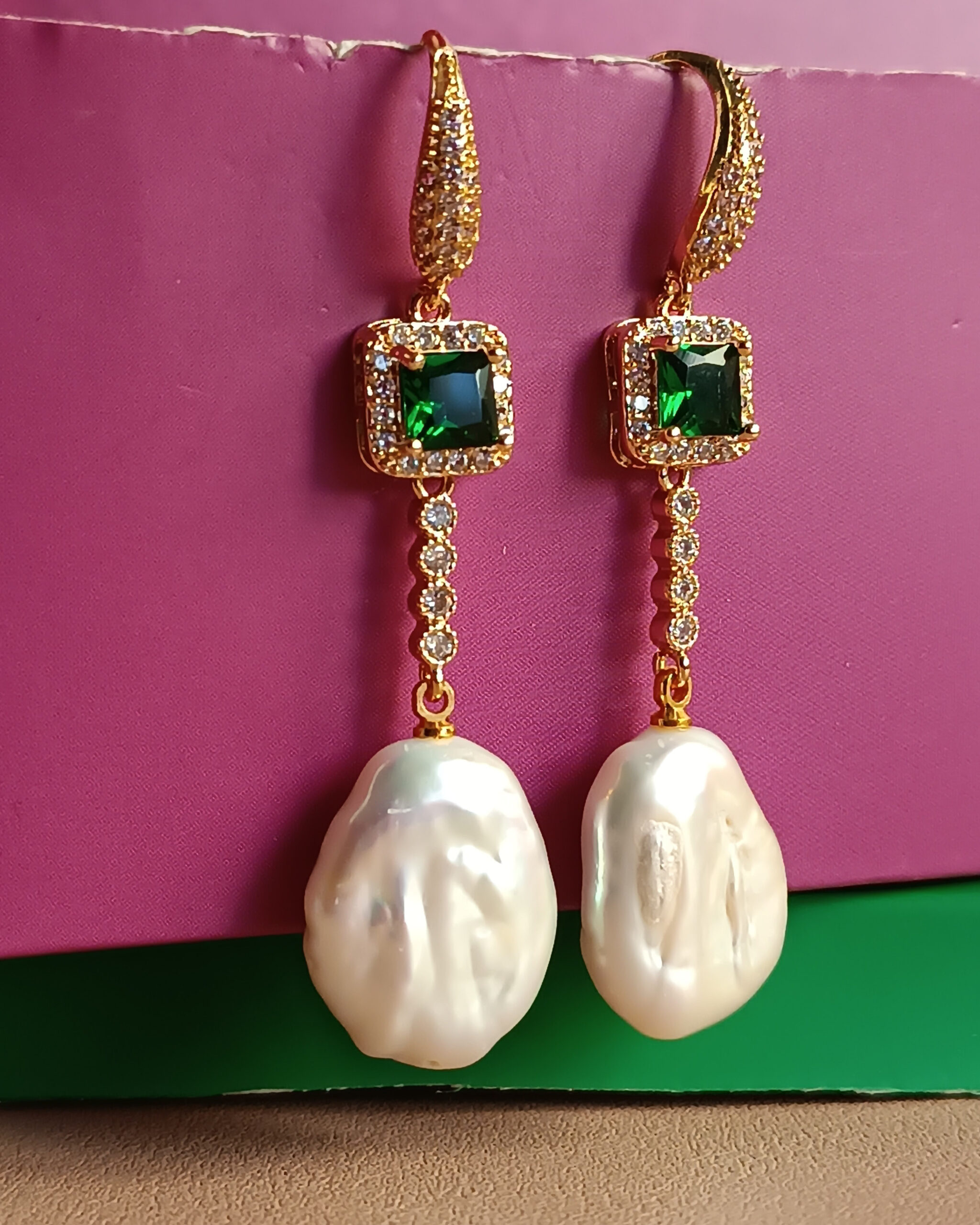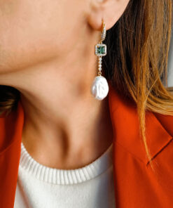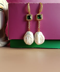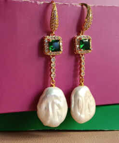 Drop Earrings with Green Crystals, Zircons and Flat Pearls
