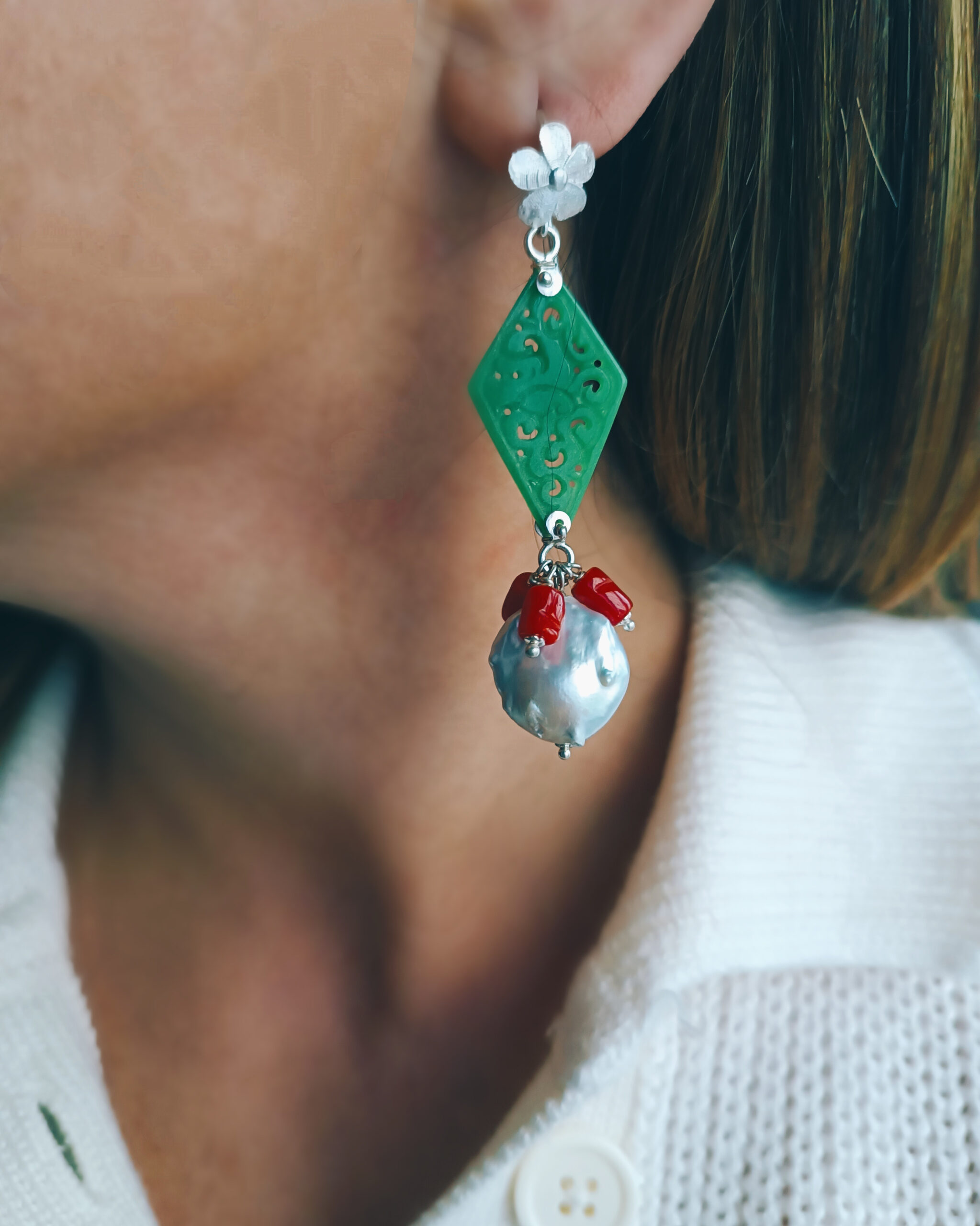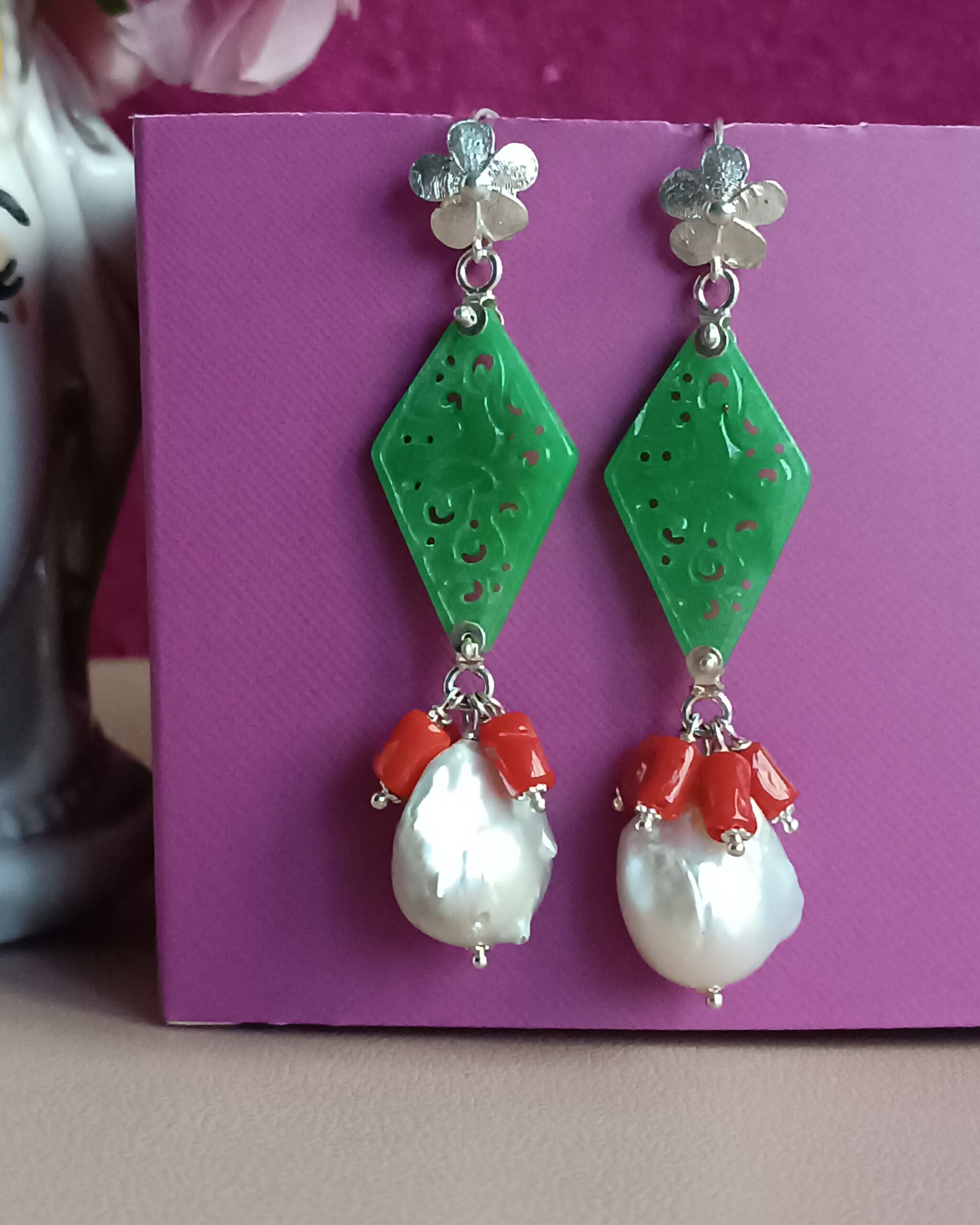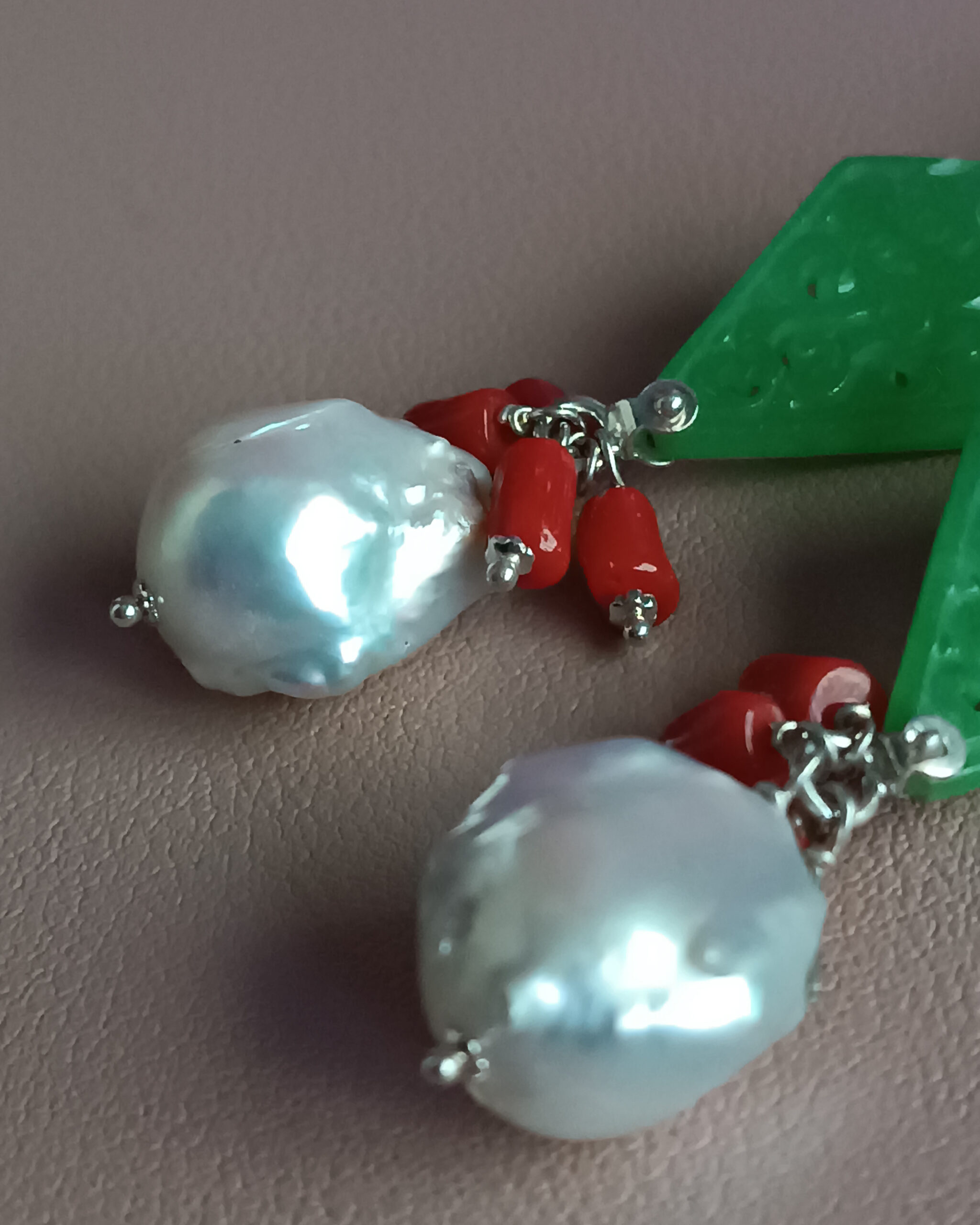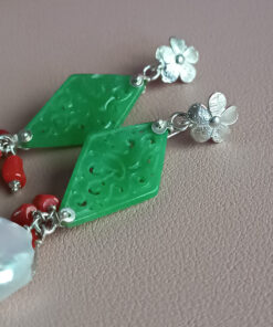 Drop Earrings with Green Jade Stones and Baroque Pearls