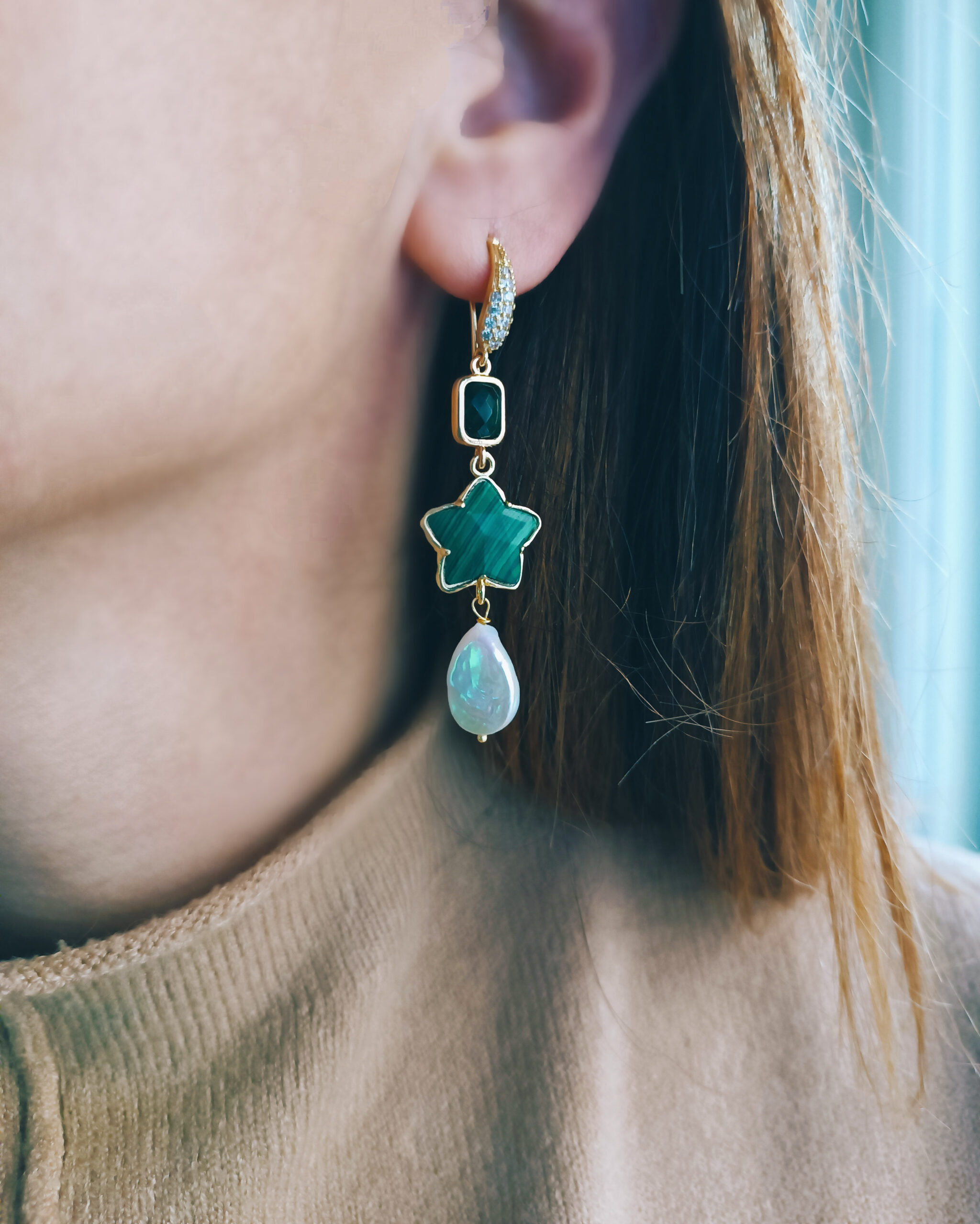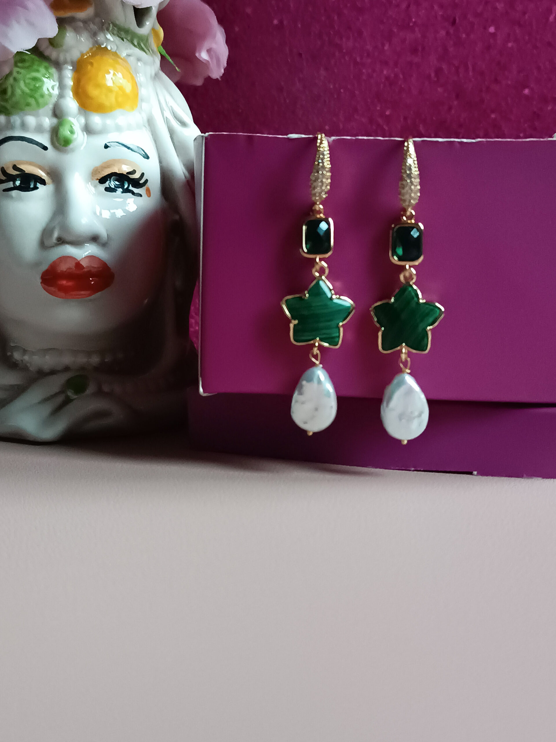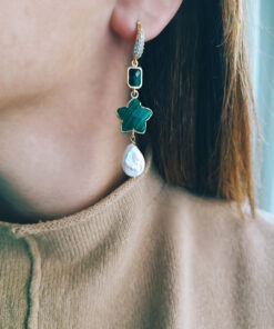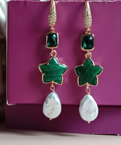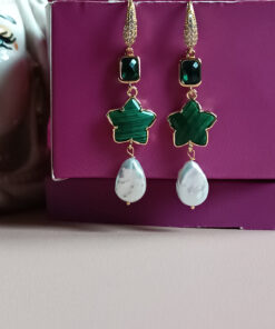 Drop Earrings with Green Malachite Stones and Flat Pearls