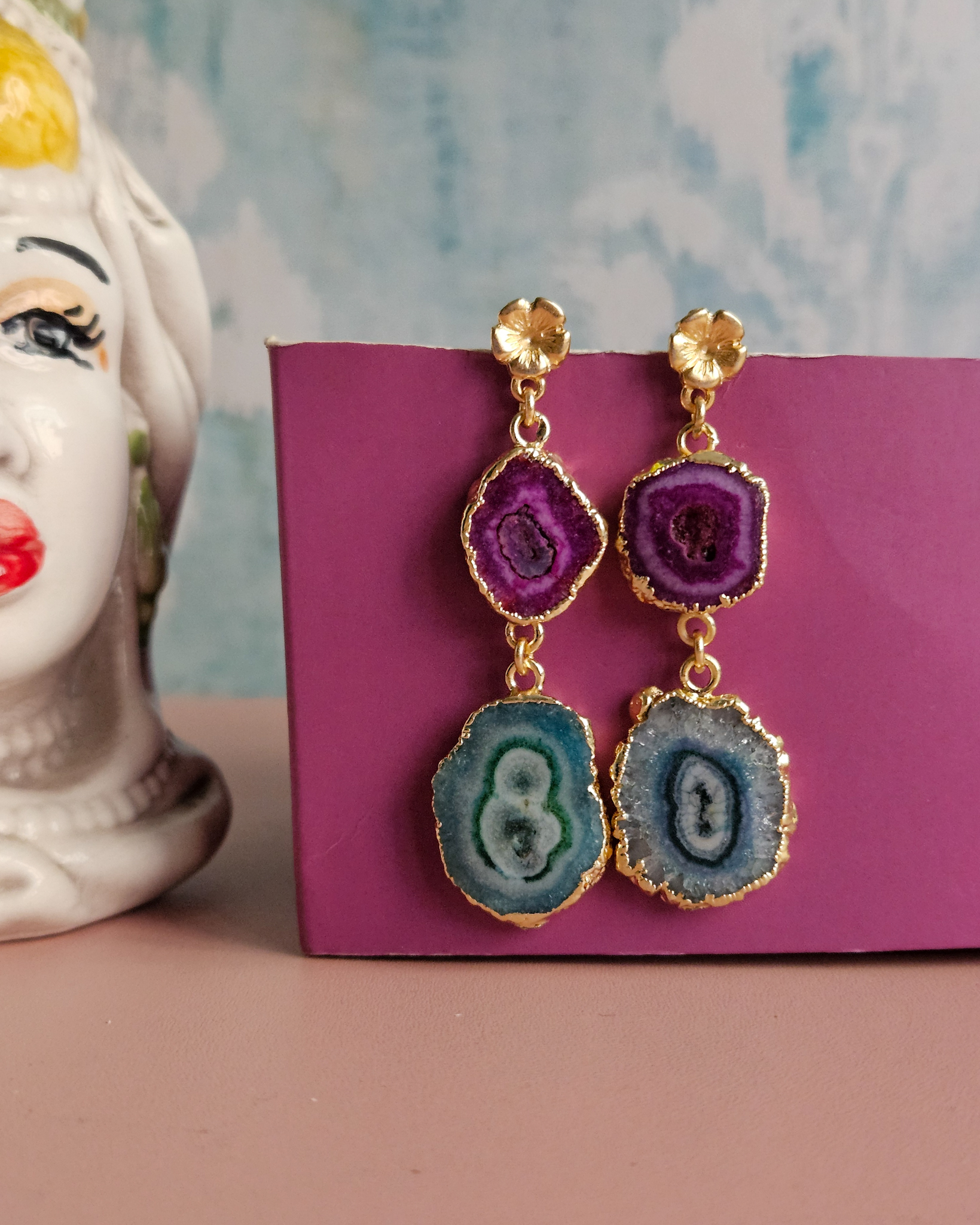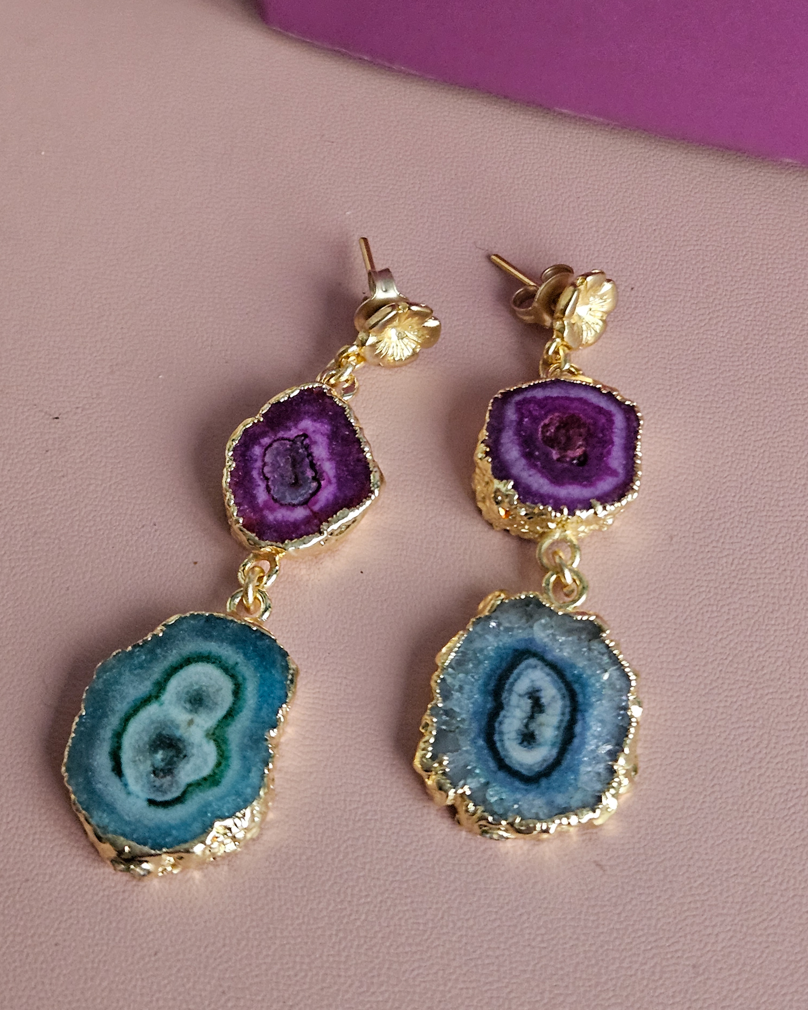 Stand out in style with these fine dangle earrings, crafted from authentic natural geodes in vibrant hues: green water and fuchsia. Each stone is unique, hand-cut to preserve its natural beauty and framed with an elegant gold finish that enhances its irregular contours and crystalline texture.