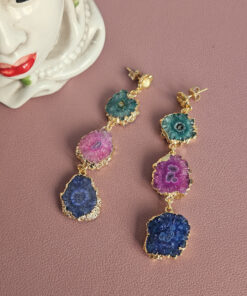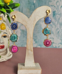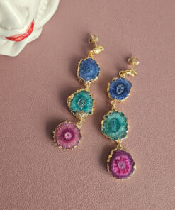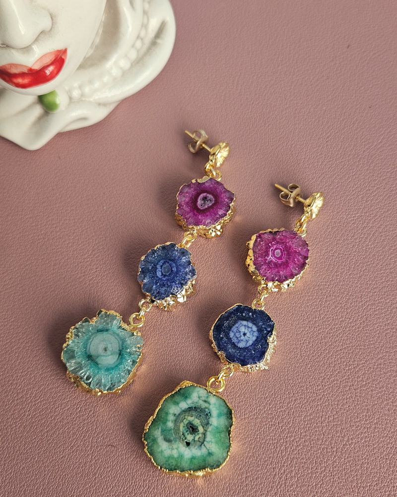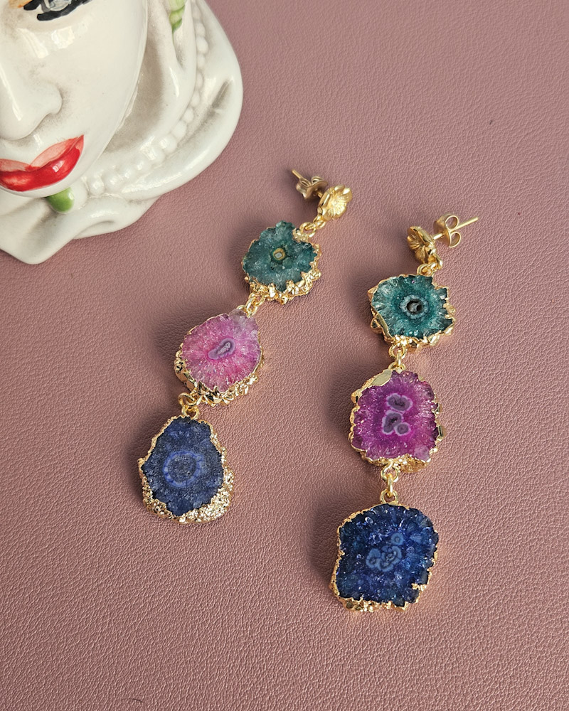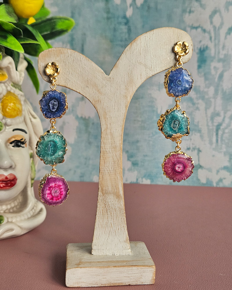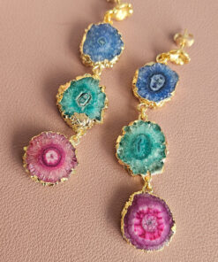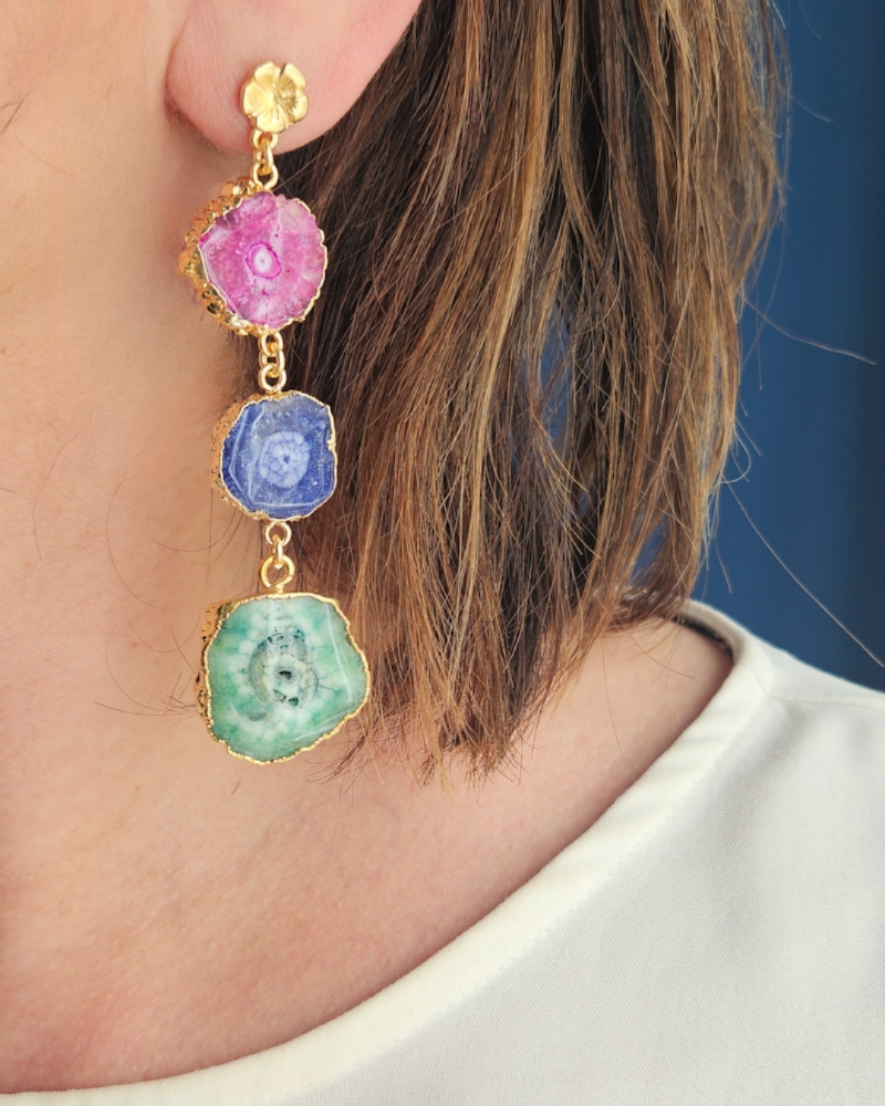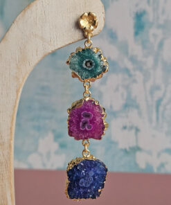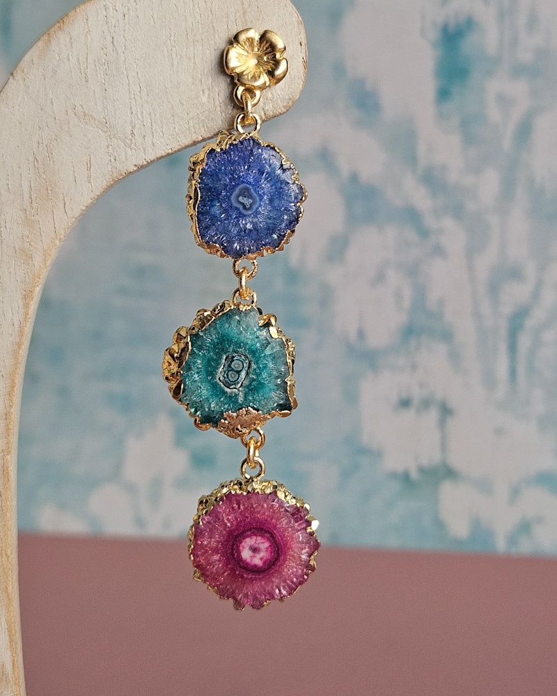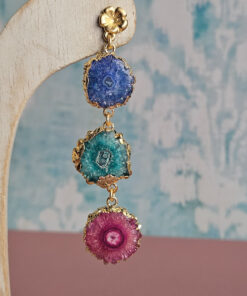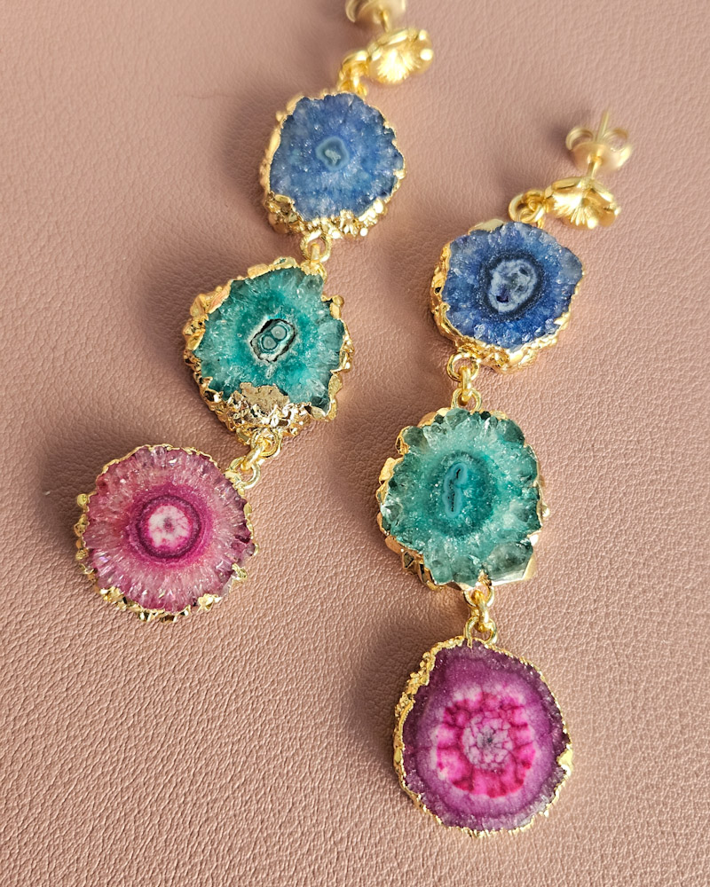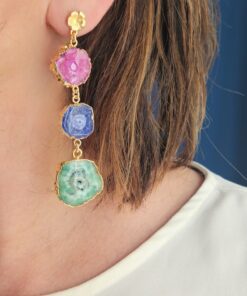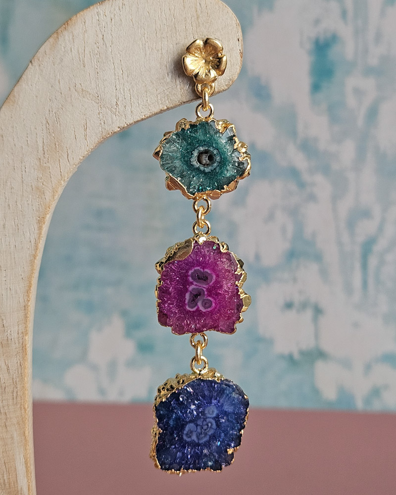 Stand out in style with these fine dangle earrings, crafted from authentic natural geodes in vibrant hues: teal, pink and blue. Each stone is unique, hand-cut to preserve its natural beauty and framed with an elegant gold finish that enhances its irregular contours and crystalline texture.
