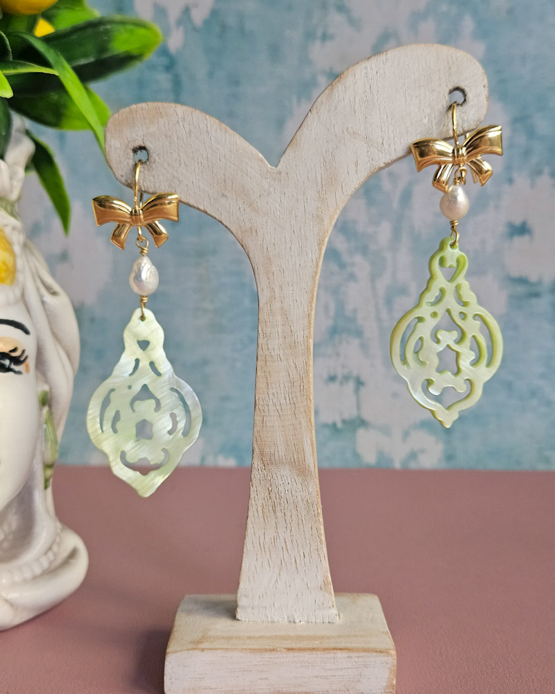 Refined and feminine, these earrings combine the elegance of pearl with the luminosity of carved mother-of-pearl.