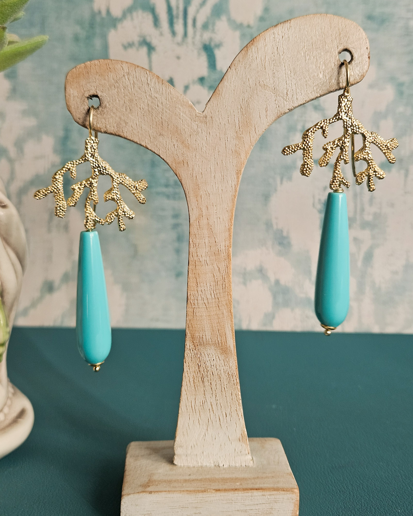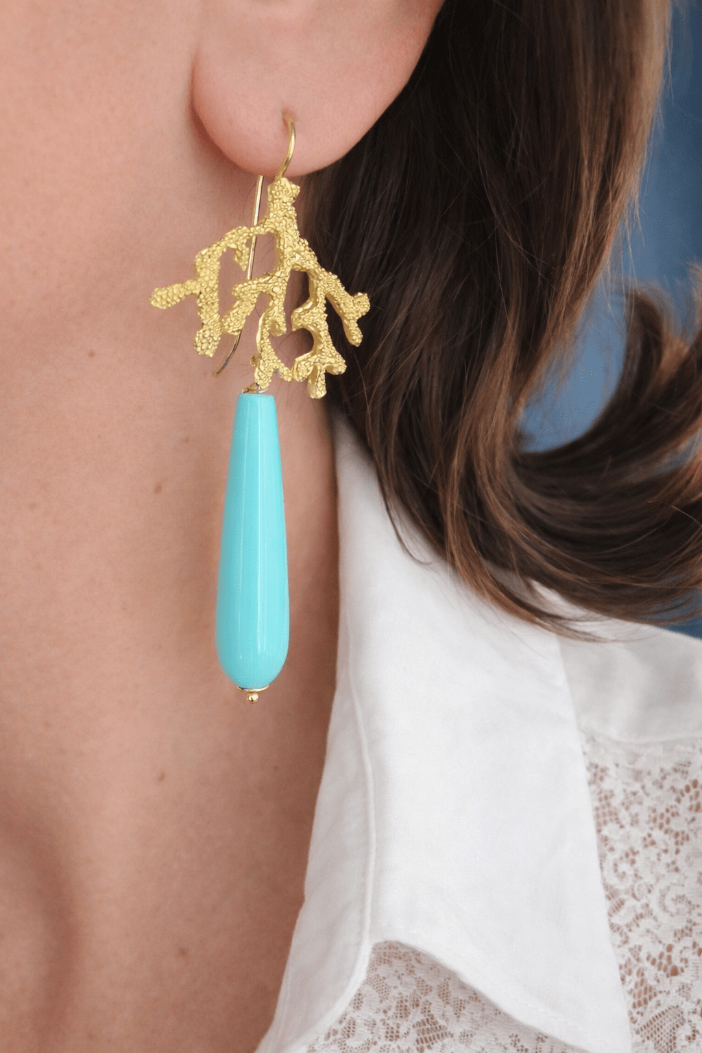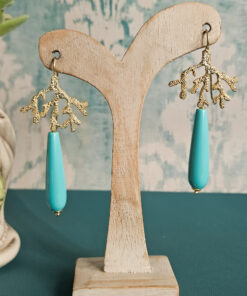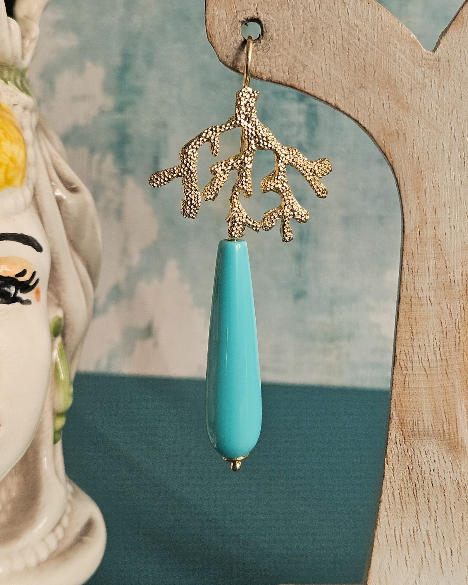 Elegant and luminous, these earrings are made of gold-plated 925 silver with a refined coral branch design. A turquoise paste drop hangs from the pendant, its intense, brilliant color creating a harmonious contrast with the warm tones of the gold. A refined piece of jewelry that combines lightness, color, and character, enhancing the face with a bright and distinctive touch.