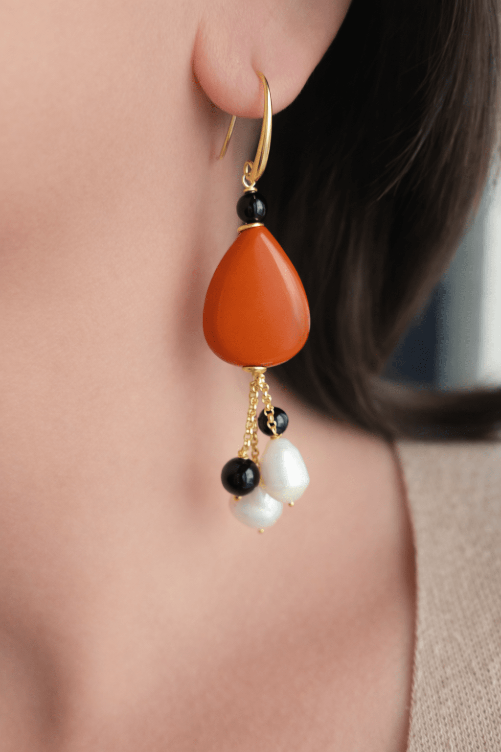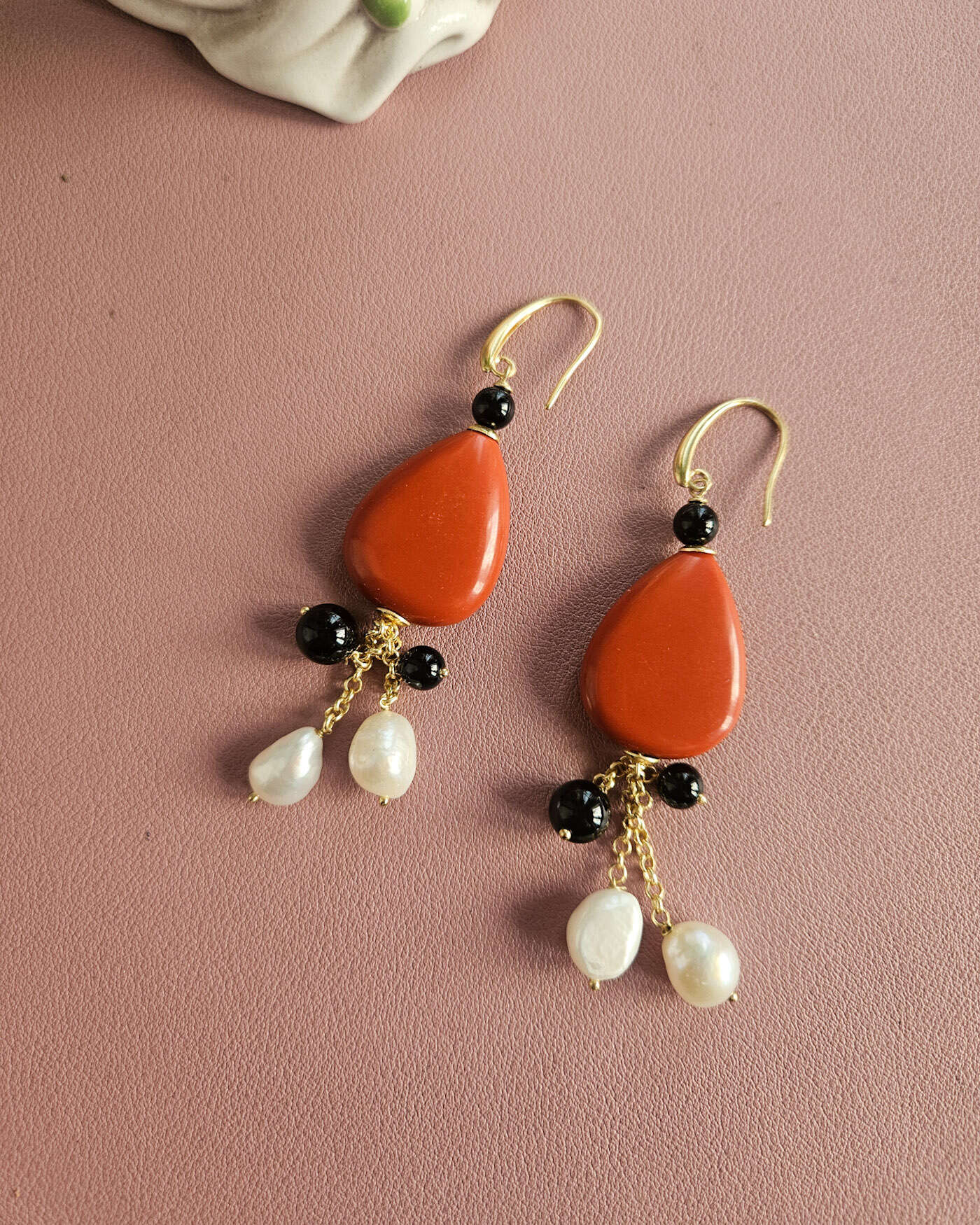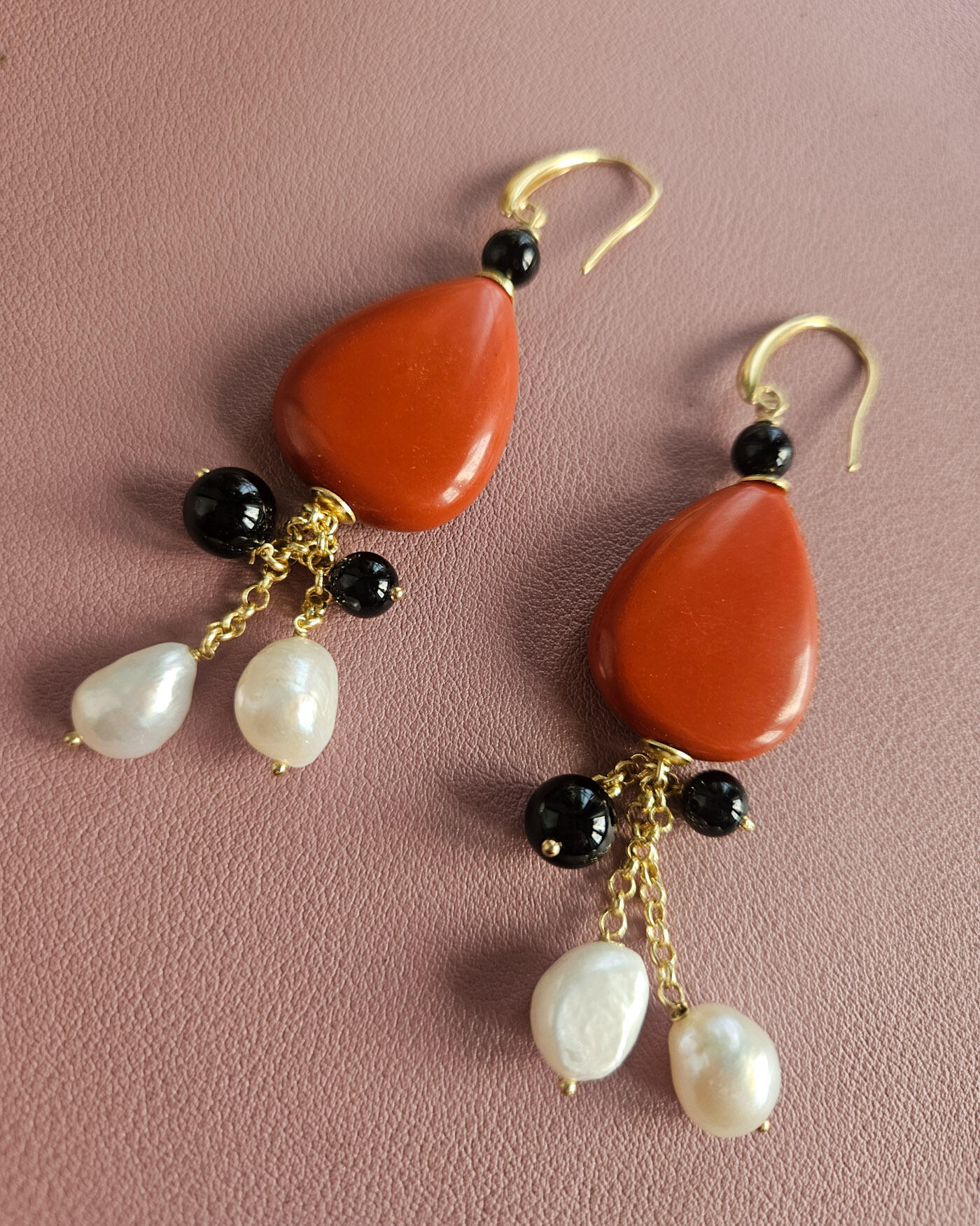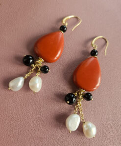Earrings 2 ANIME with Natural Pearls, Red Coral Drops and Black Onyx Stones