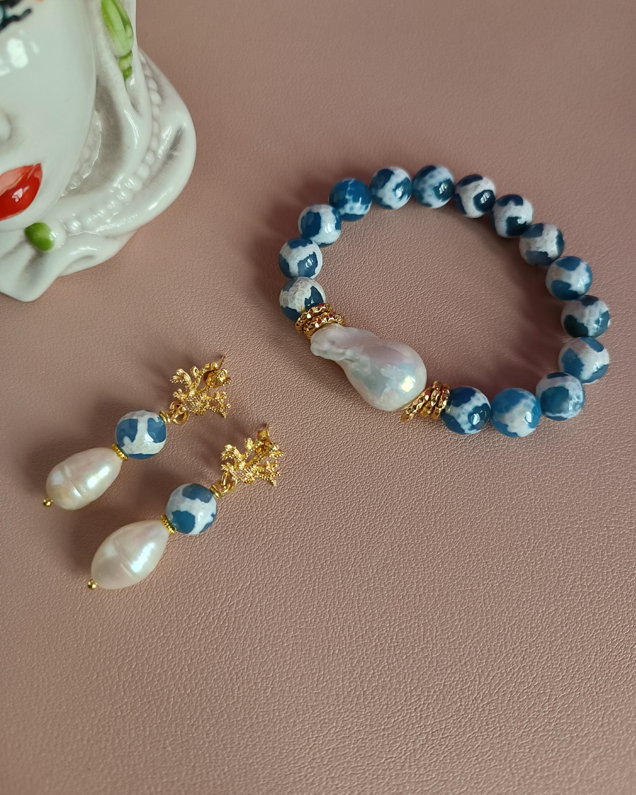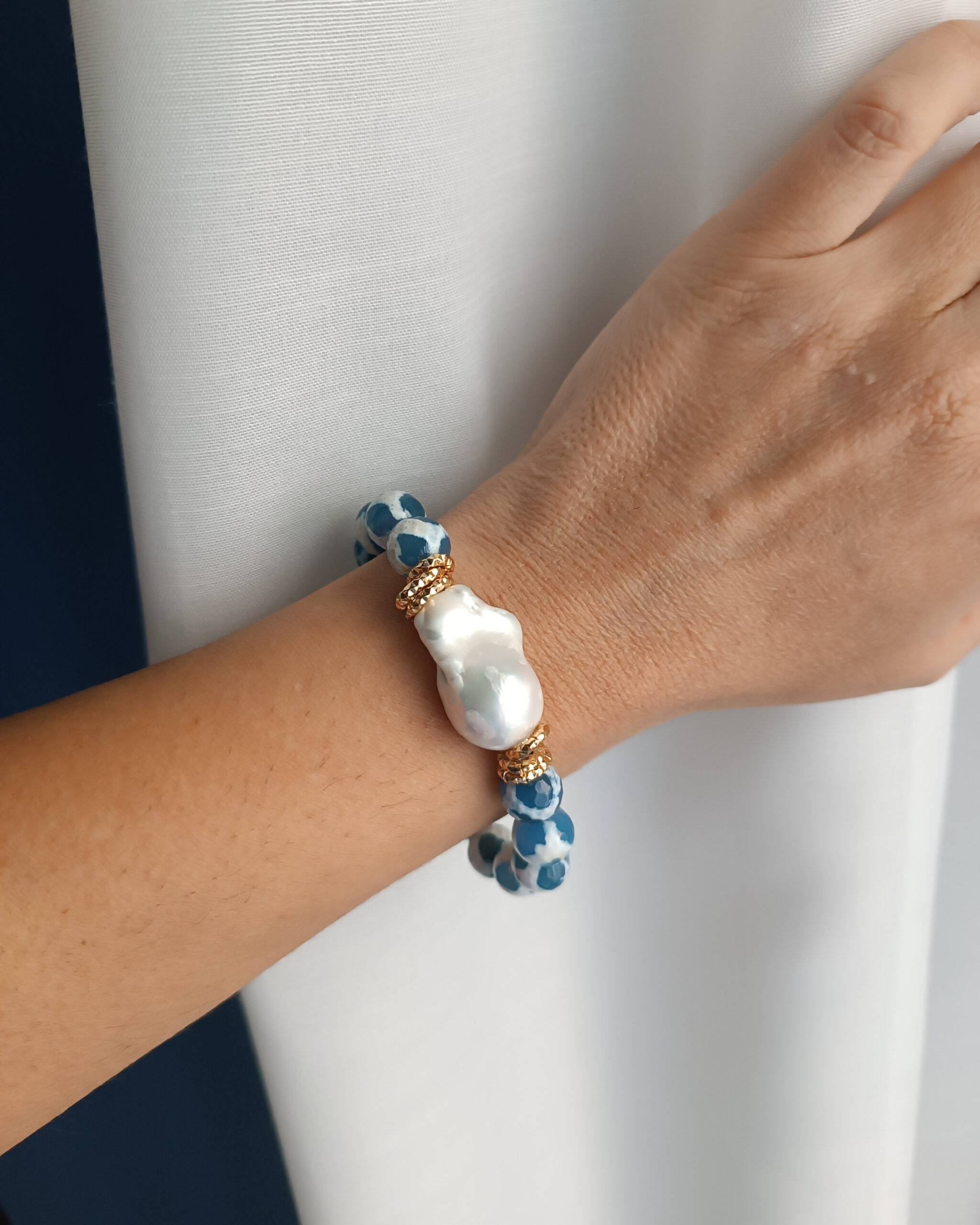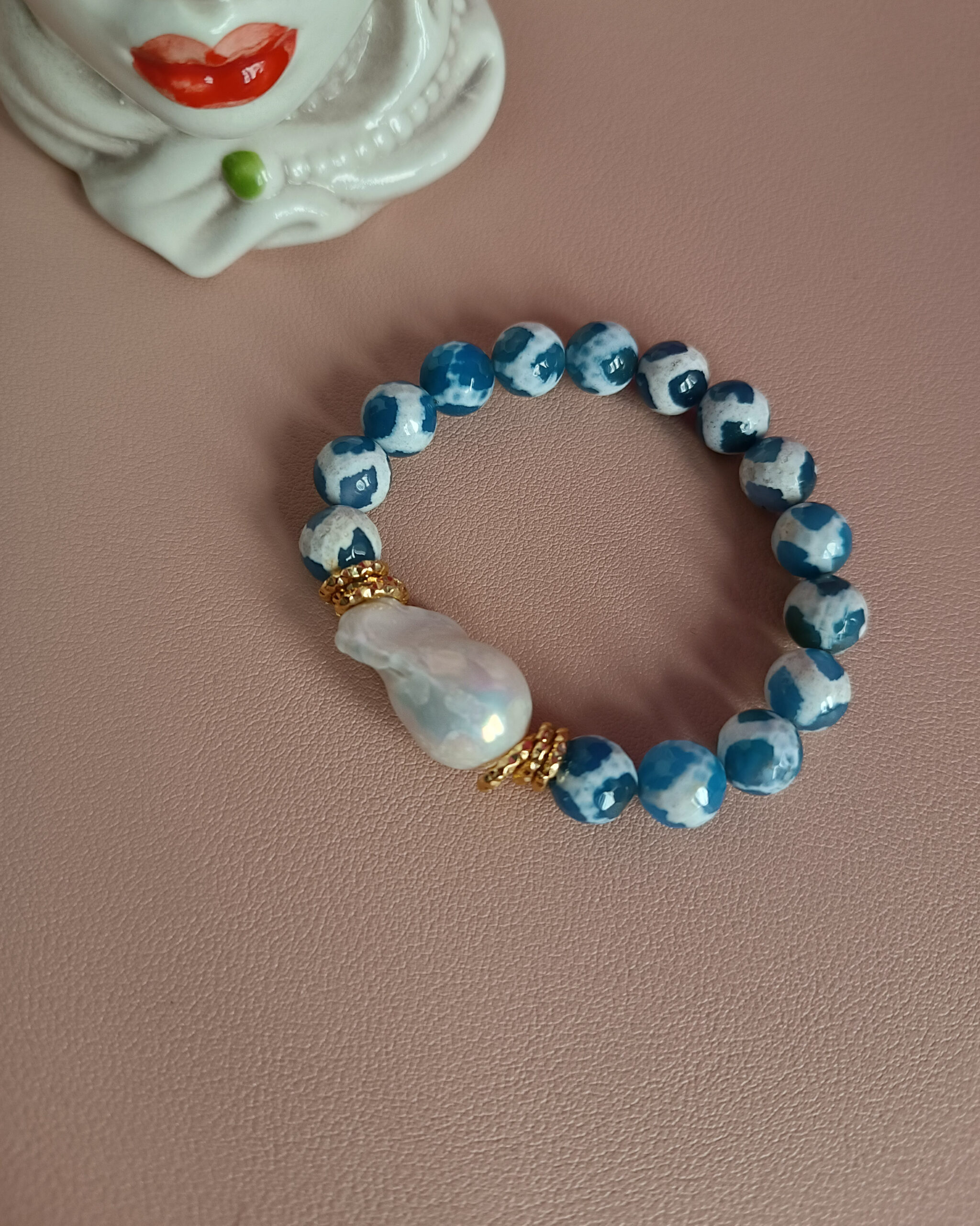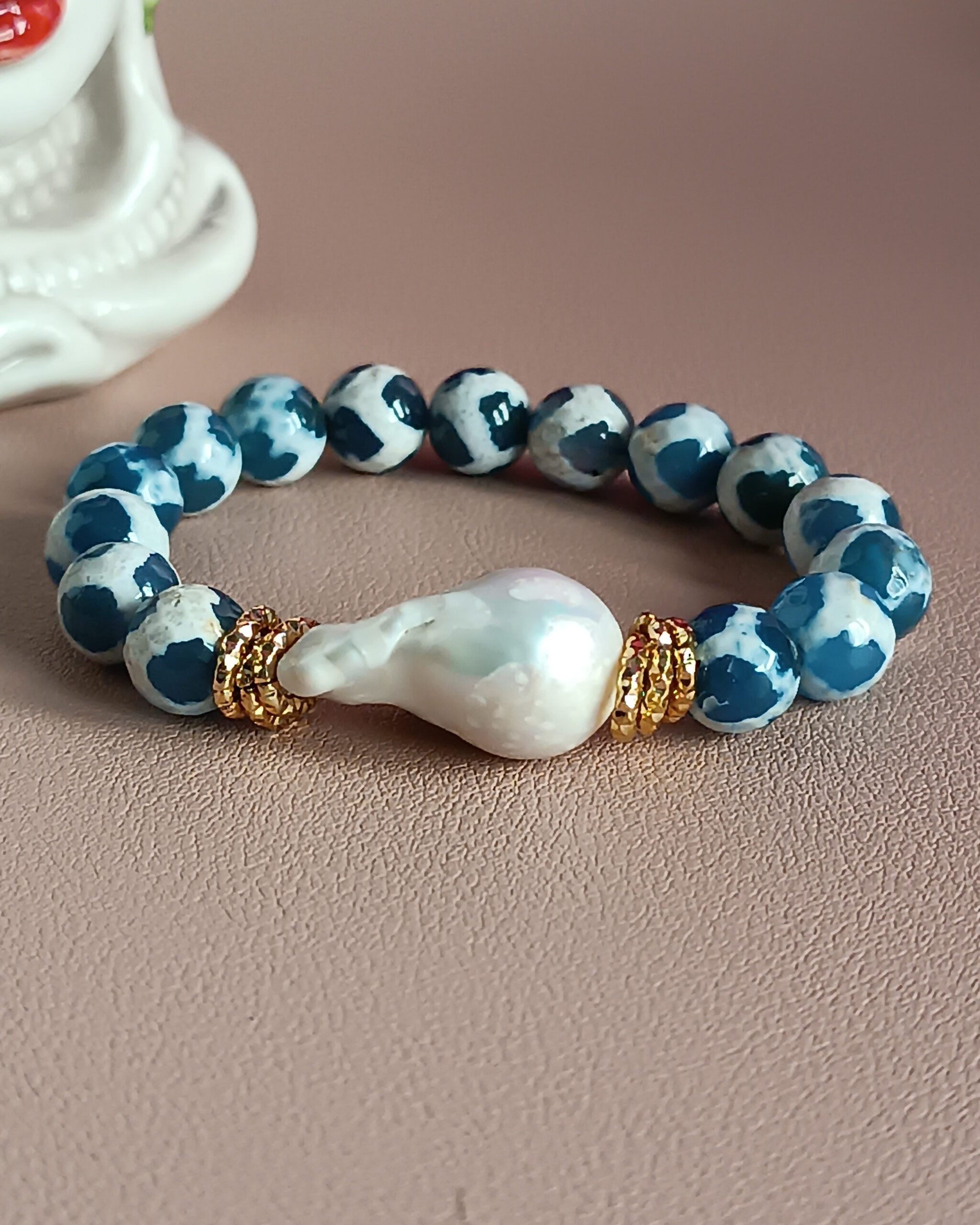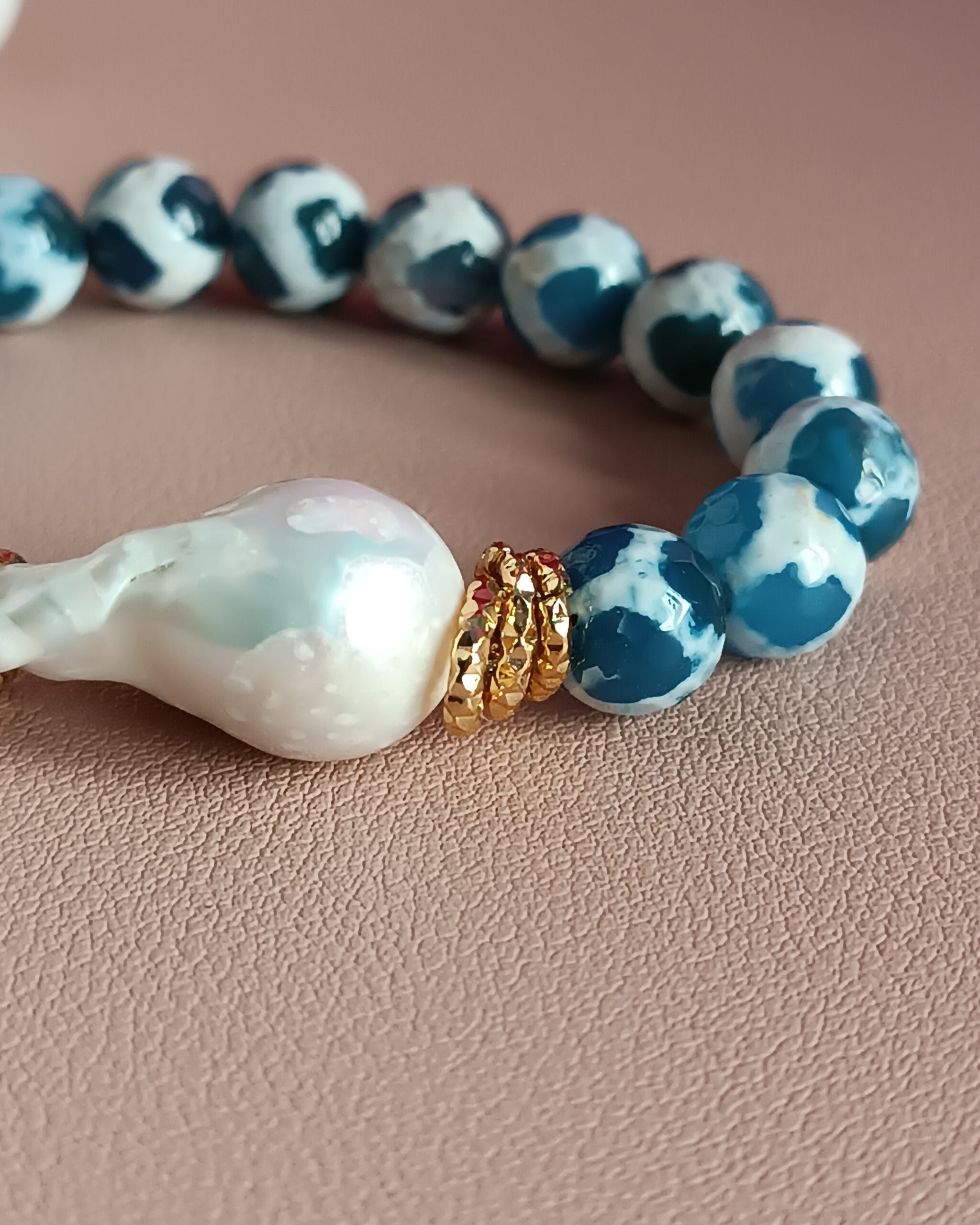 A very refined and simple bracelet made with very special Tibetan Agate and large central baroque pearl.