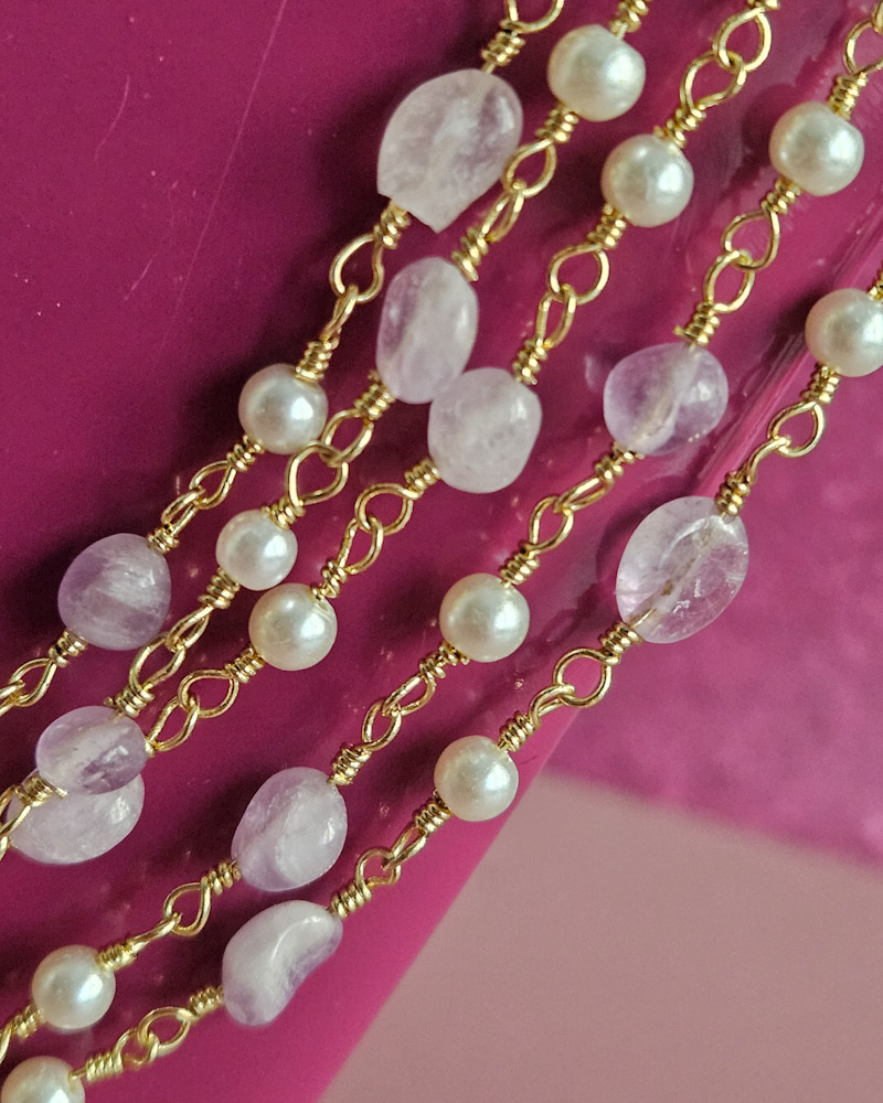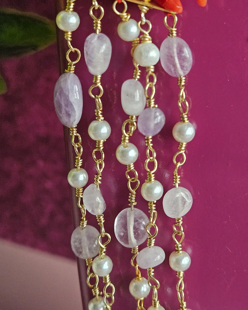 The chain is made of Brass and is interspersed with beads and irregular stones of natural Amethyst stones.