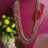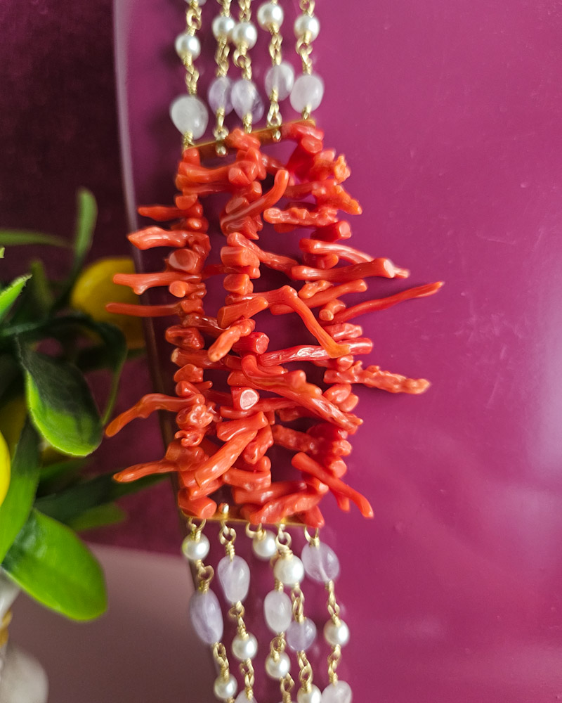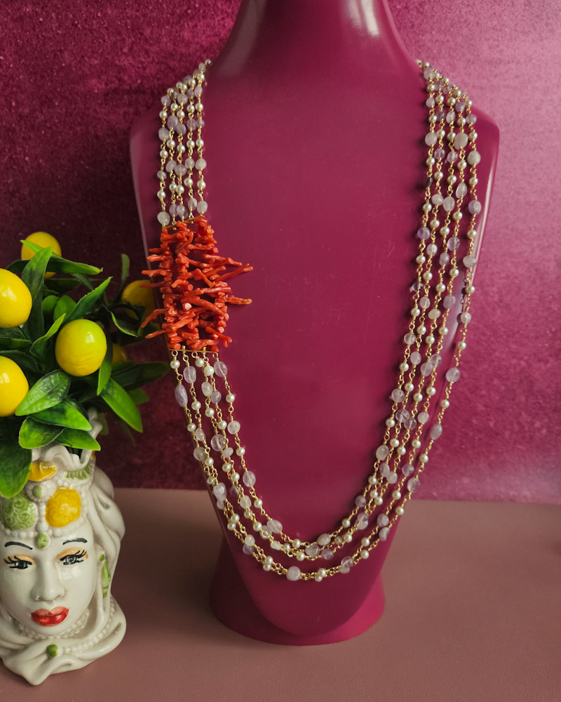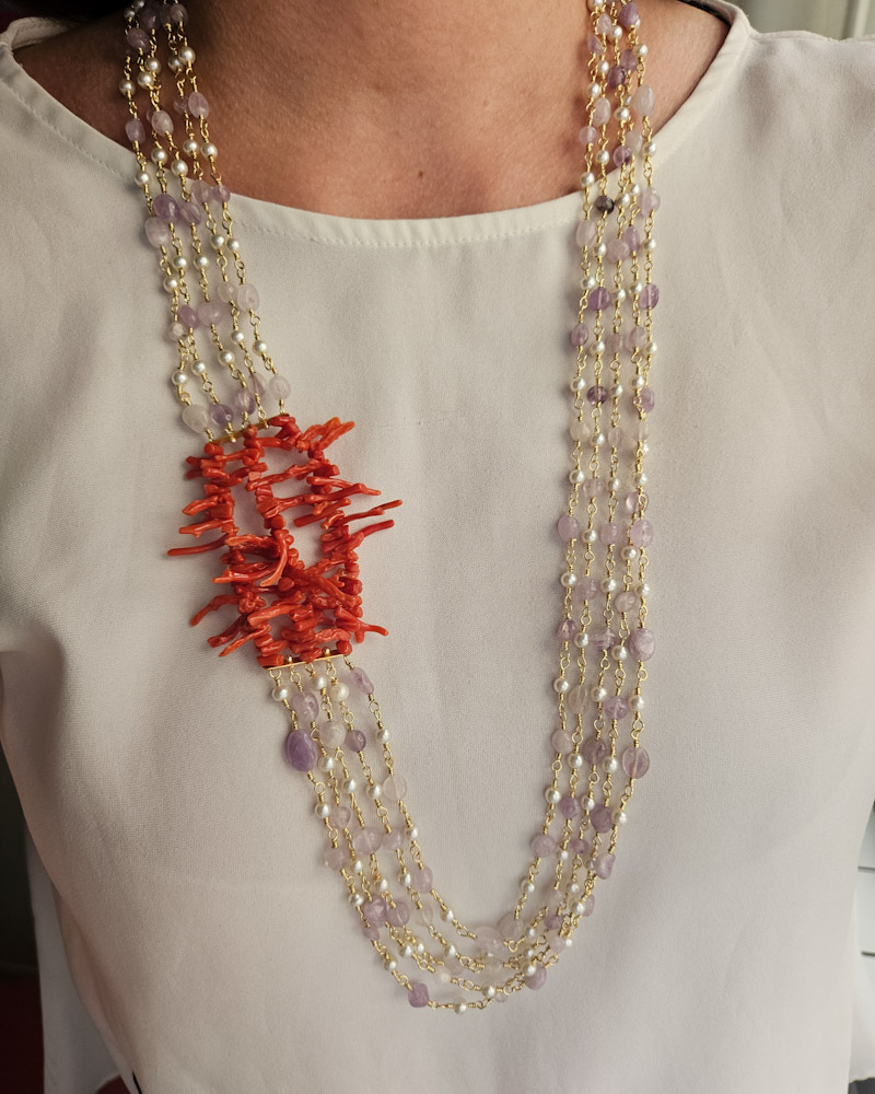 Five Strand Necklace with Amethyst Stones, Pearls and Red Coral Branch Cluster
