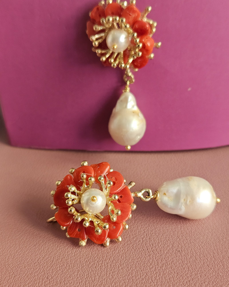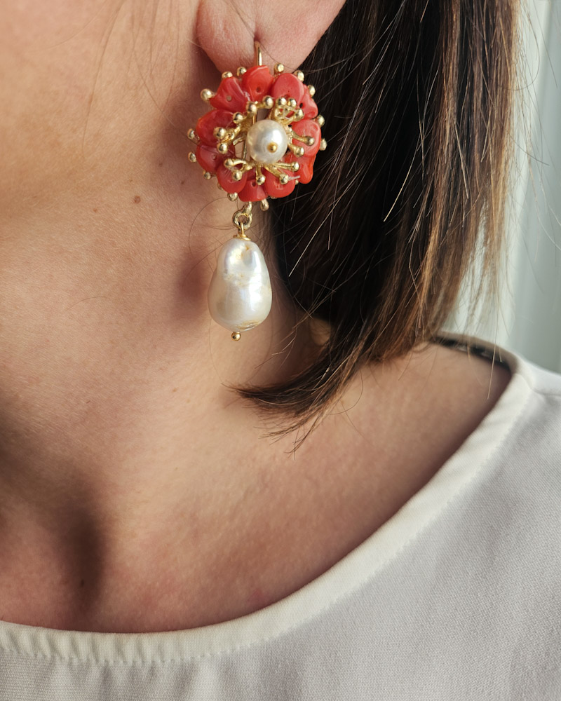 Flower Earrings with Baroque Pearls and Red Coral Chips