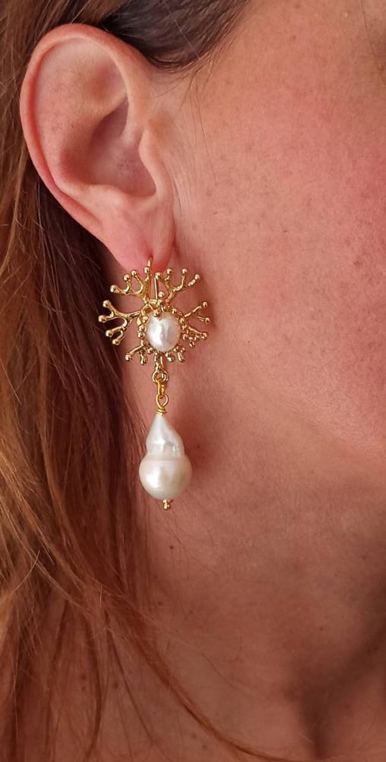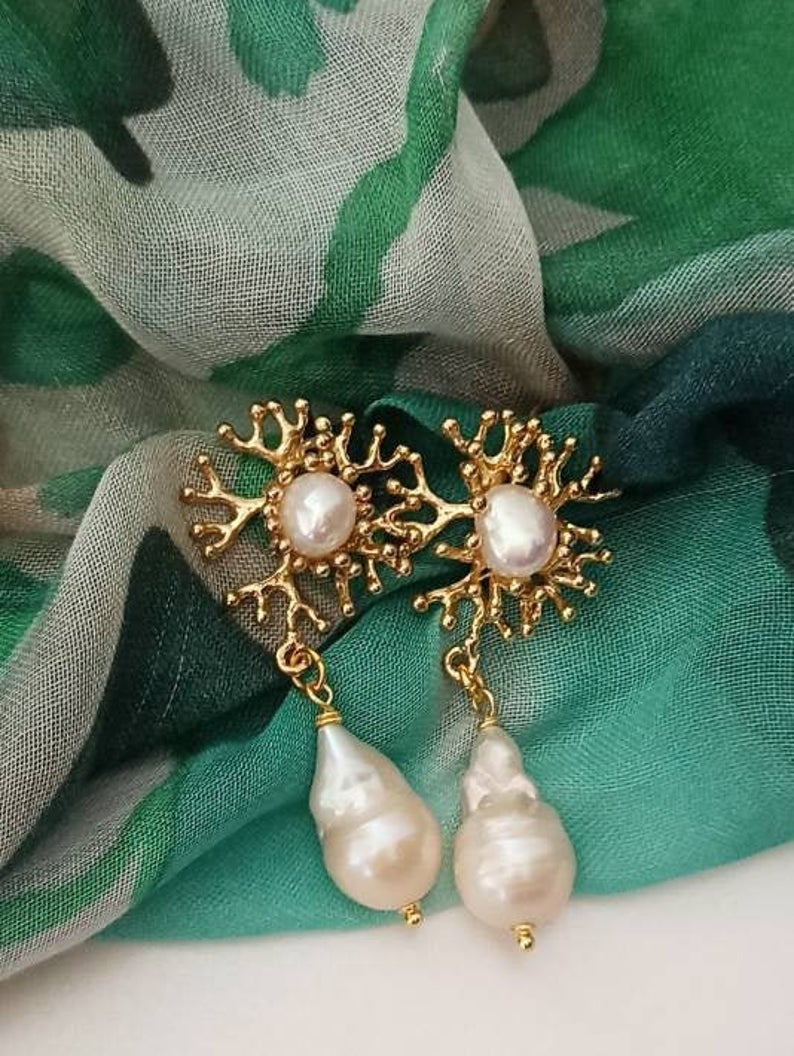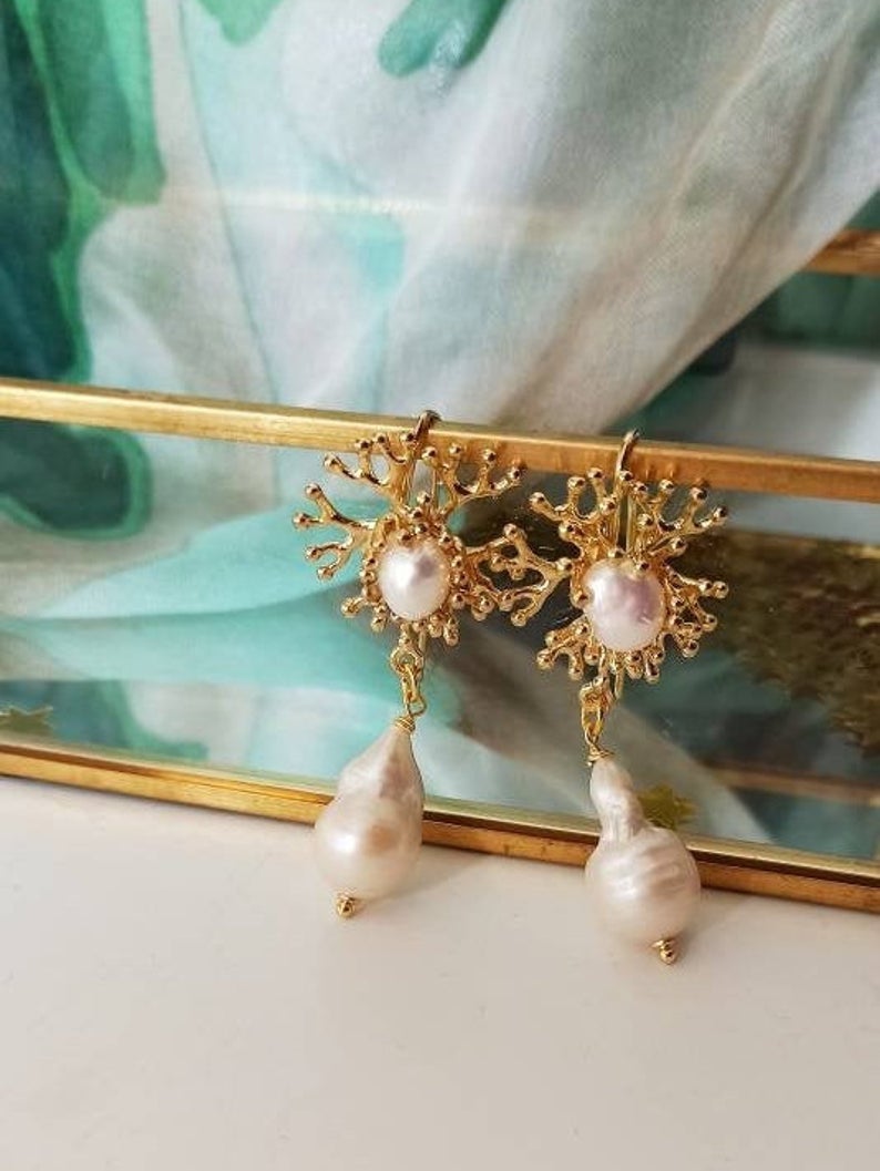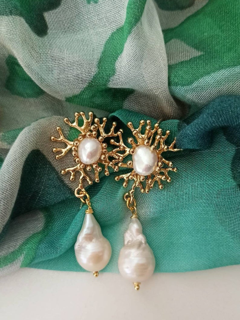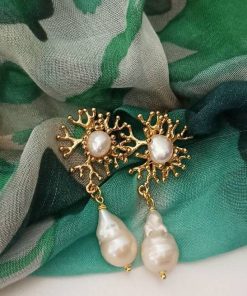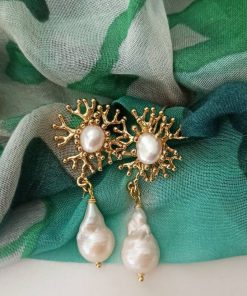 – Pearl cabochon earrings, branch coral shape.
