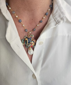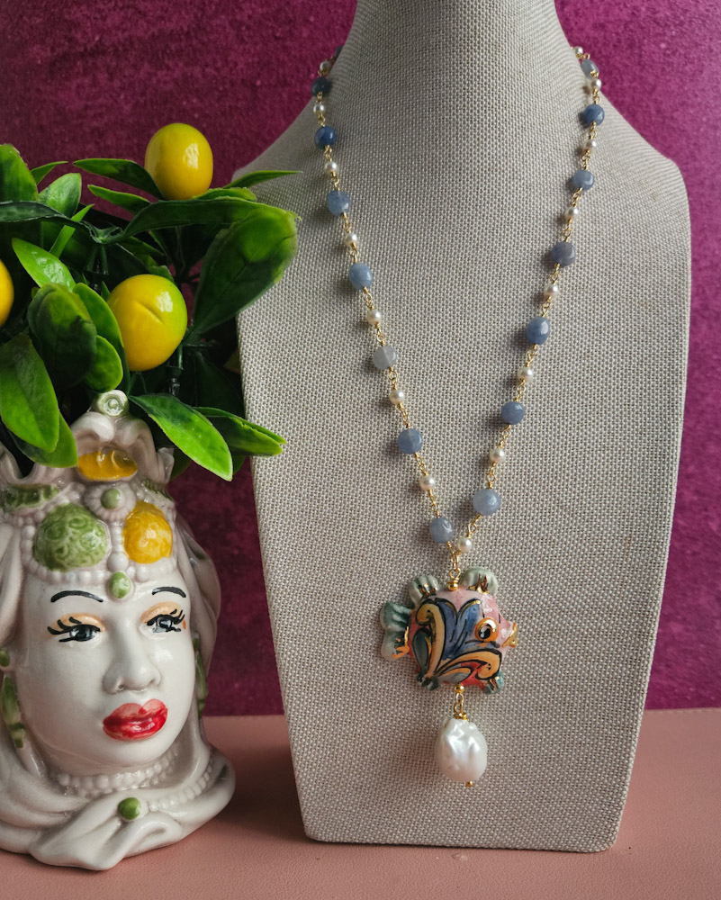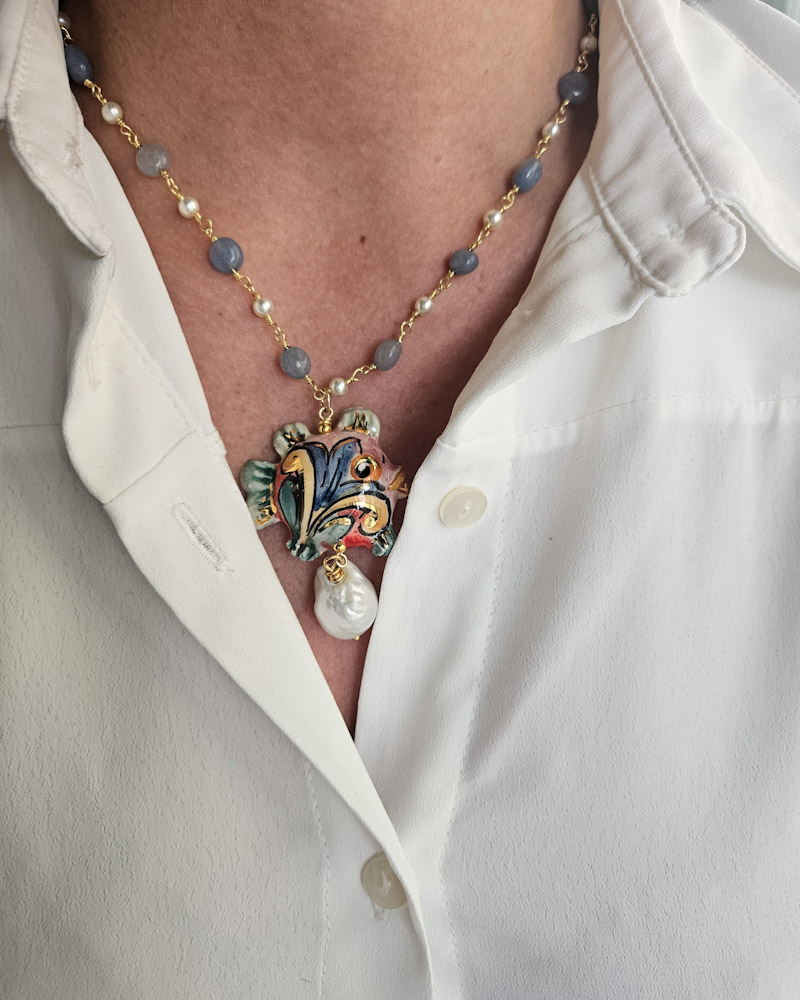 Gold Chain Necklace with Chalcedony, Pearls and Sicily Ceramic Fish