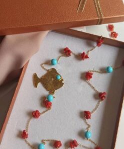 Gold Chain Necklace with Turquoise Paste, Red Coral and Brass Fish