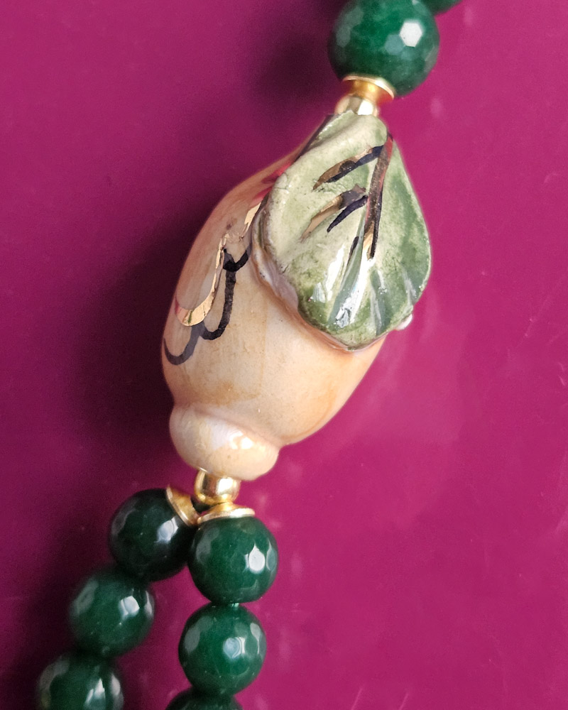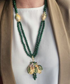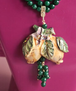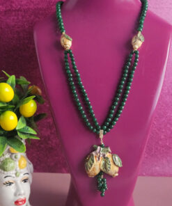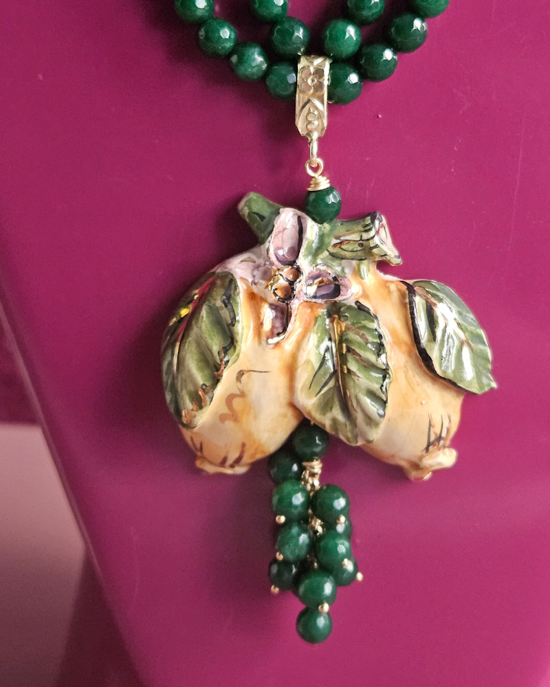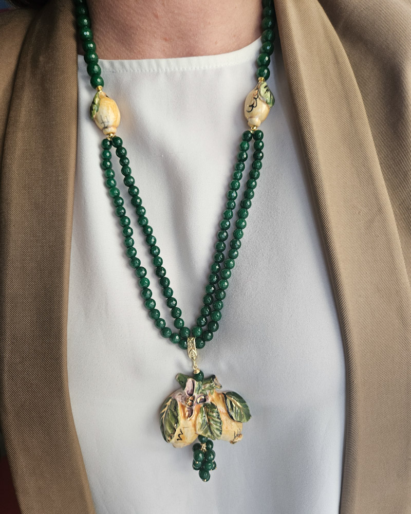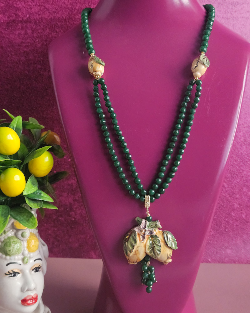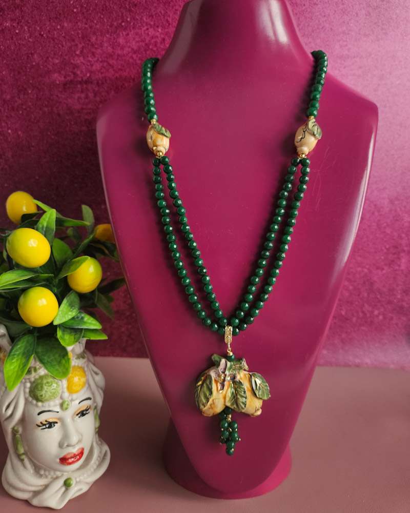 An all-Sicilian style for this wonderful necklace made with green stones, a stone of innate elegance, and lemon ceramics, undisputed symbol of Sicilianity.
