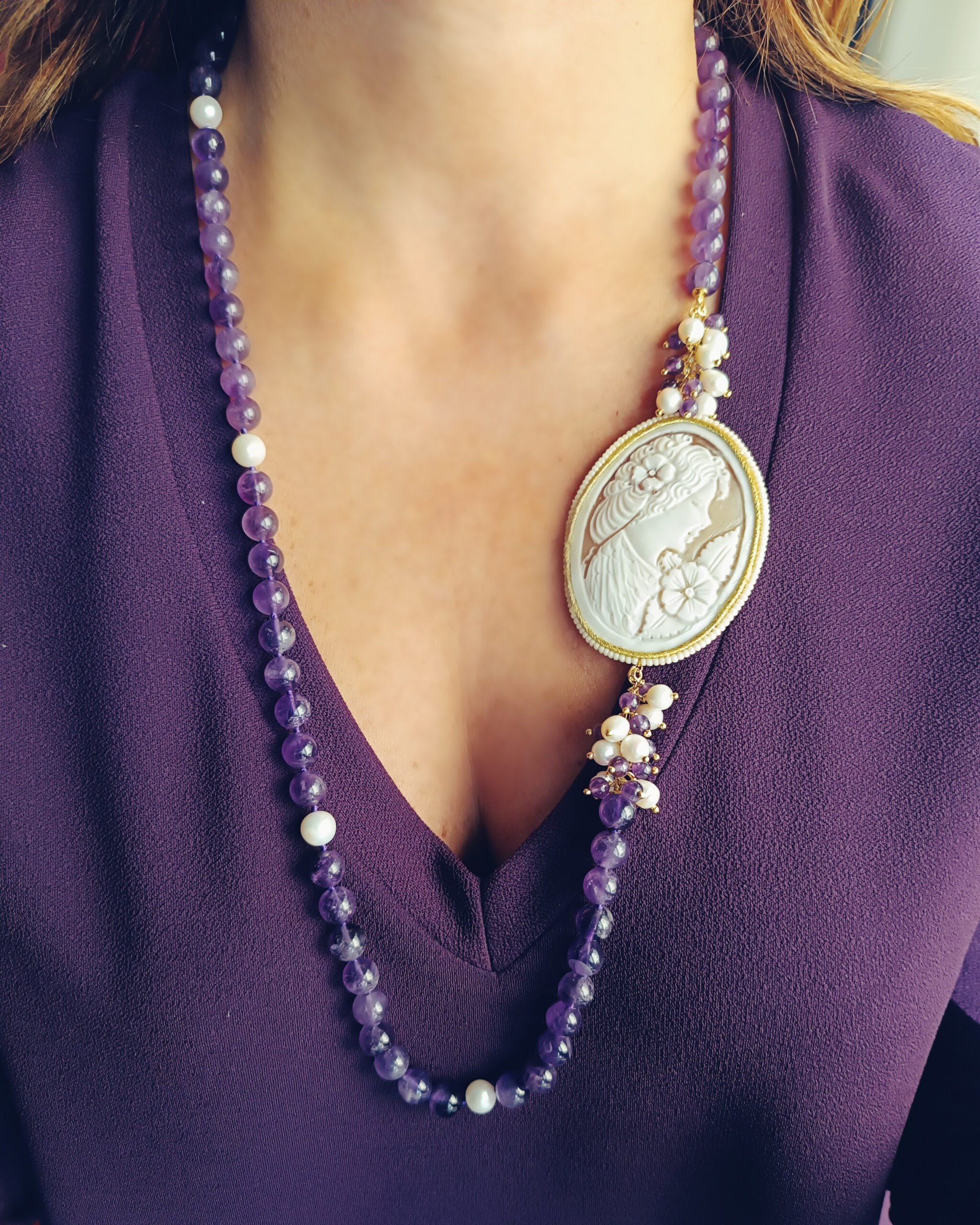 A very refined necklace made from natural Amethyst and authentic cameo from Torre del Greco.