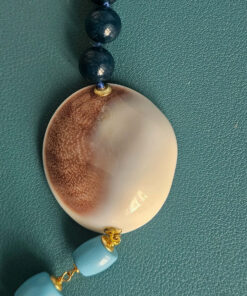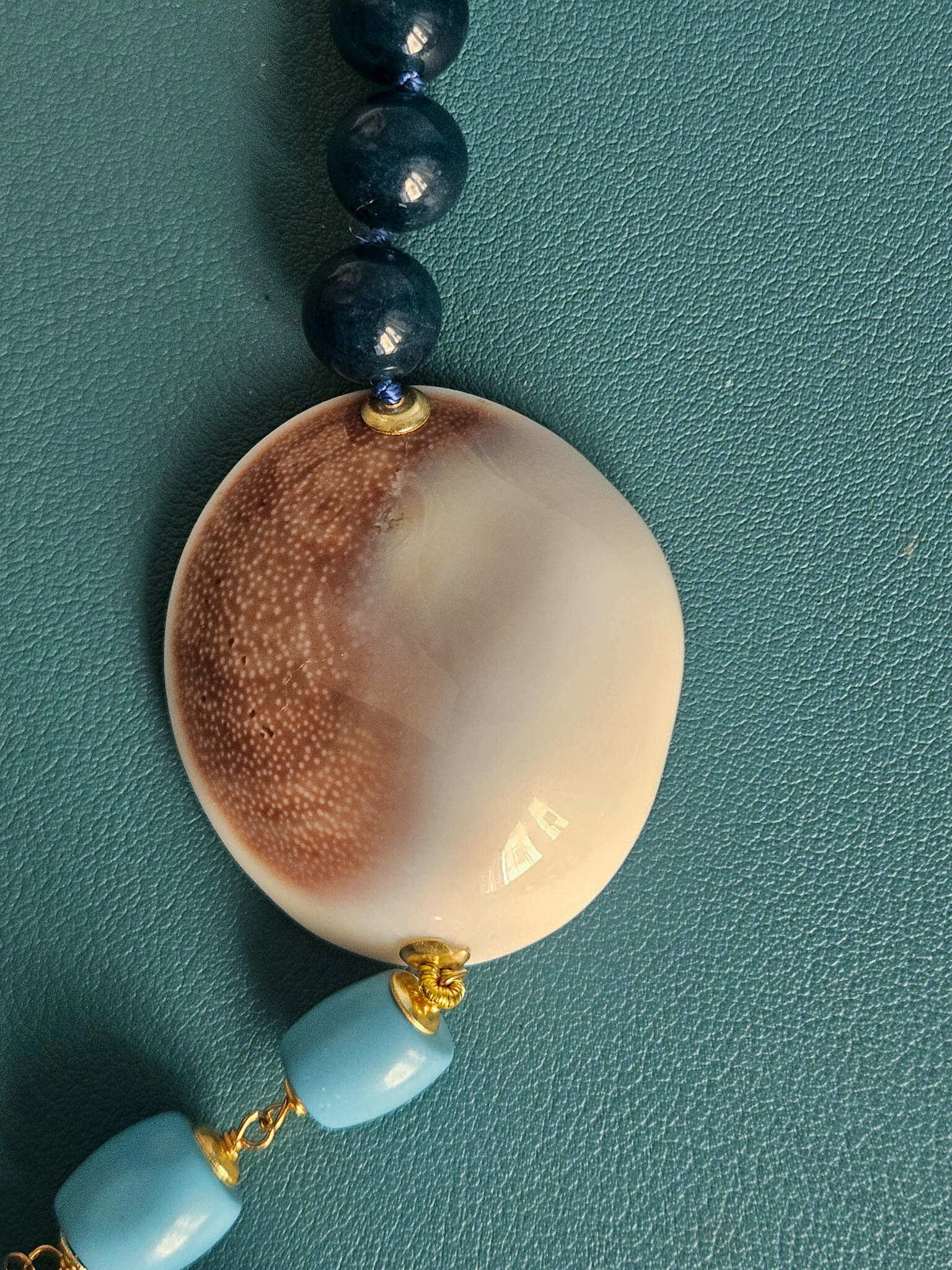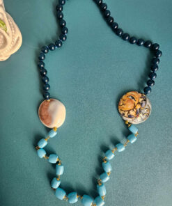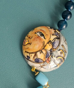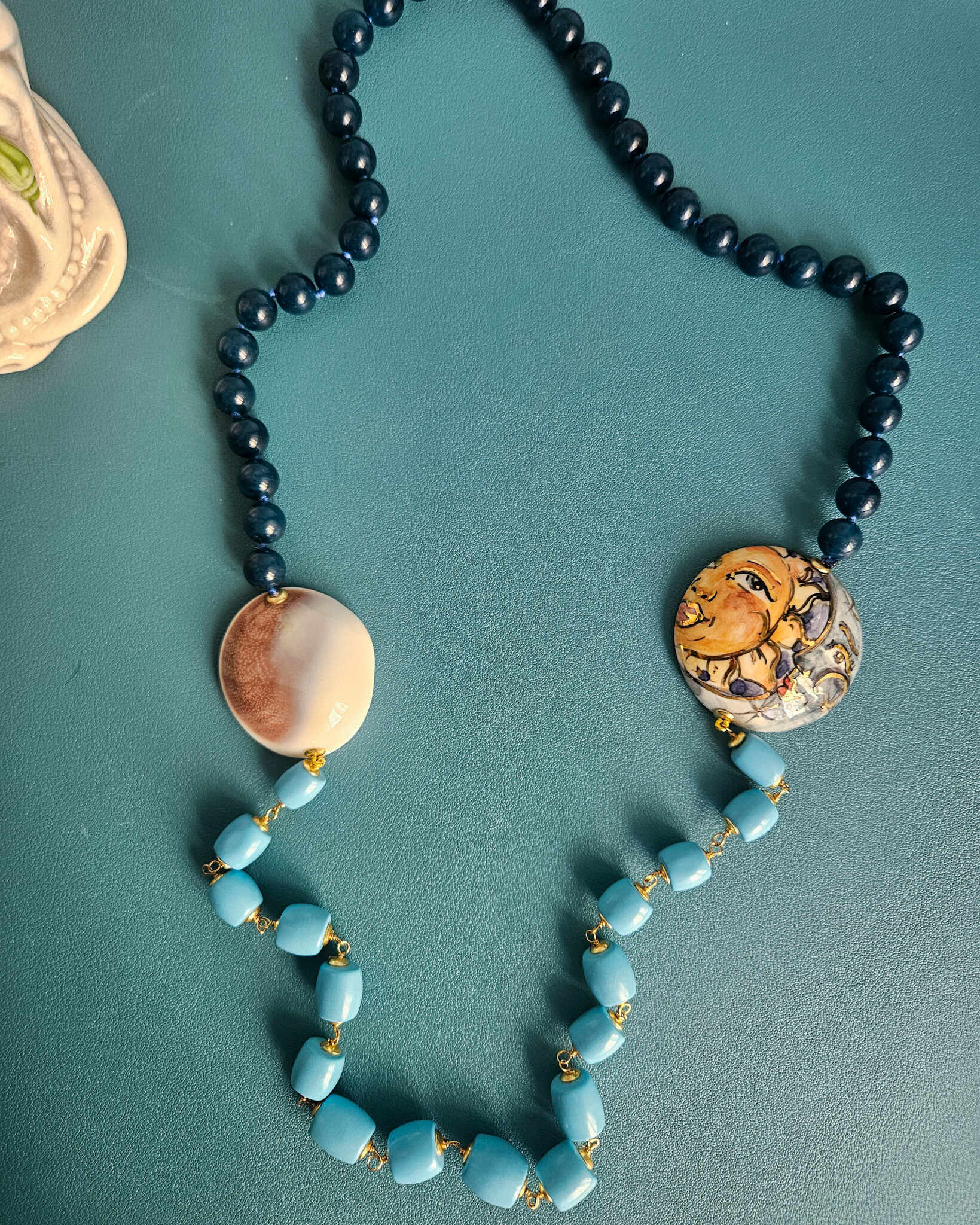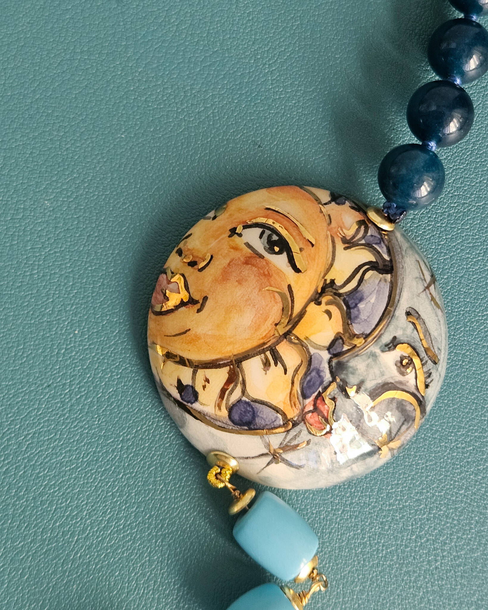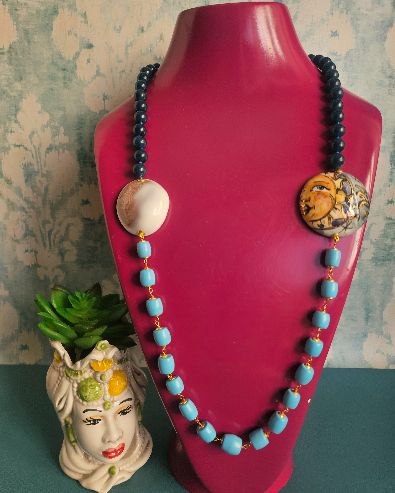 A statement necklace, designed for those who choose jewelry with presence and recognizable materials. The turquoise-blue jade beads create a full, luminous line, while the Caltagirone ceramic, with hand-painted sun and moon, adds a unique focal point. The natural shell completes the ensemble with a textured, authentic touch.