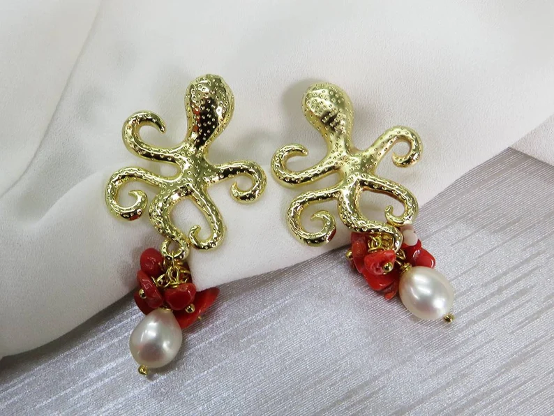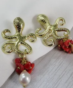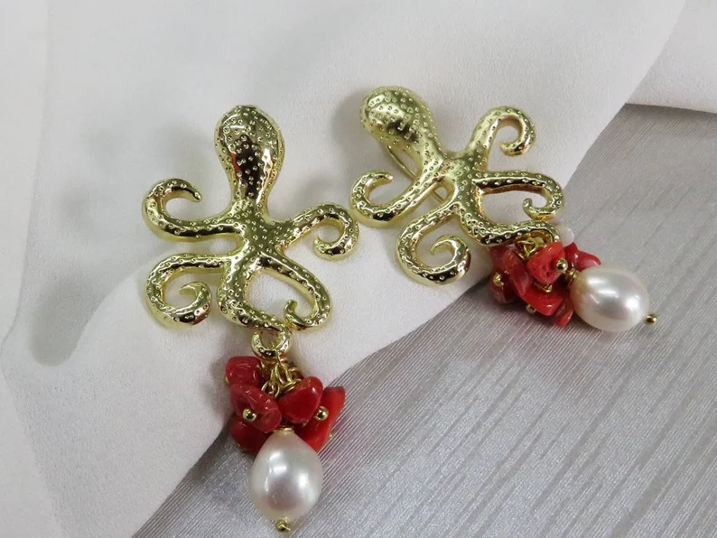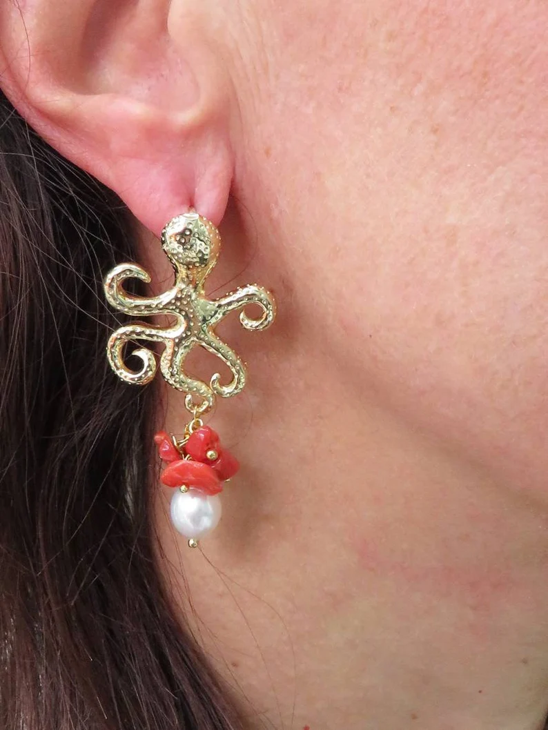Octopus Earrings with Freshwater Pearls and Red Coral Chips