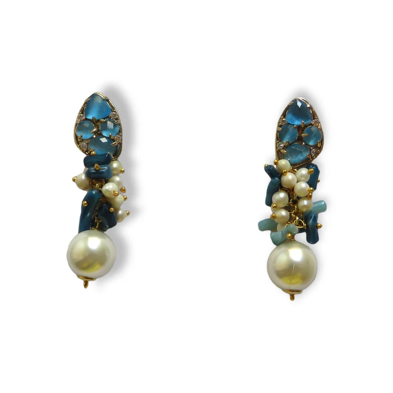 Pearl Drop Earrings with Blue Bamboo Coral Branches