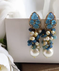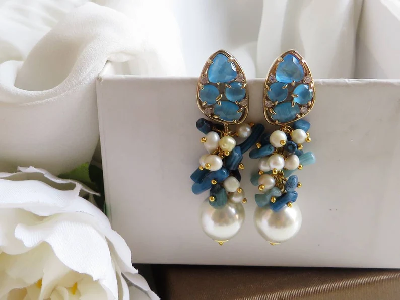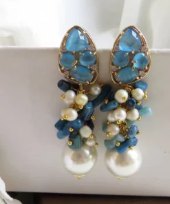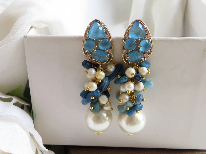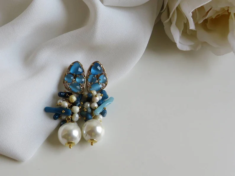 Elegant earrings with Mallorca pearls and blue bamboo coral branches. Please note that the Mallorca pearls are stones coated with mother-of-pearl. You will notice that they do not have any defects on the surface, which is the hallmark of real pearls.