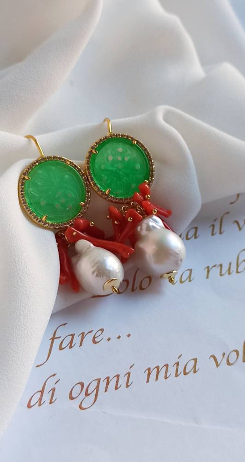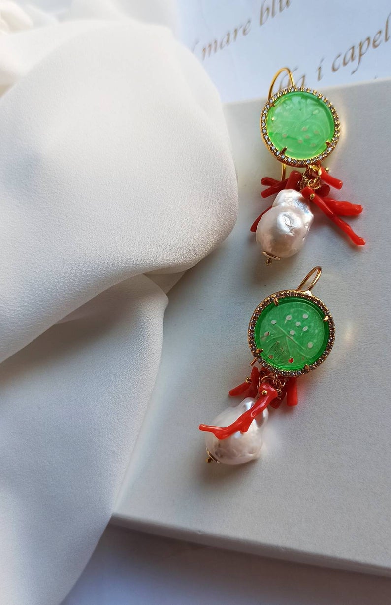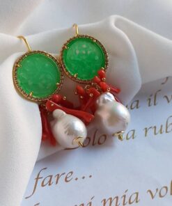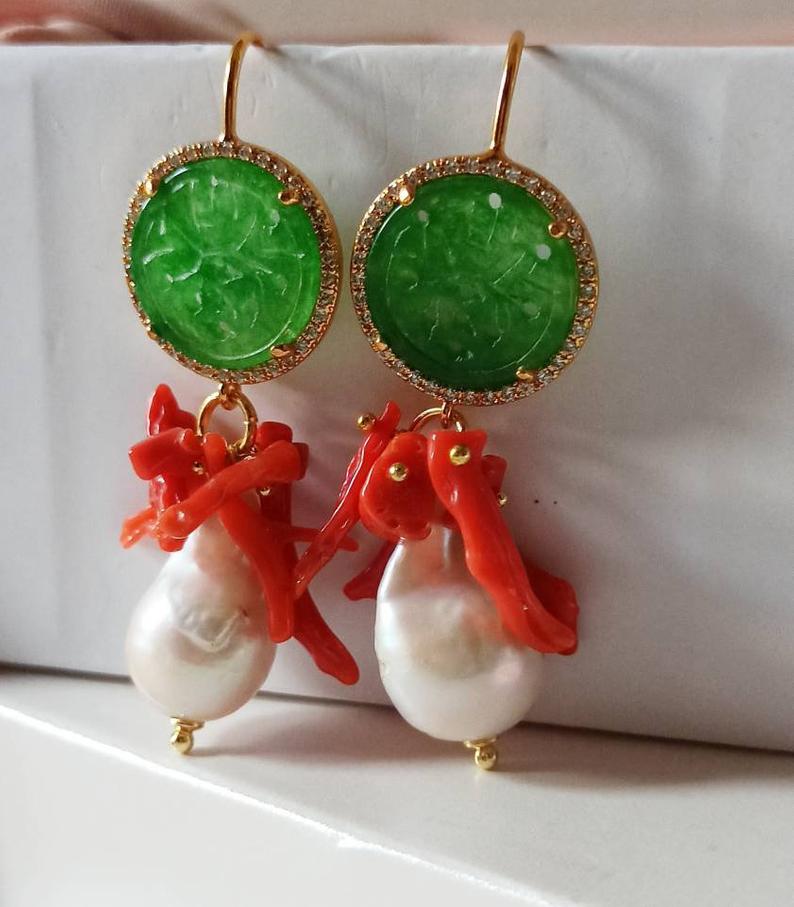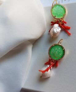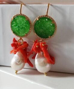 Pearl Drop Earrings with Green Jade Stones and Red Coral Branches
