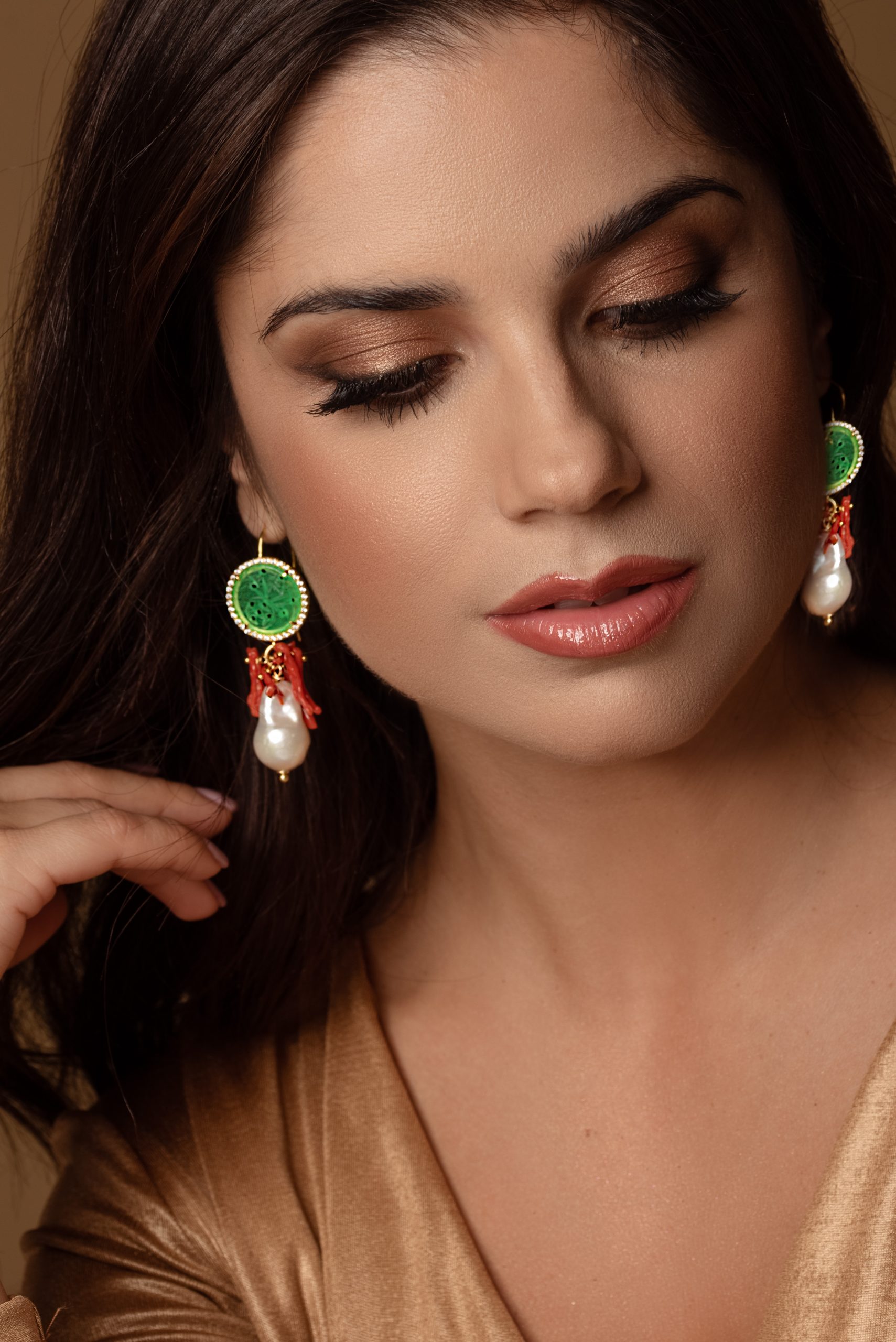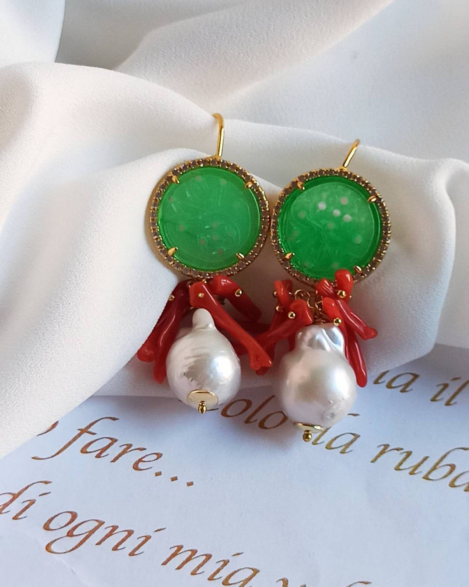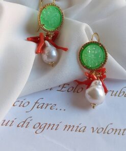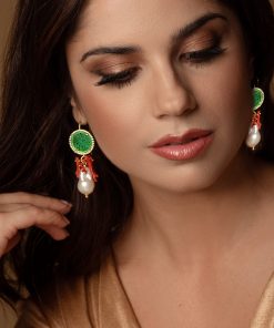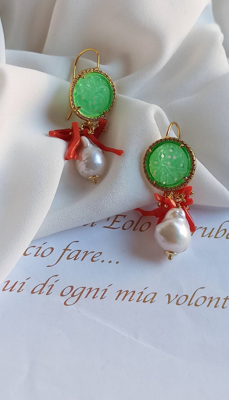 Pearl Drop Earrings with Green Jade Stones and Red Coral Branches