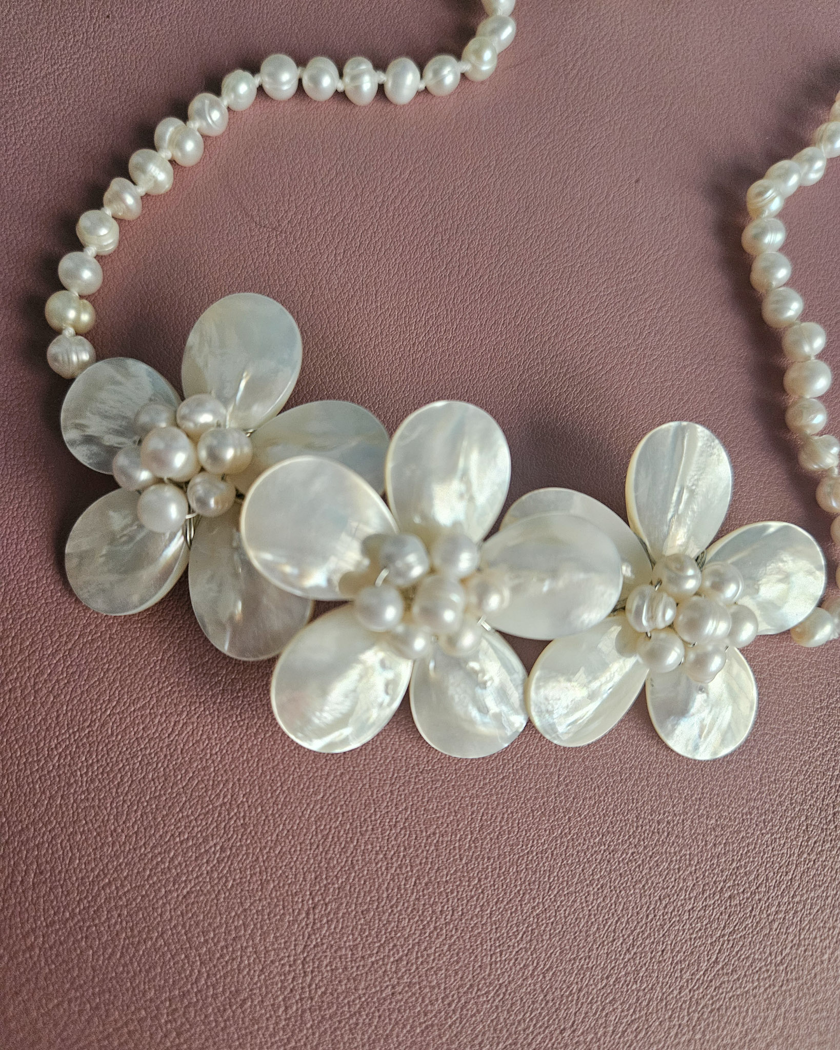 Pearl Necklace with Mother of Pearl Flowers